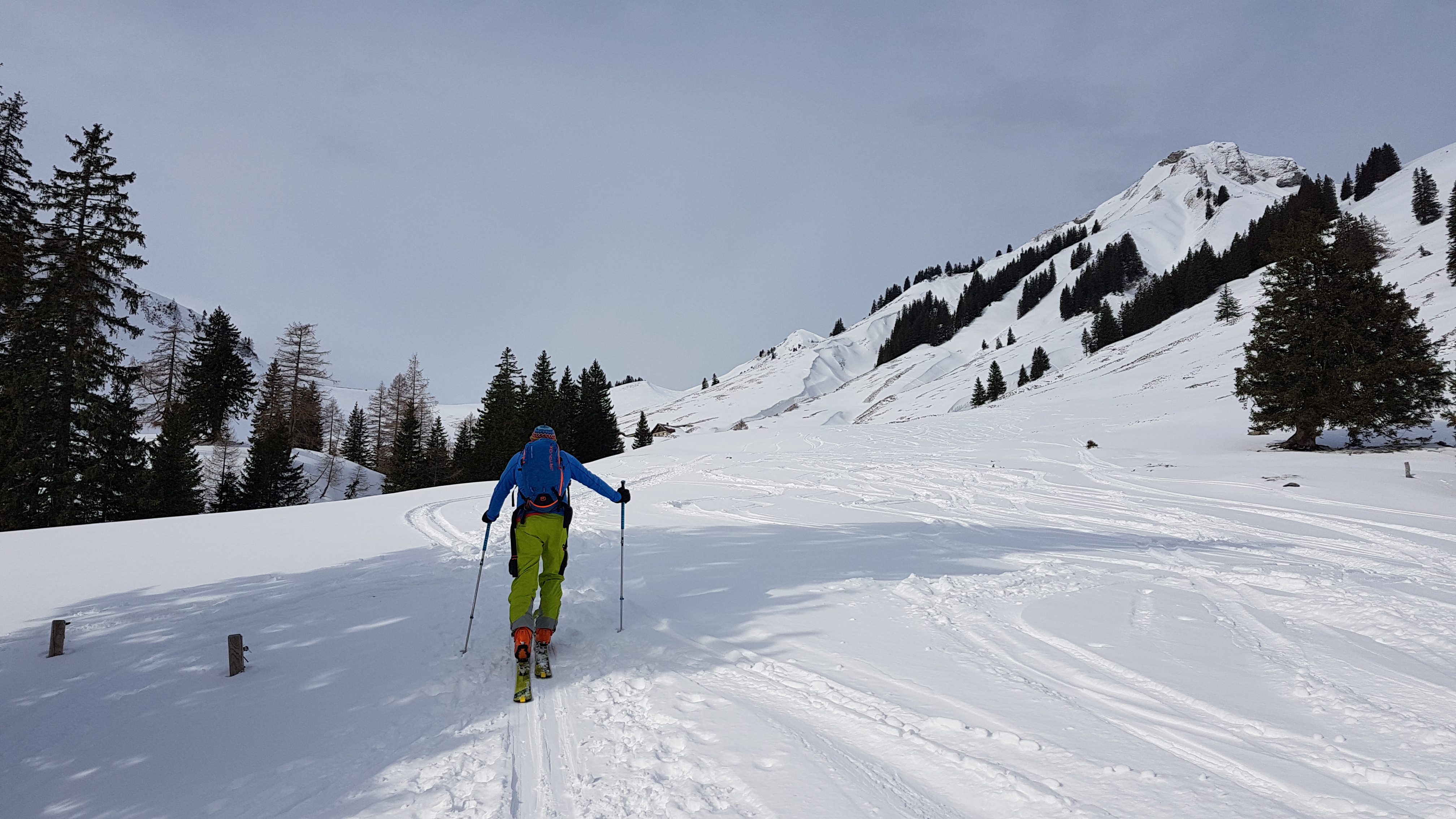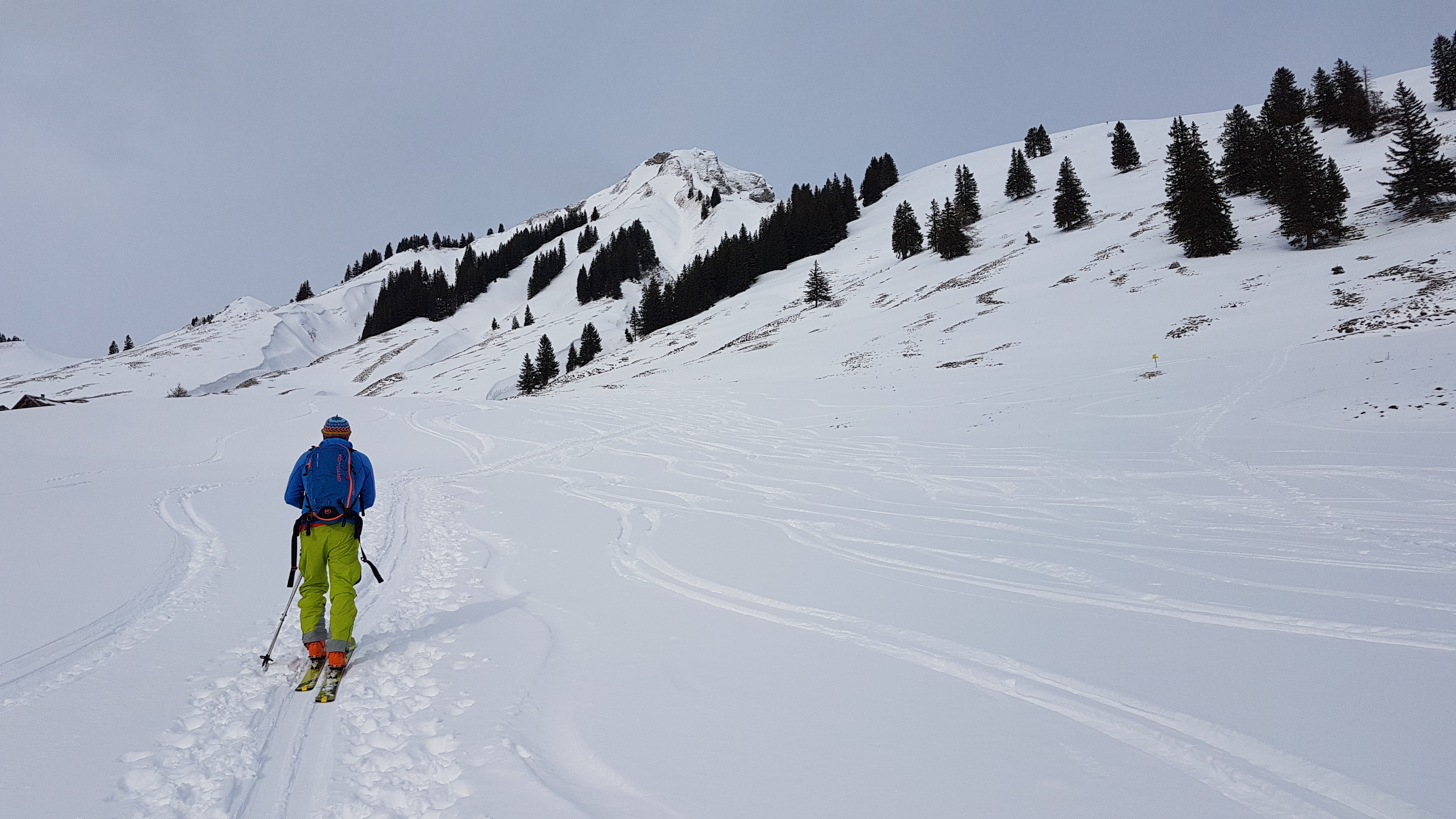 Tourenverhältnisse: Wir waren früh dran und beim Aufstieg waren die Verhältnisse noch perfekt. Unten ca. 20 cm pulvriger Neuschnee, oben nur noch 5 bis 10 cm (den Rest hatte es oben wohl verweht) - jeweils auf harter Unterlage. Doch noch ehe wir abfahren konnten, kam die Warmfront von Westeuropa-Tief CHARLOTTE und hat sehr milde und wohl auch feuchte Luft mitgebracht. Innerhalb kürzester Zeit war der Schnee verdorben. Teilweise hat es brutal gebremst, dann ging es wieder ein Stück ganz gut, aber vom feinen Pulver, wie wir ihn noch im Aufstieg hatten, war nichts mehr zu spüren.