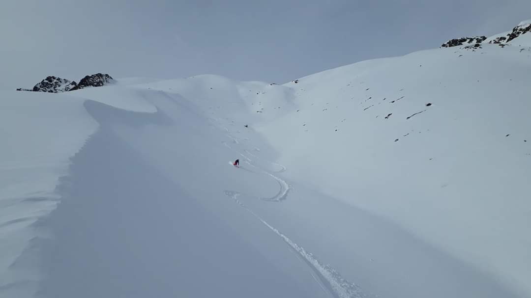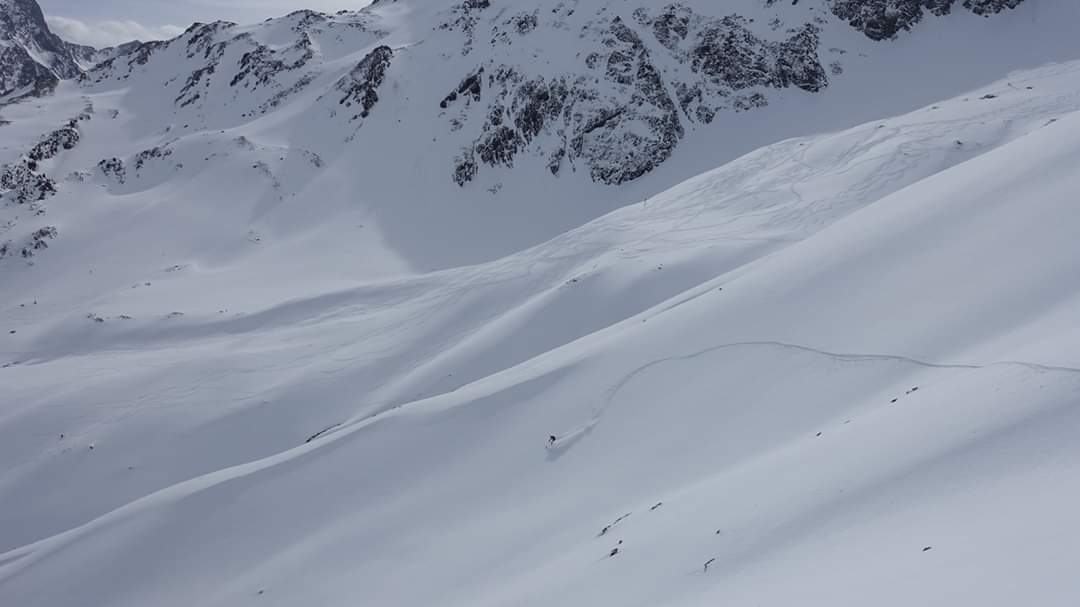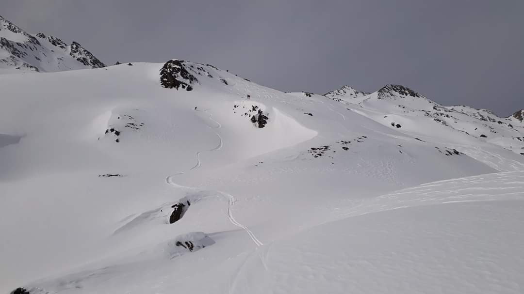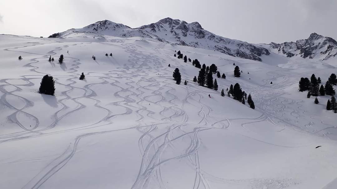 Tourenverhältnisse: Schöner Pulver , z.T. leichter Stich, weiter unten hat man bei Schwüngen z.T. die harte Unterlage durch den Pulver durch gespürt.Es hat bis auf den untersten Hang richtig Spaß gemacht.