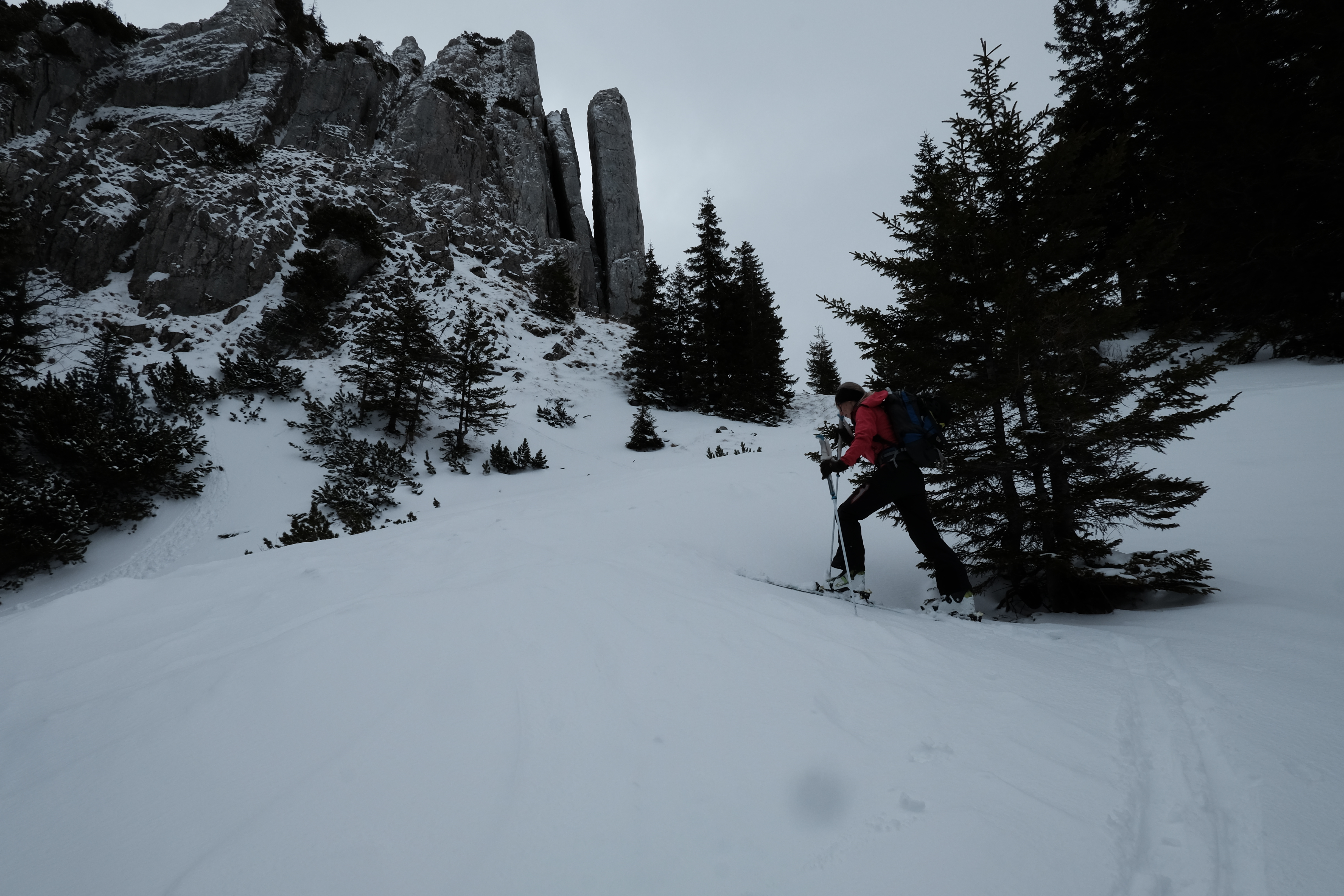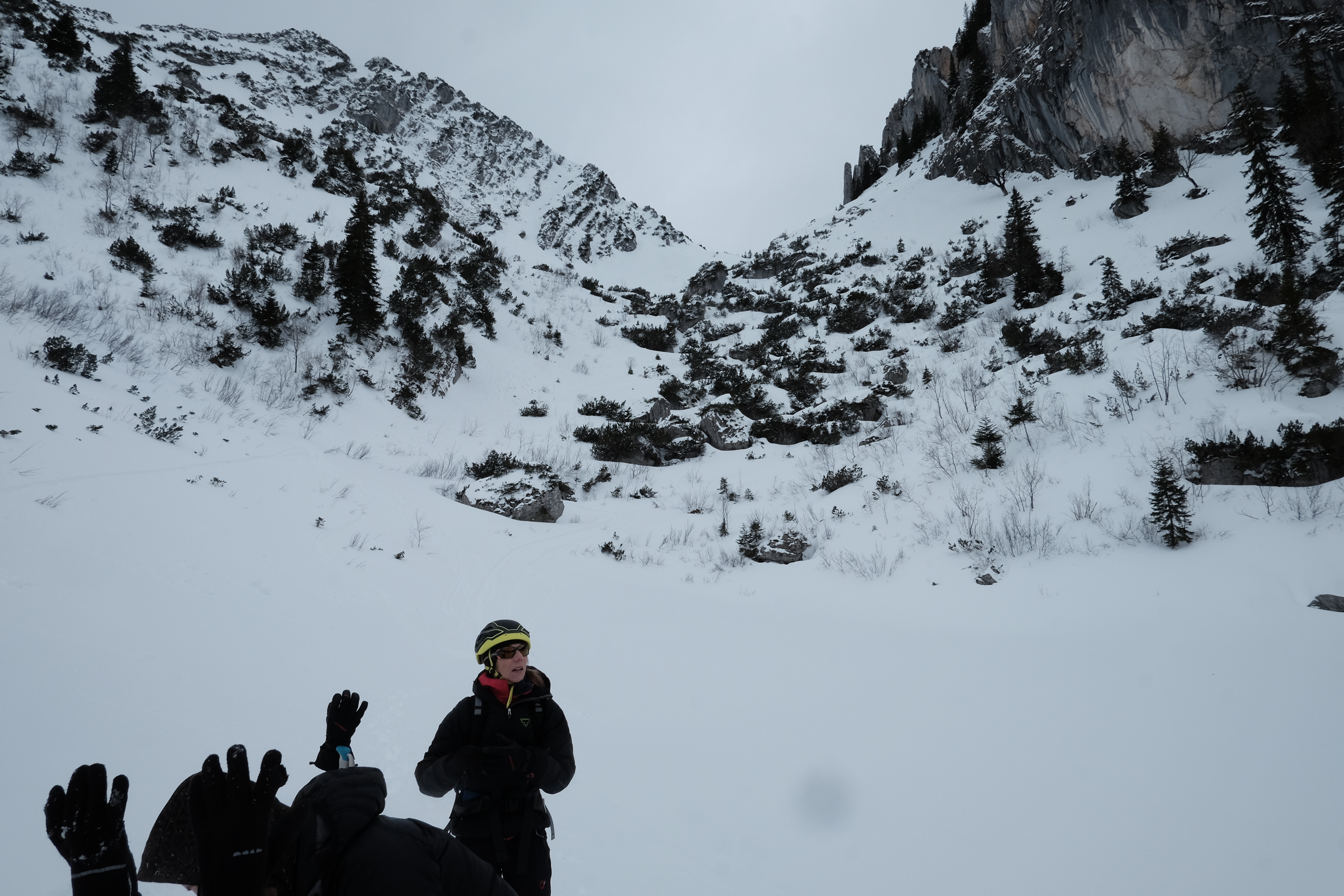 Tourenverhältnisse: oben in den Mulden Pulver, nach unten immer schwerer.
