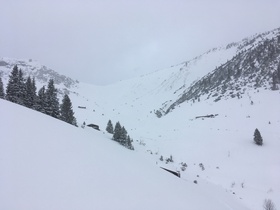 Tourenverhältnisse: Neuschnee, bis zur Stallen-Alm nur wenige cm, ab der Stallen-Alm kann angeschnallt werden; oben richtig viel Neuschnee, ab dem Sattel oberhalb der Schnittlauchrinne Hänge schneearm