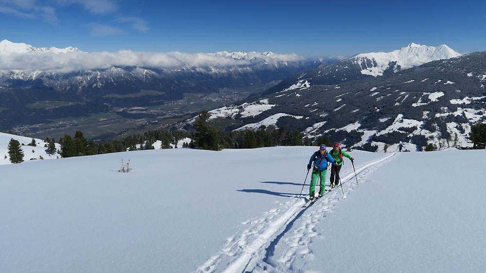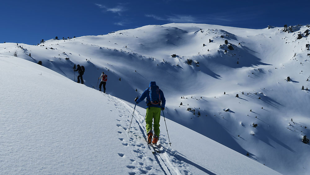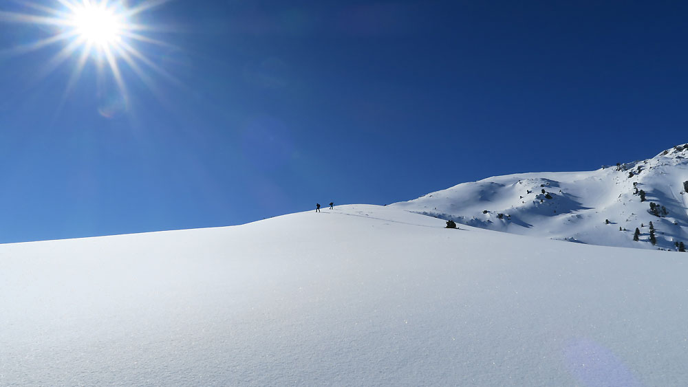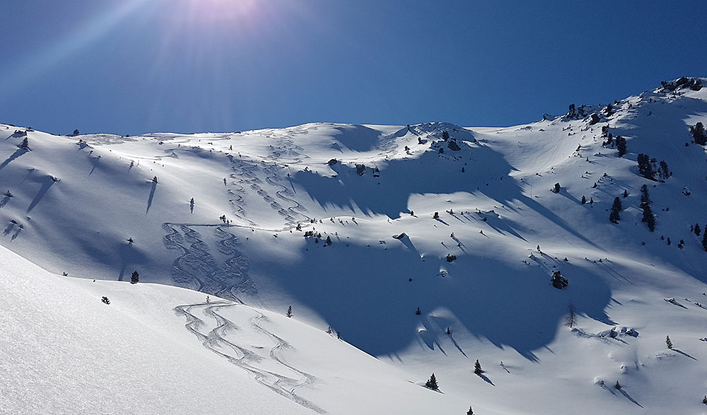 Oben dann traumhafter, sehr schön trockener Pulver auf überwiegend harter (eisiger) Unterlage, nur an wenigen Stellen ist man durchgebrochen. Die nordseitigen Passagen blieben auch um Mittag noch sehr schön pulvrig, die östlich ausgerichteten Steilpassagen bekamen schon einen Stich, im Flachen dann wieder super Pulver.