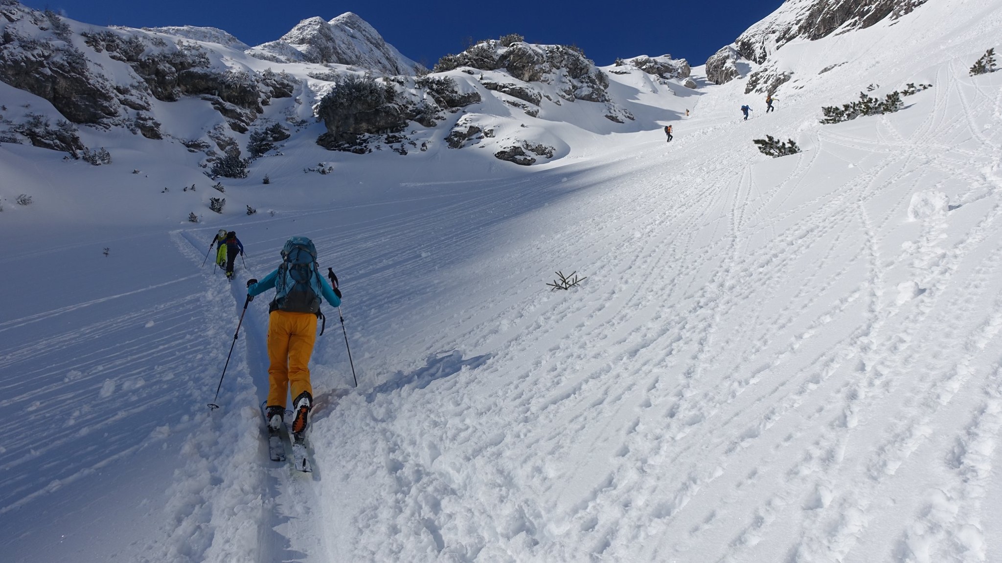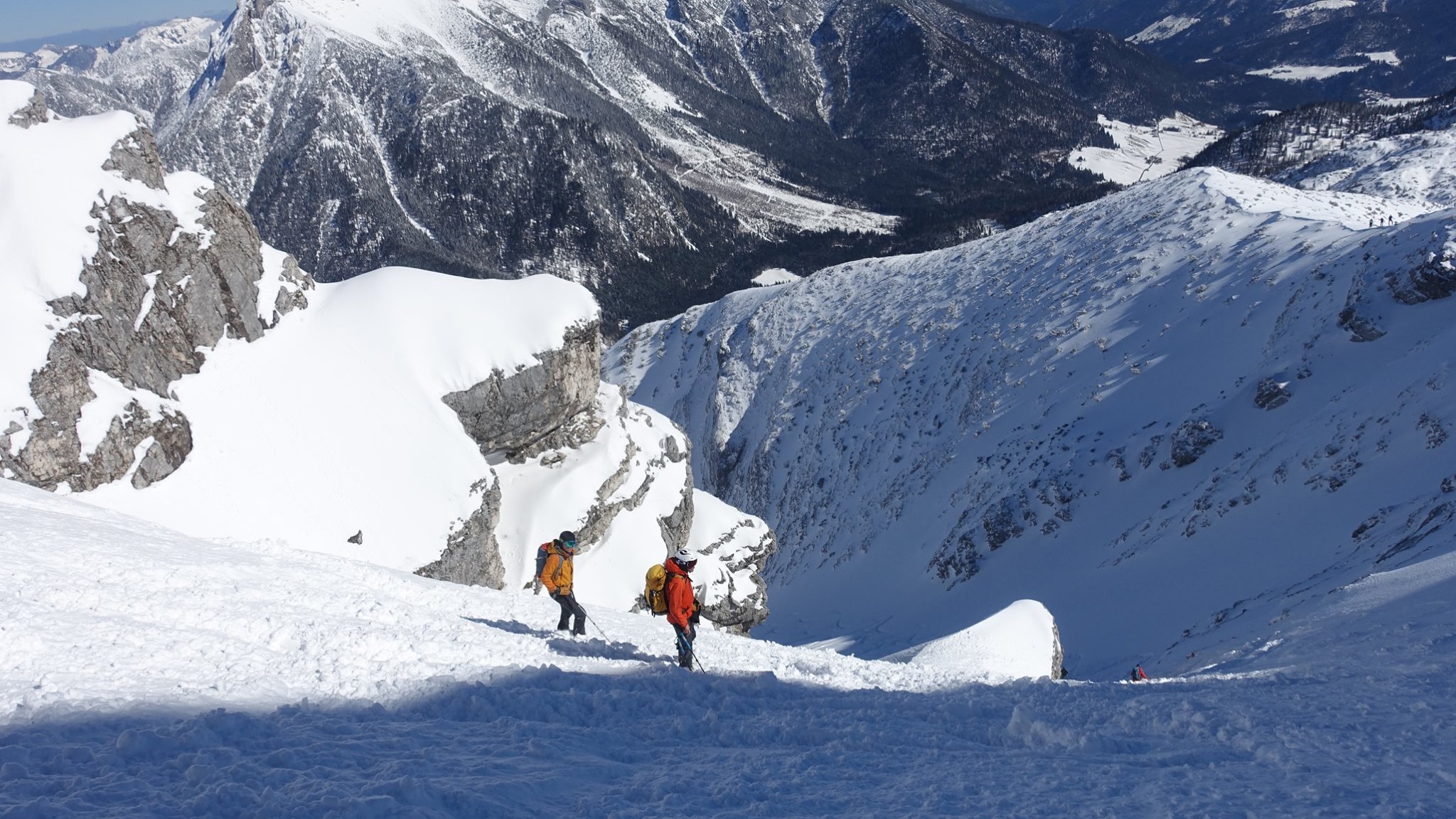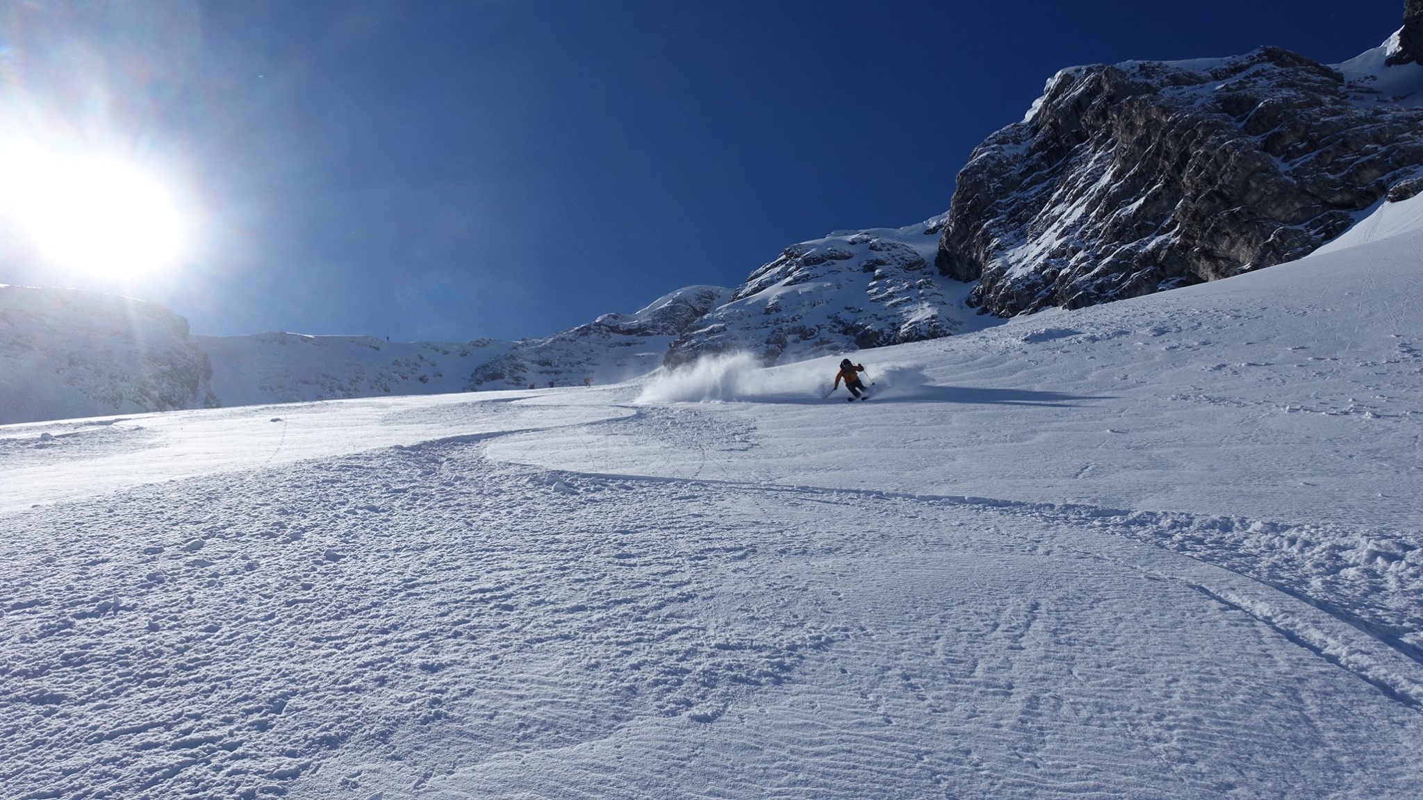 Tourenverhältnisse: im Kar Pulverschnee, Gipfelgrat abgeblasen, auf dem Plateau zwischen Gipfel und Einfahrt in's Nordkar auf Steine achten