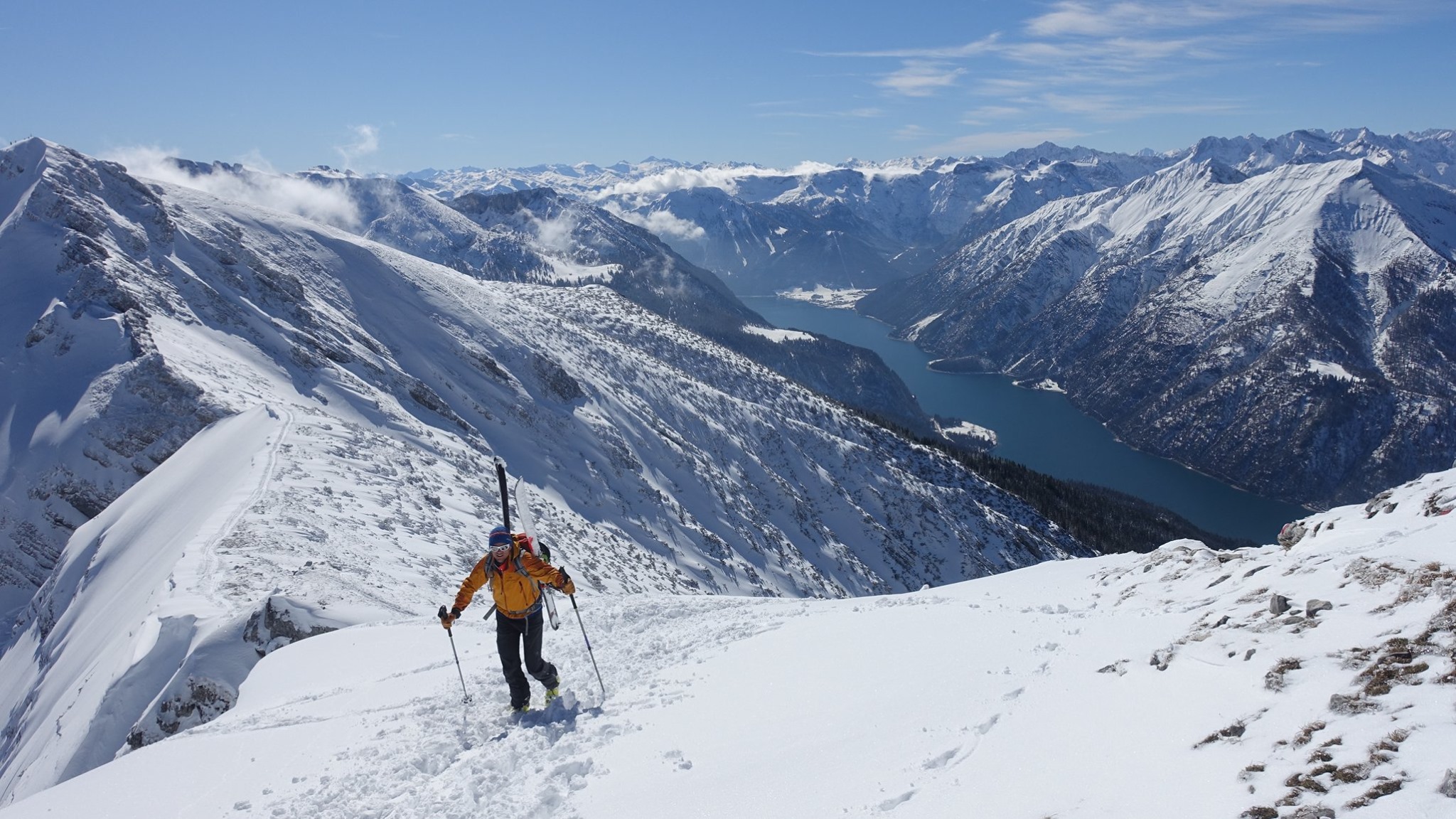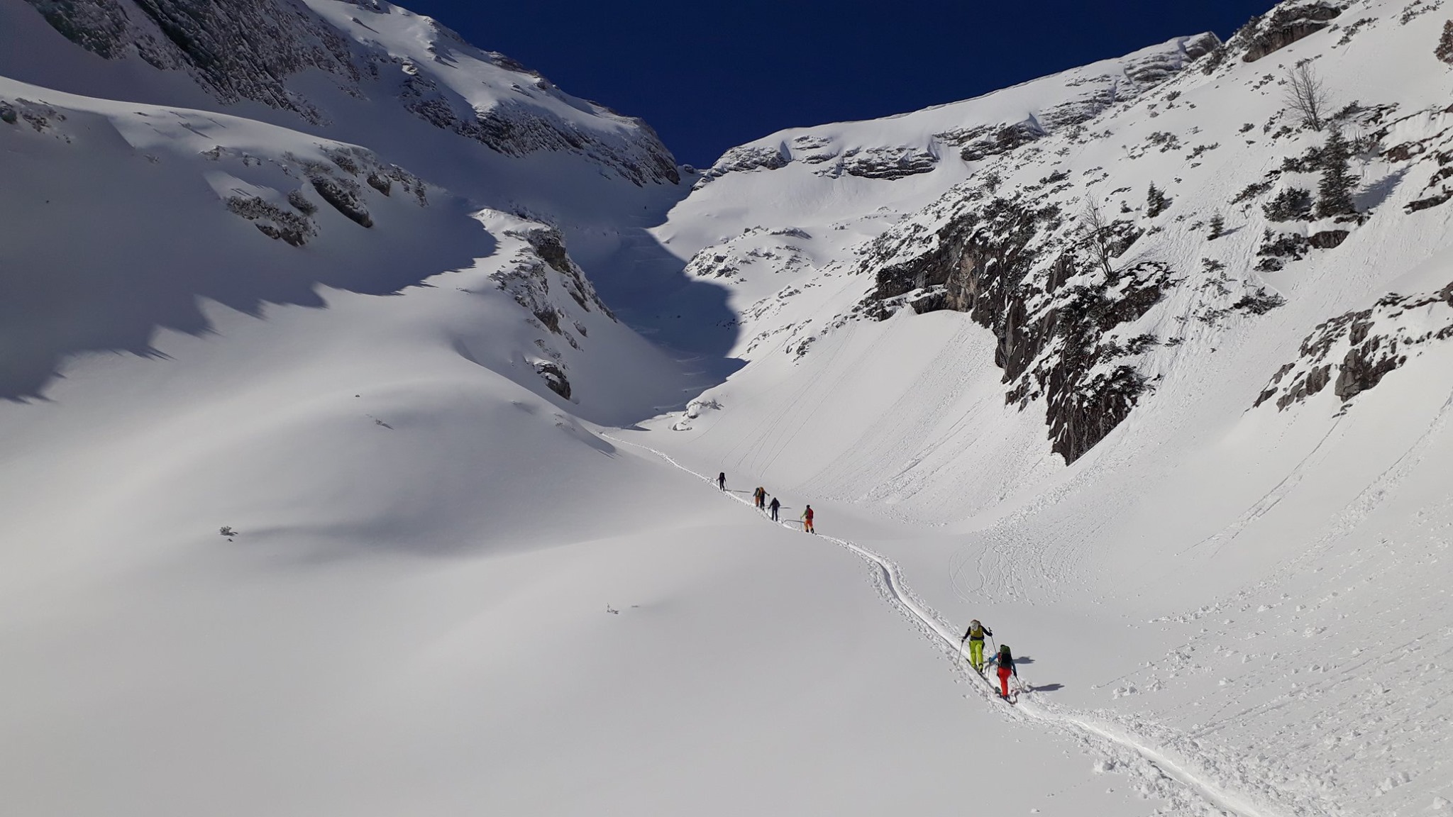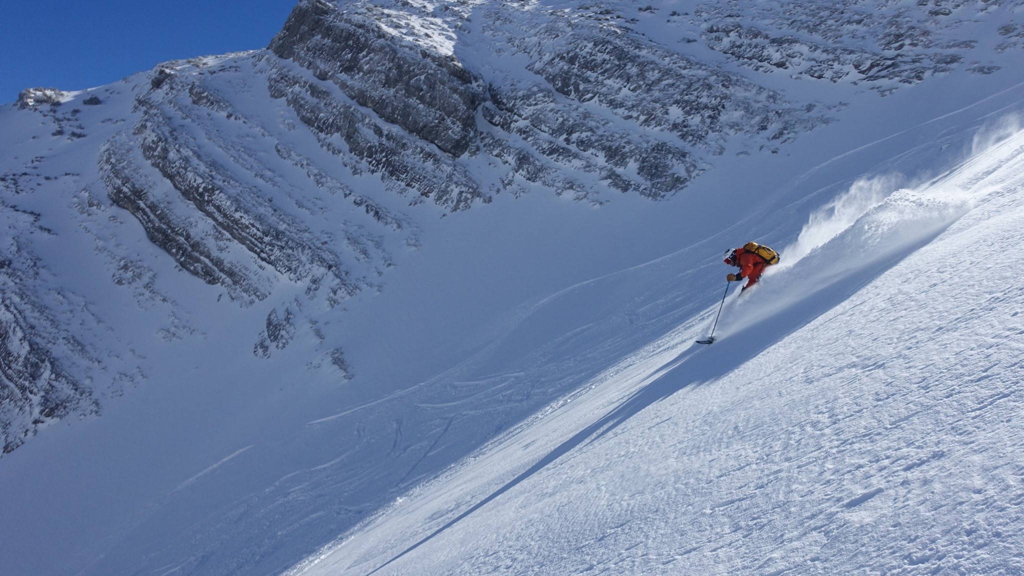 Tourenverhältnisse: im Kar Pulverschnee, Gipfelgrat abgeblasen, auf dem Plateau zwischen Gipfel und Einfahrt in's Nordkar auf Steine achten