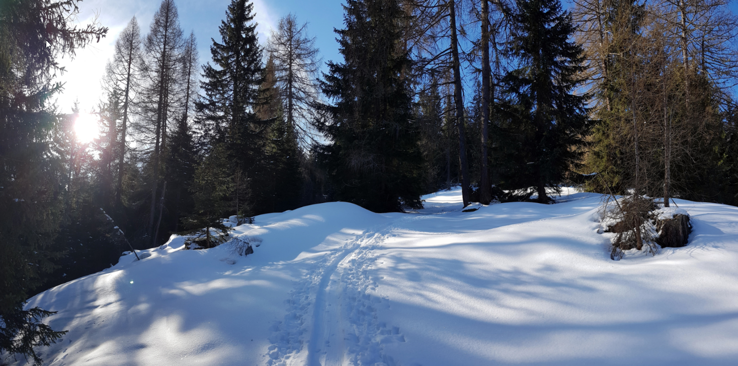 Gefahreneinschätzung: gering, insbesondere wenn über die aufgelassene Skipiste aufgestiegen/abgefahren wird, aktuell auch im Wald.