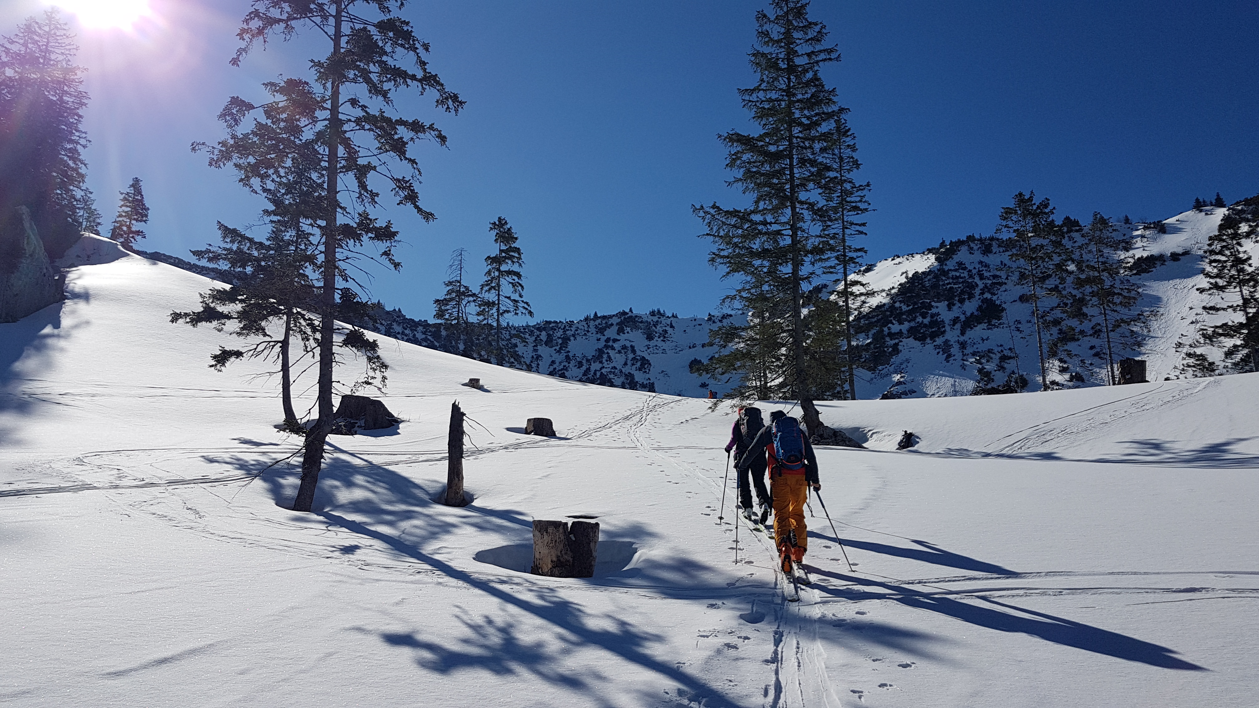 Die Tour: Derzeit ca. 20 Minuten Skitragen, dann geht es auf der Forststraße mit 2 kurzen Unterbrechungen. Im freien Gelände dann wunderbare Verhältnisse: In den reinen Schattseiten ca. 3 cm Pulver auf durchgehend harter Unterlage, auf der Sonnenseite (also fast bei der ganzen Abfahrt) schöner Firn. Einzig am Sattel hat uns ein starker Wind belästigt - ansonsten ein Traumtag!