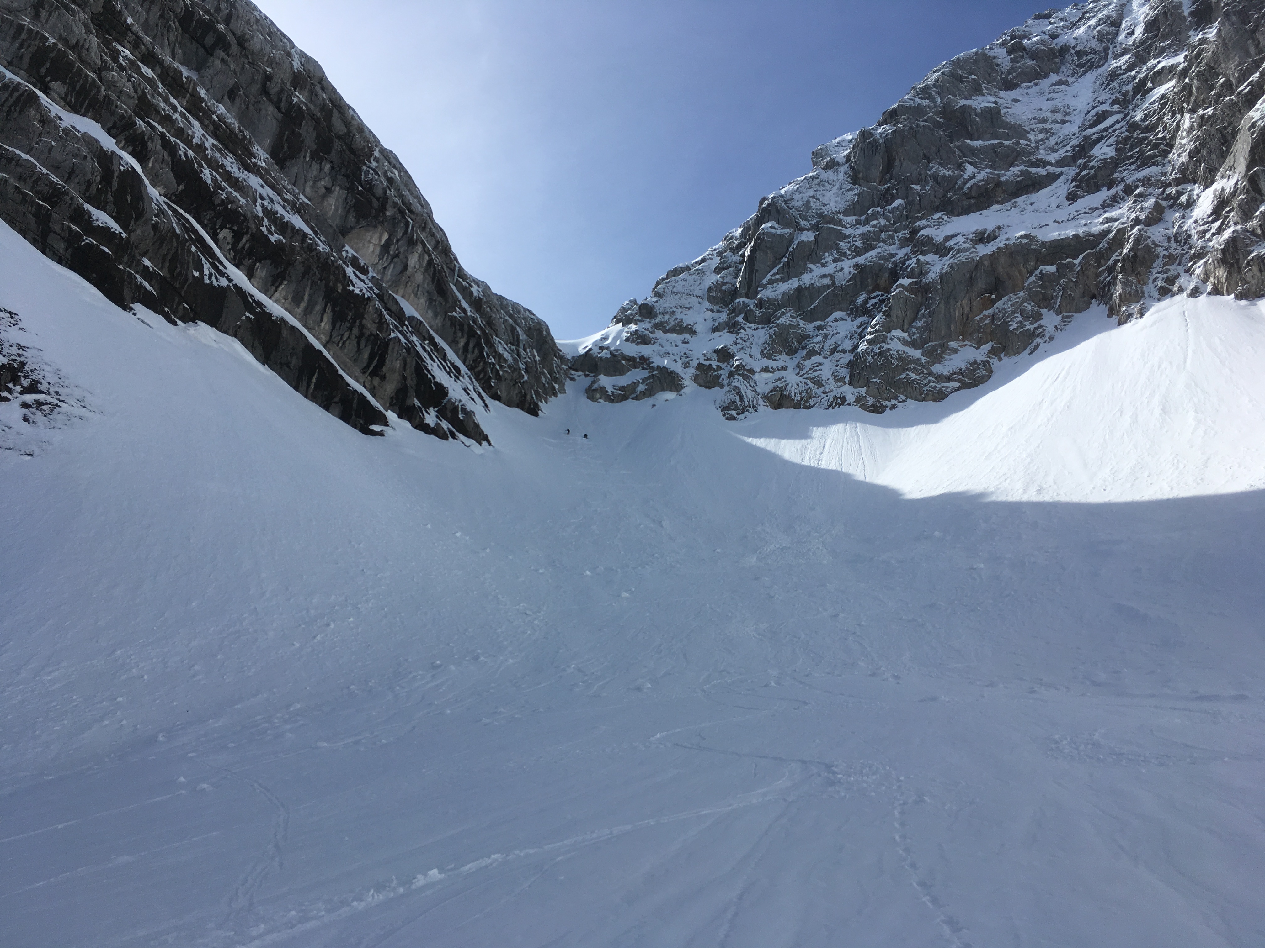 Tourenverhältnisse: Schnee bis (in Abfahrtsrichtung) kurz vor die Blaueishütte, unten am Morgen tragend, am späten Vormittag nicht mehr überall (insbesondere da, wo die Schneedecke schon dünn ist); weiter oben liegt noch der feuchte Pulver vom Neuschnee