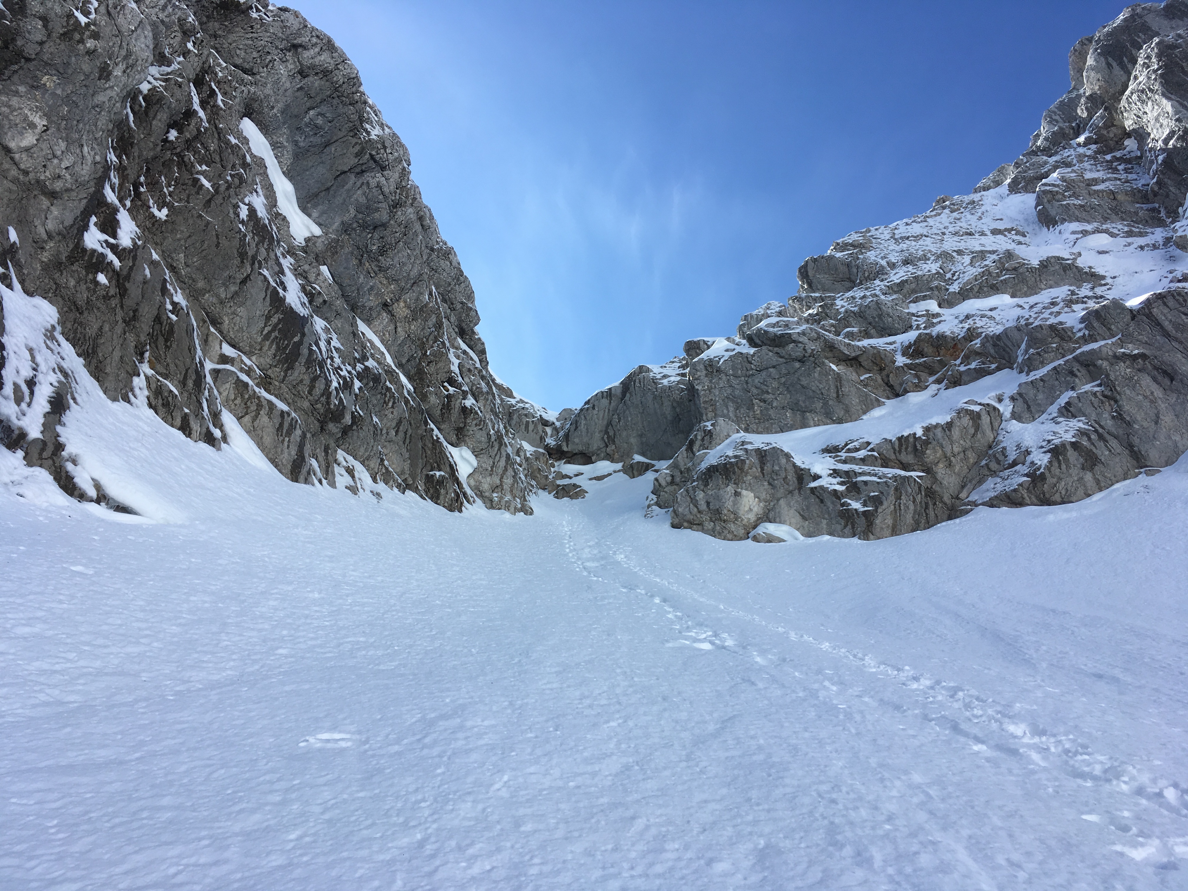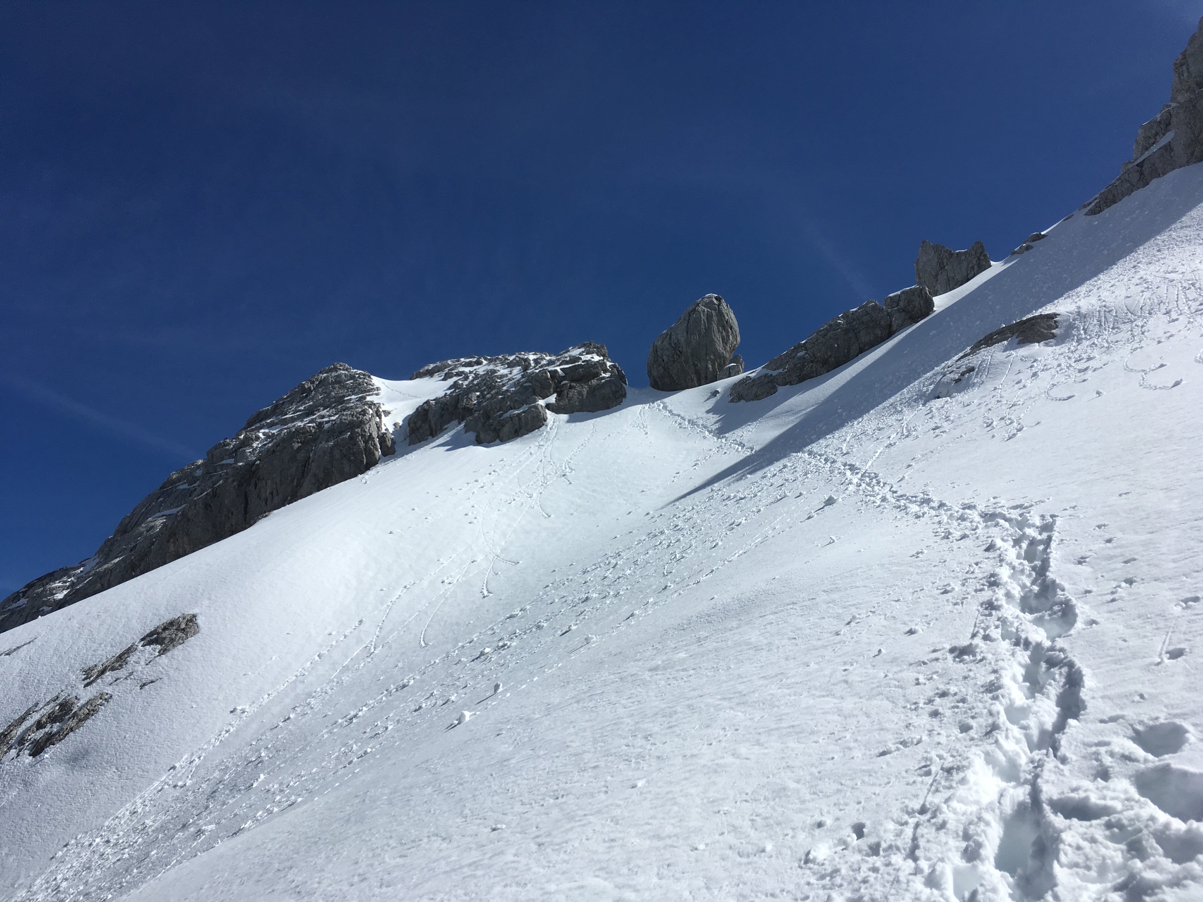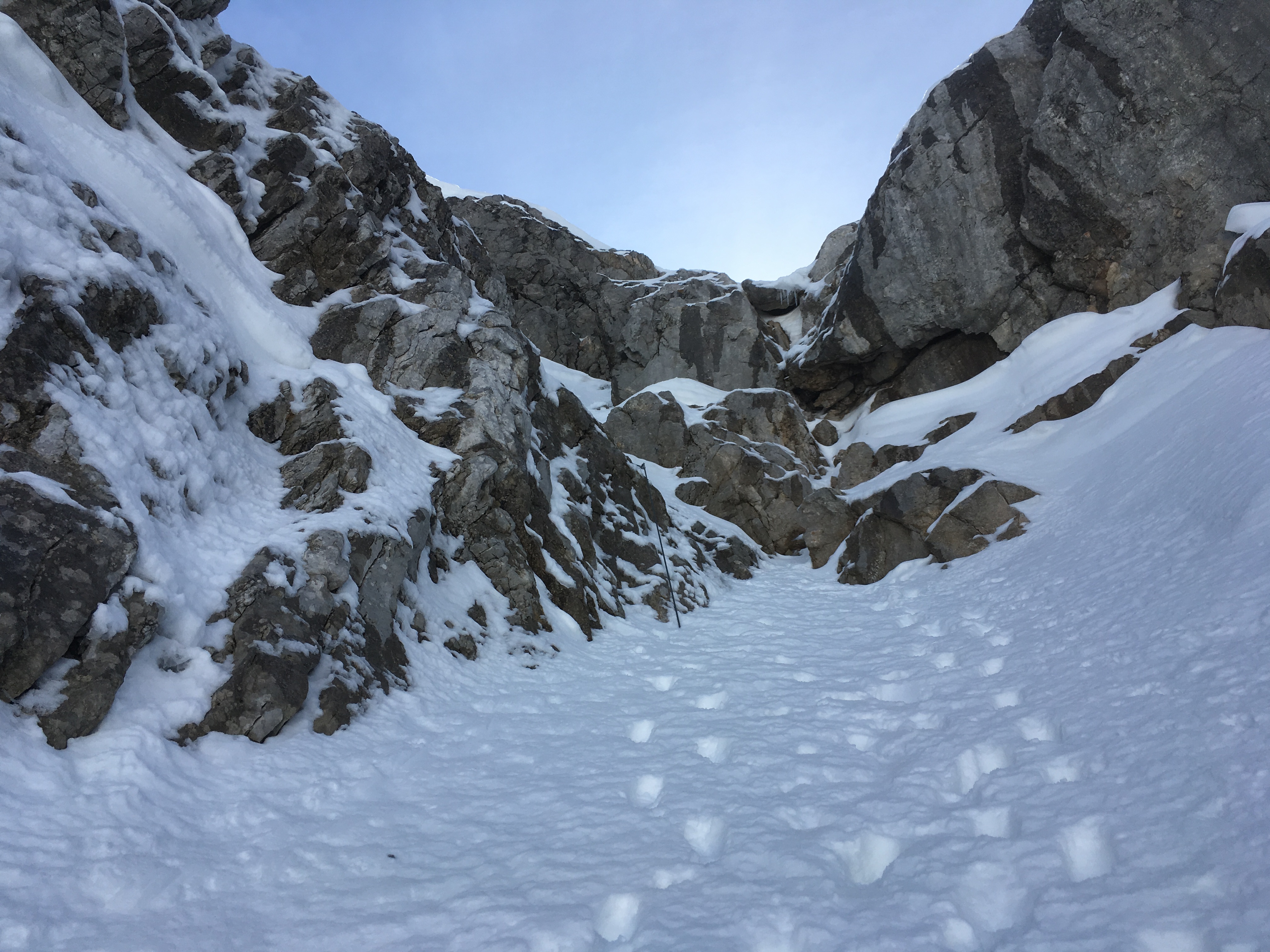 Gefahreneinschätzung: mittel bis hoch, es hängt sehr von den aktuellen Schneeverhältnissen ab; heute kam doch noch einiges von den Flanken herunter (wohl v.a. der Neuschnee aus dieser Woche), im Aufstieg m.E. besser links halten - zum Gipfelanstieg siehe unten