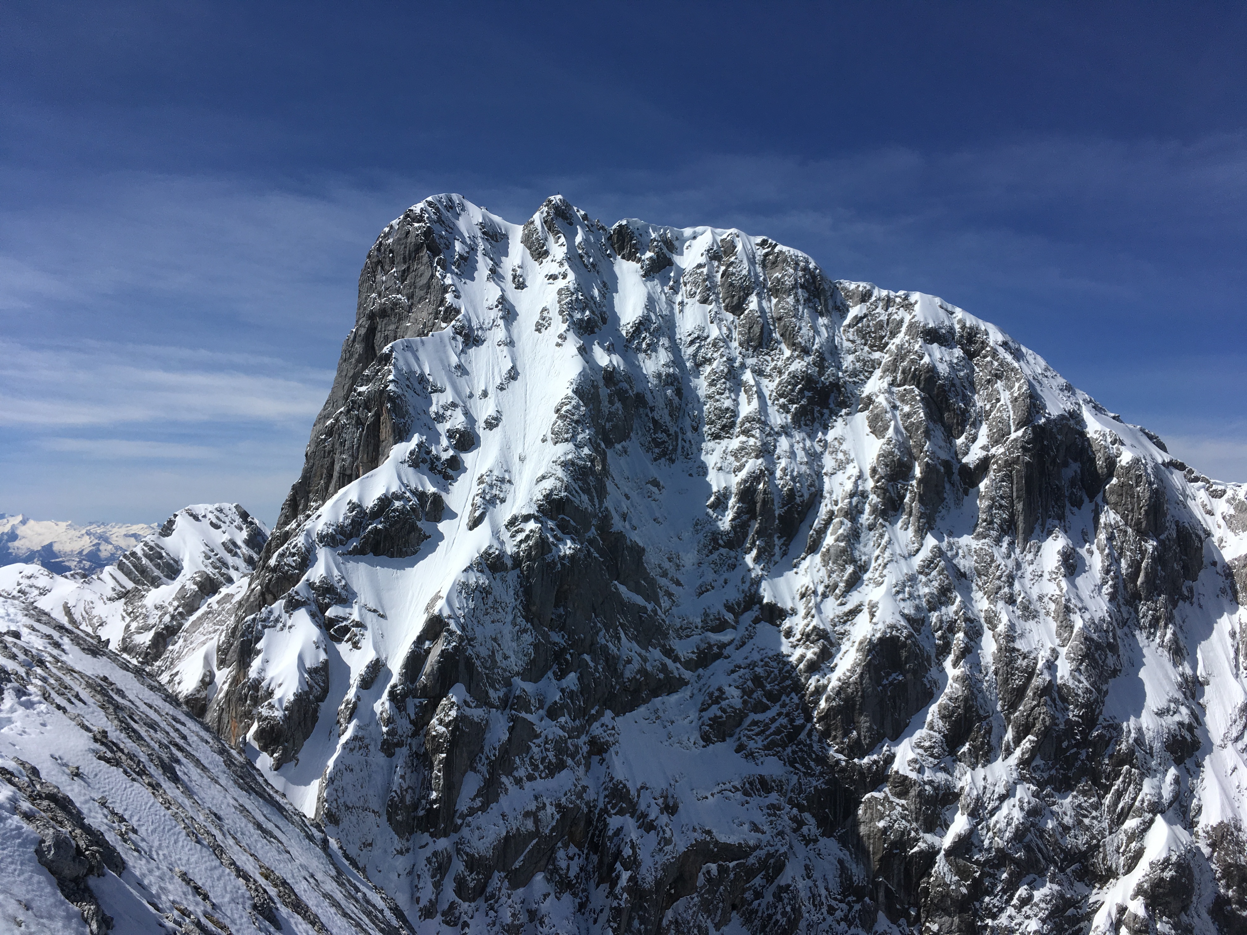 Schon etwas weiter oben - man sieht den Neuschnee in den nordseitigen Flanken, zudem noch abbruchbereite Wächten: