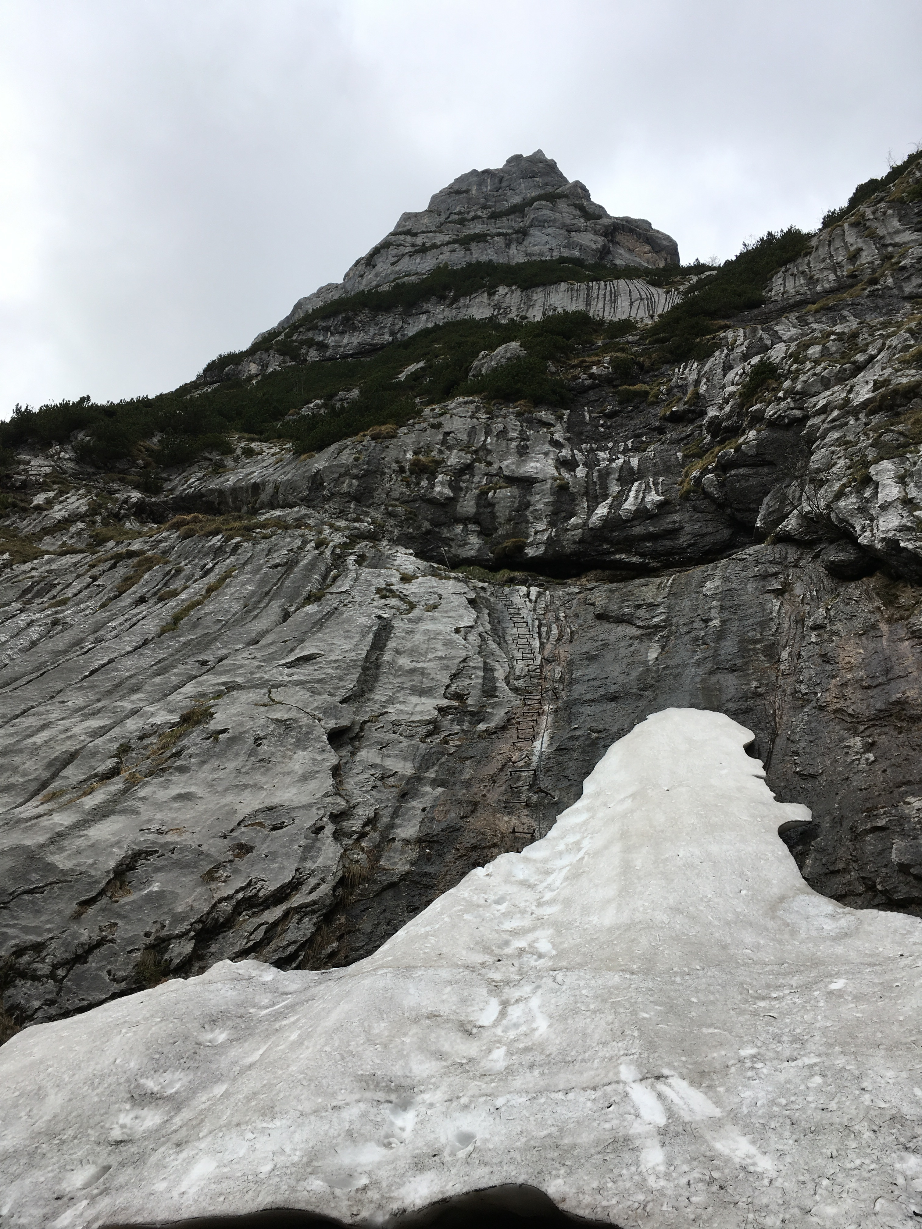 Der Einstieg in die sog. "Leiter" ist durch ein Schneefeld verlegt, es gibt aber Stapfspuren - jedoch steil: