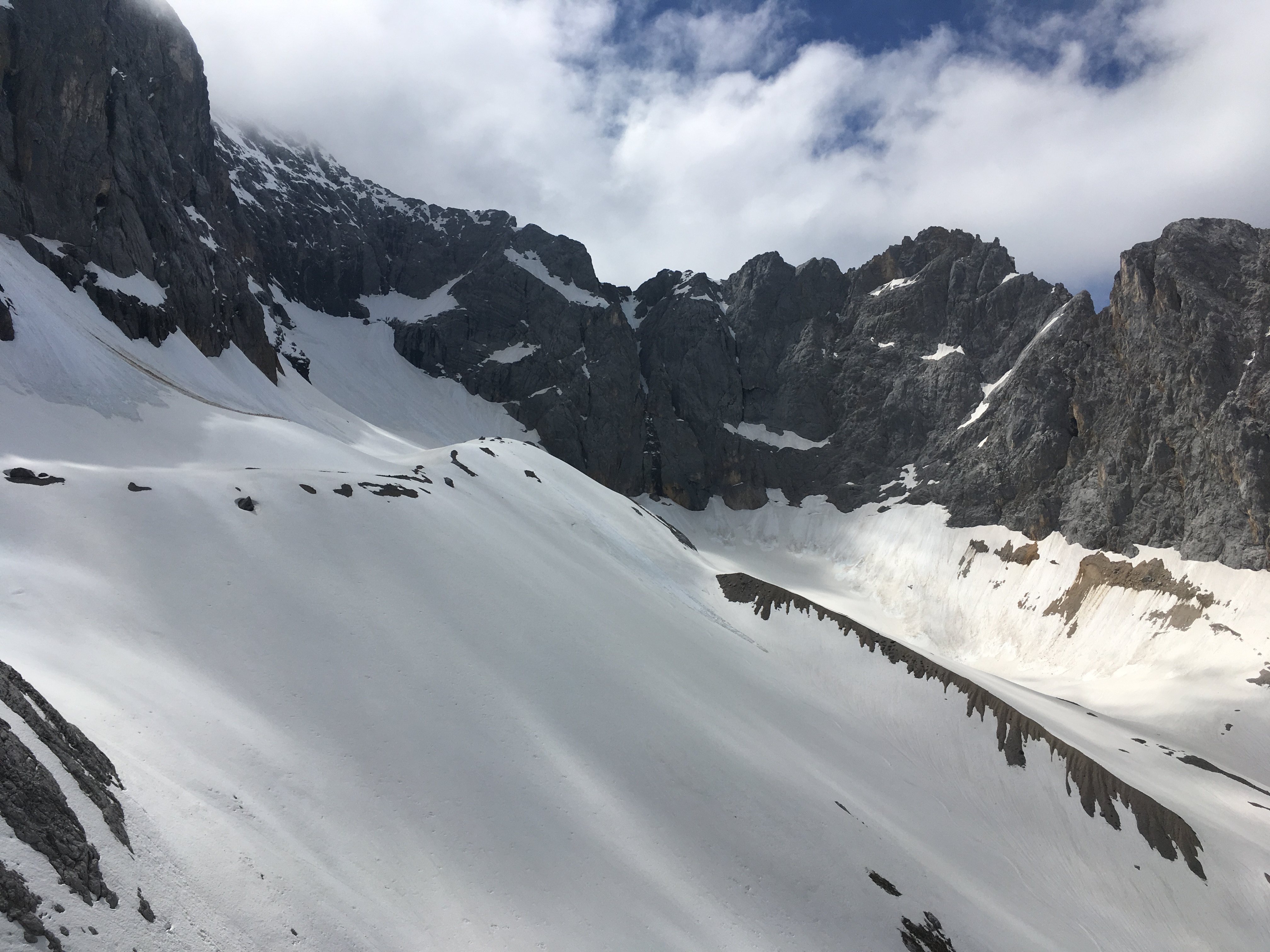 Achtung: In den umliegenden Wänden liegt auch noch einiges an Schnee. Allein während ich "Gipfelrast" gemacht habe, gingen zwei große Rutsche ab und verschütteten am Höllentalferner jeweils die Aufstiegsspur der Zugspitzaspiranten. Deswegen empfiehlt es sich auch, nicht noch mit den Kurzski weiter hochzugehen. Im Bereich des eigentlichen Höllentalferners ist sowieso alles eingelahnt und daher unlohnend für Skier.