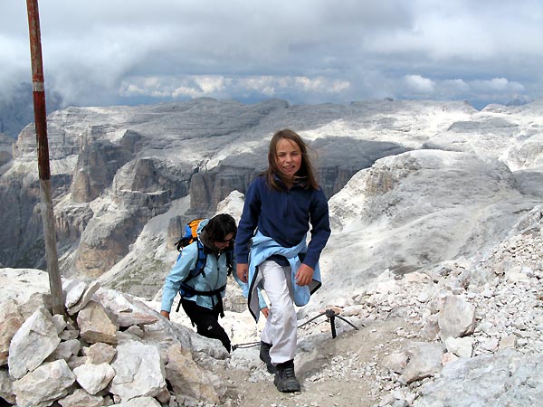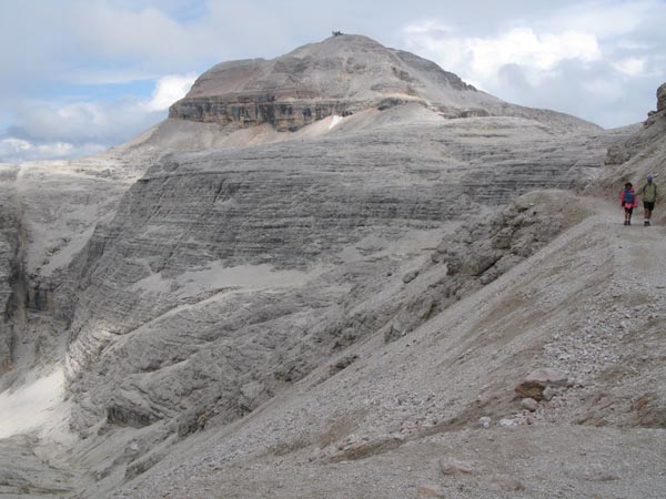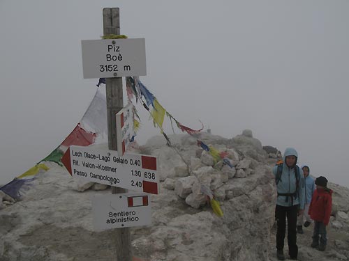 Tourenverhältnisse: Wetter kühl und teilweise windig, Gipfel um die 3000 m zeitweise wolkenverhangen, teilweise frei. Kein Niederschlag. Beste Wegverhältnisse. Gut markiert und ausgeschildert; Seilsicherungen in bestem Zustand. Hütte am Gipfel noch bis 20.09.09 geöffnet. Hütte in der Pordoischarte noch bis Ende Sept./Anfang Okt. (je nach Wetter) geöffnet.