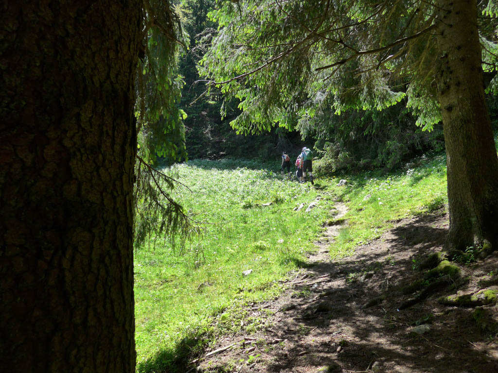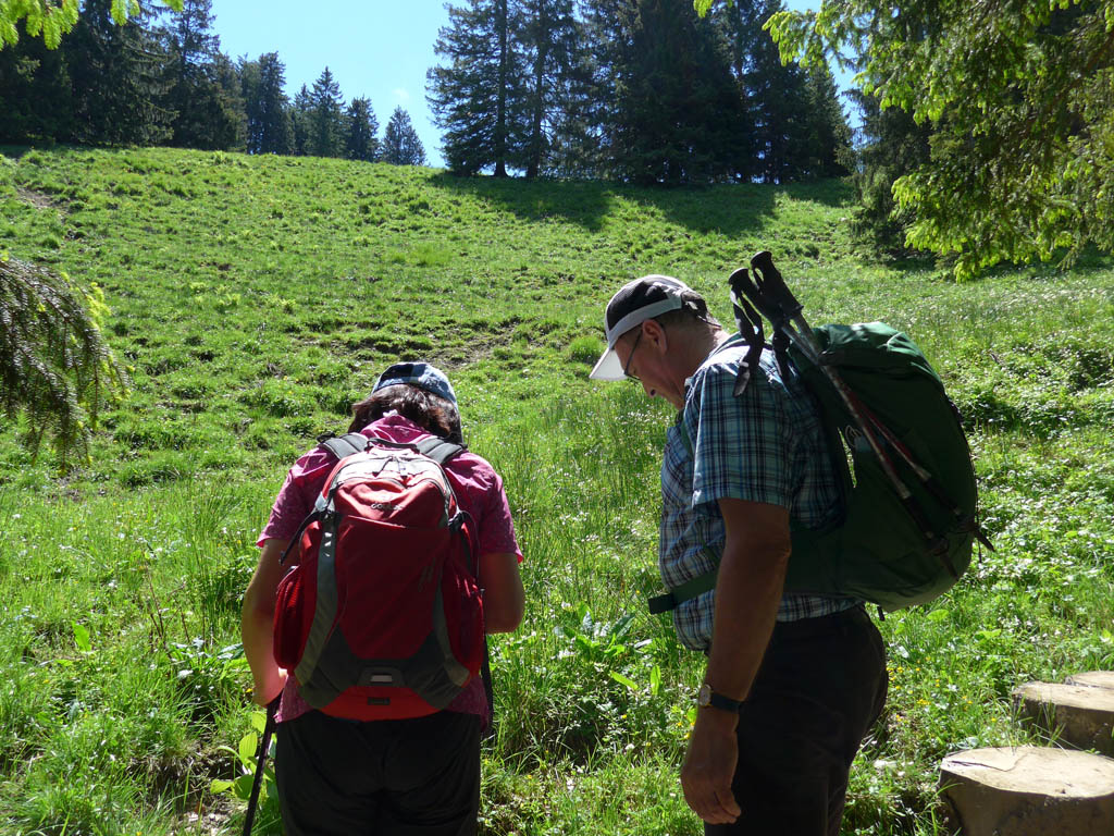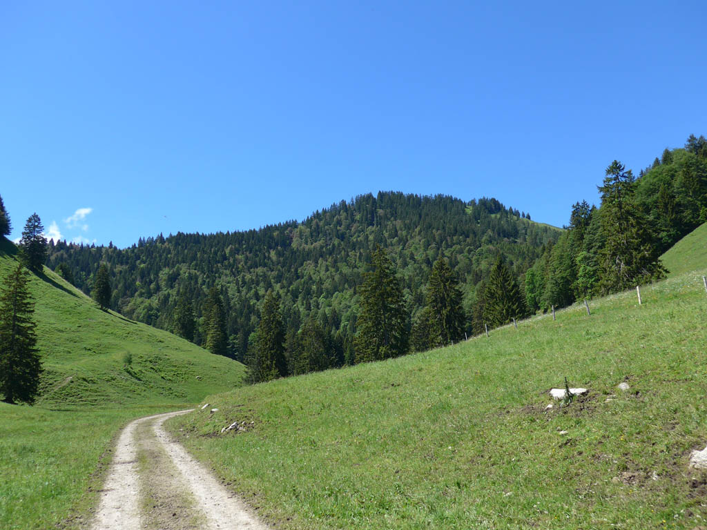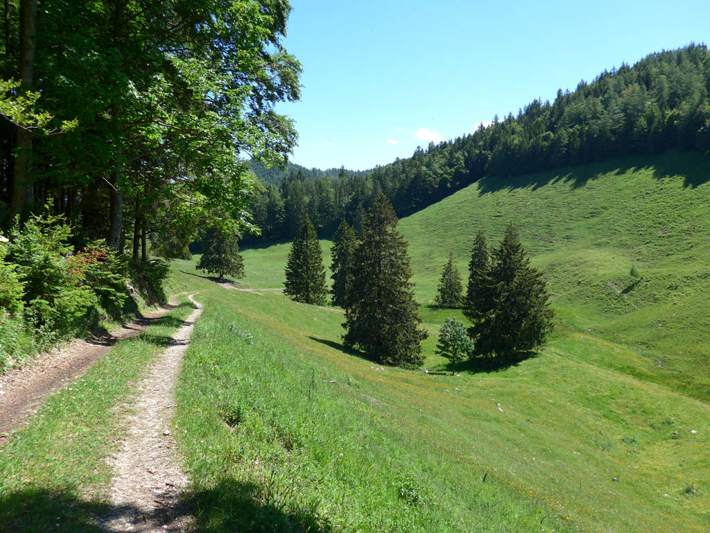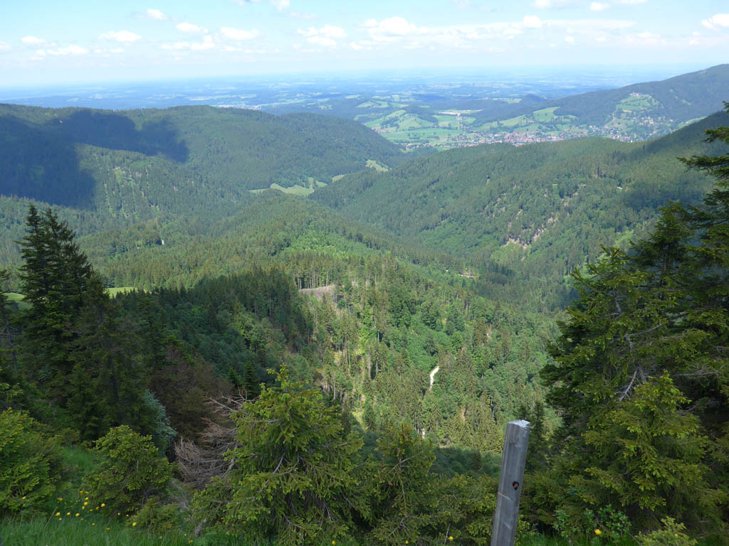 Rechts ginge es zur Baumgartenschneid. Wir sind geradaus weiter und dann hinten am Wald nach links: