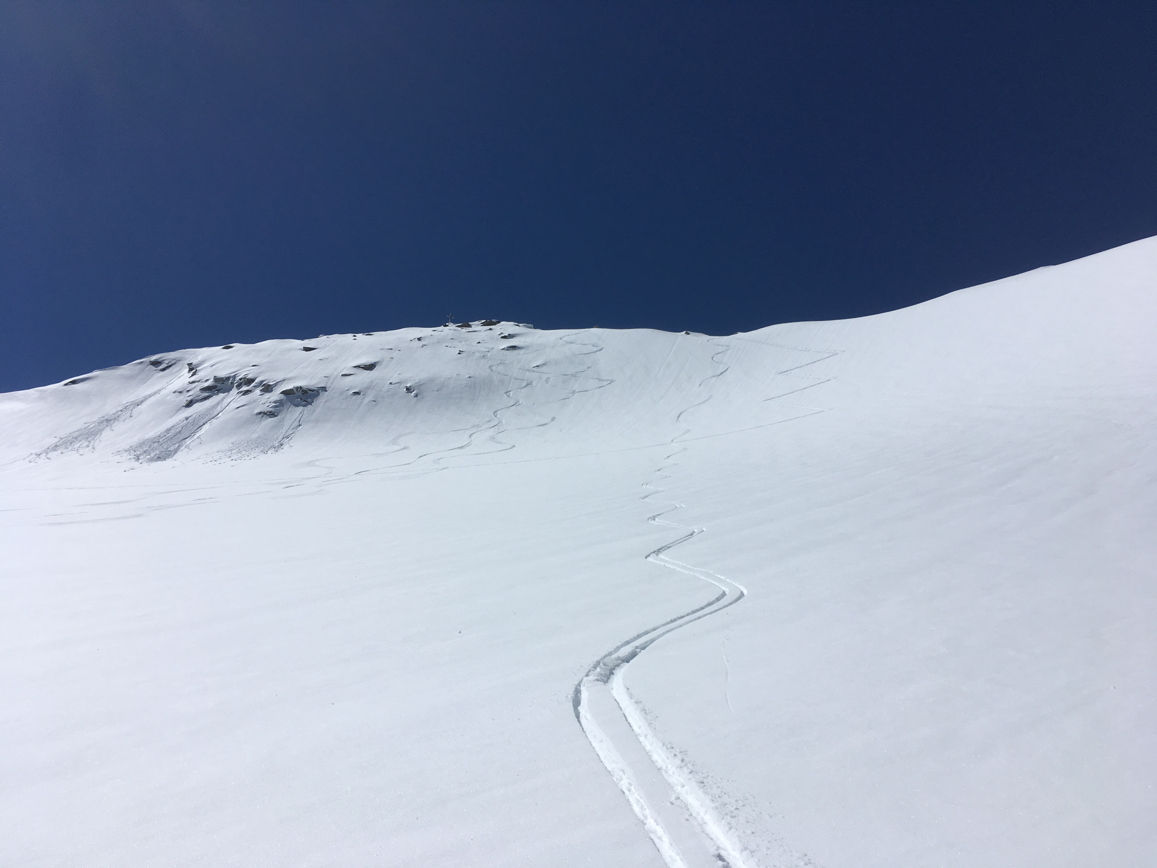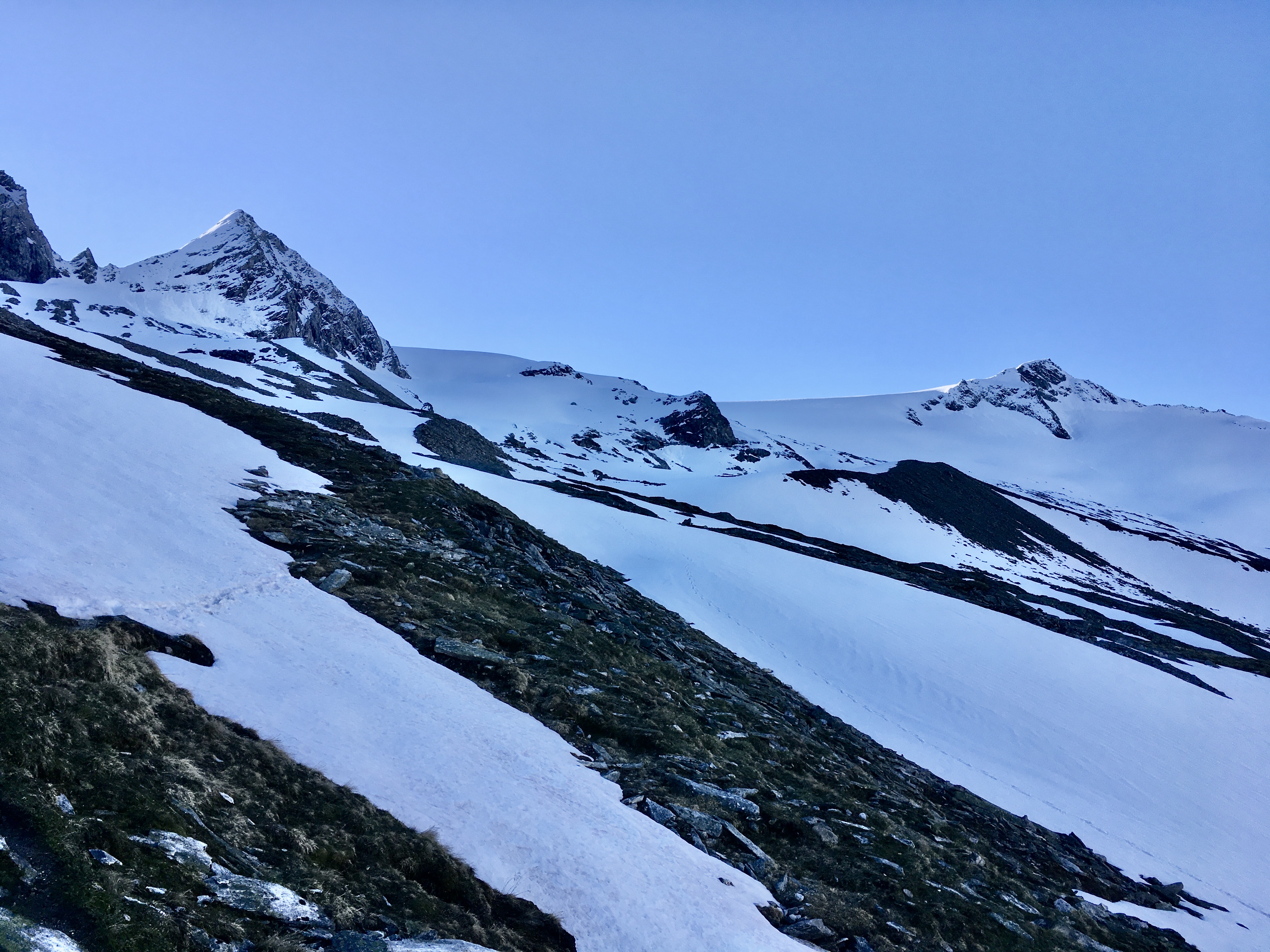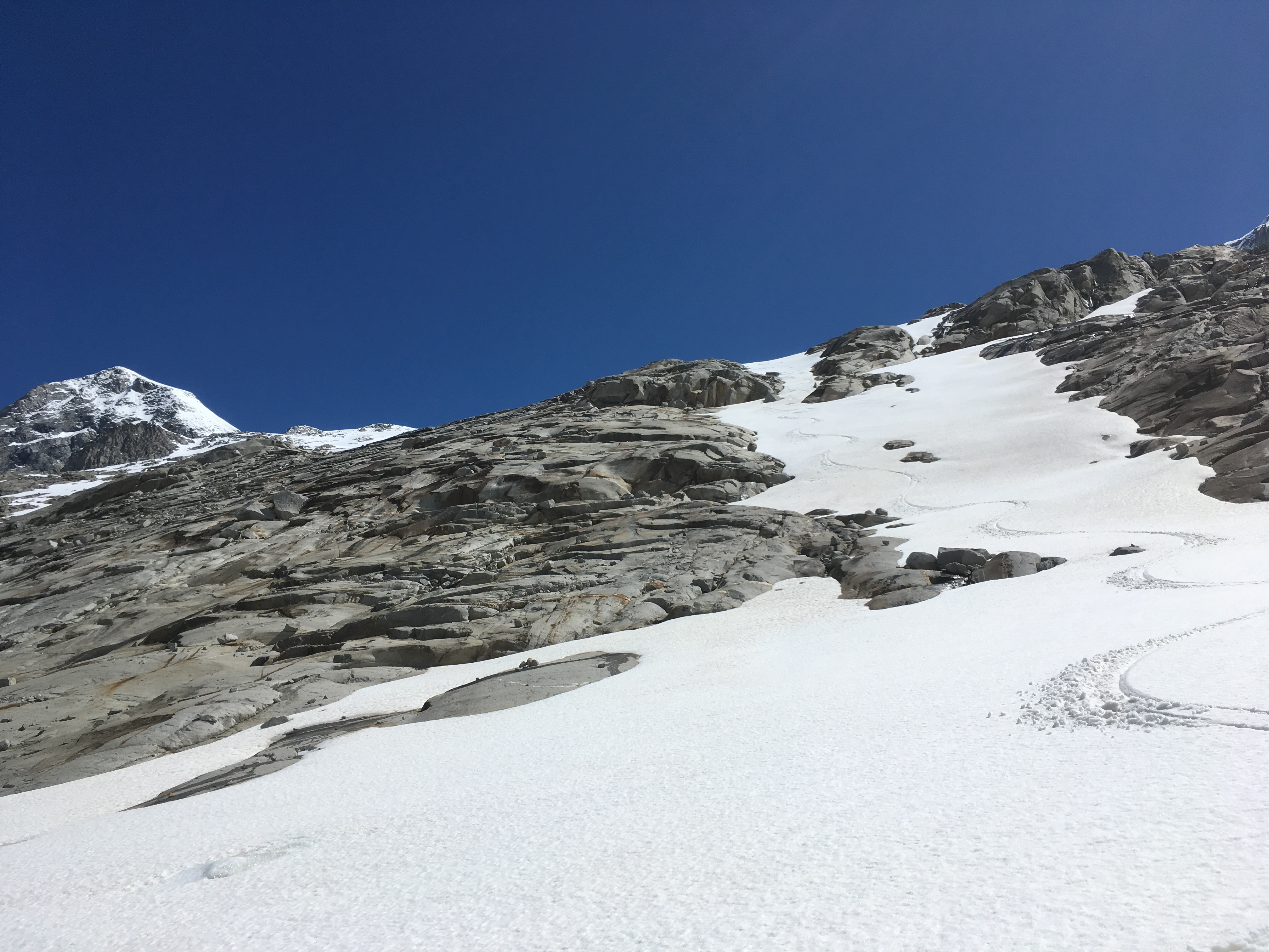 Tourenverhältnisse: Schnee auf der Abfahrtsroute noch bis ca. 2.160 m, im Bereich der Gletscherschliffplatten einige (Altschnee-Gleitschnee)Anrisse; Neuschnee von dieser Woche oberhalb ca. 2.600 m noch nicht voll umgewandelt