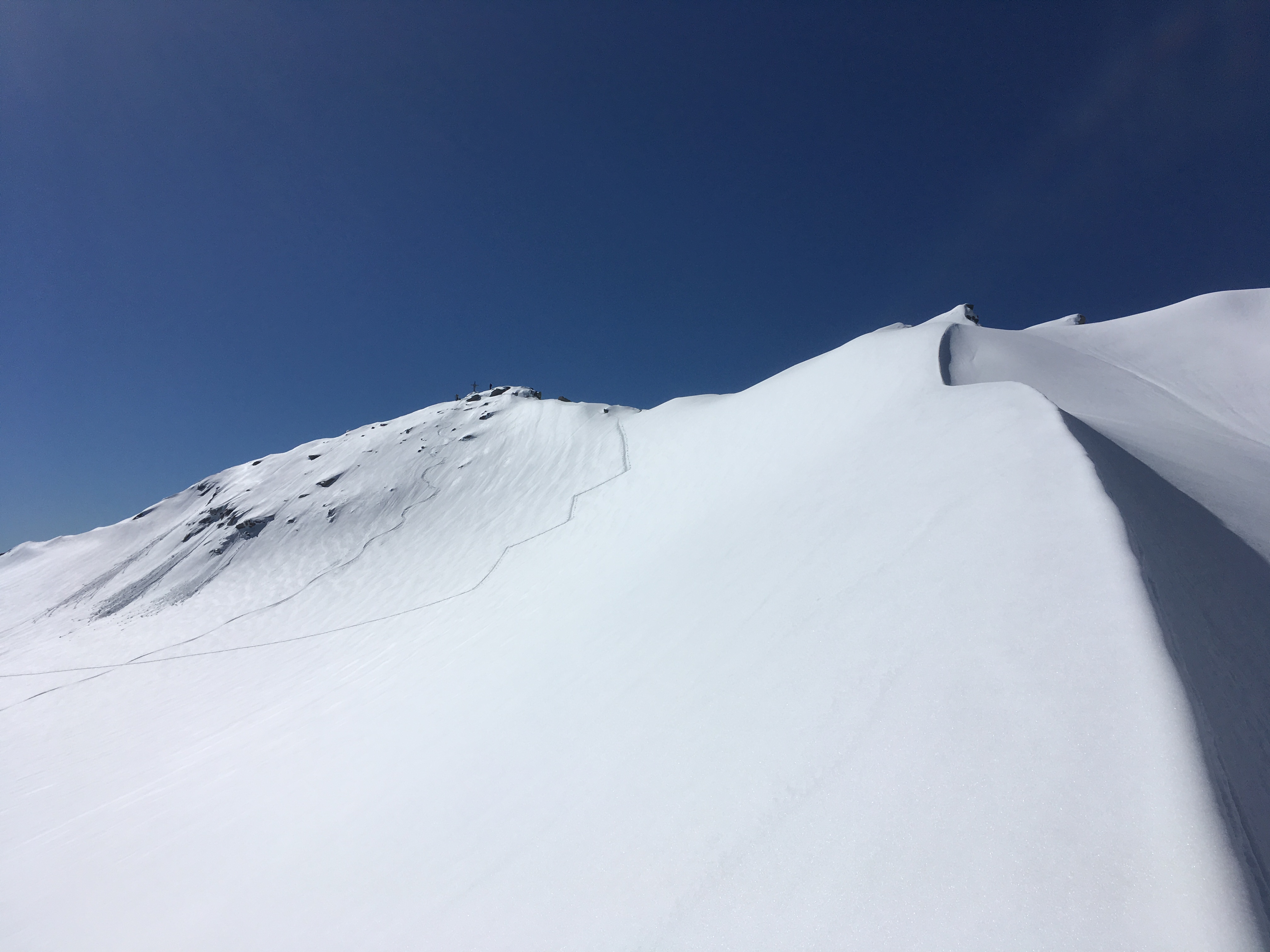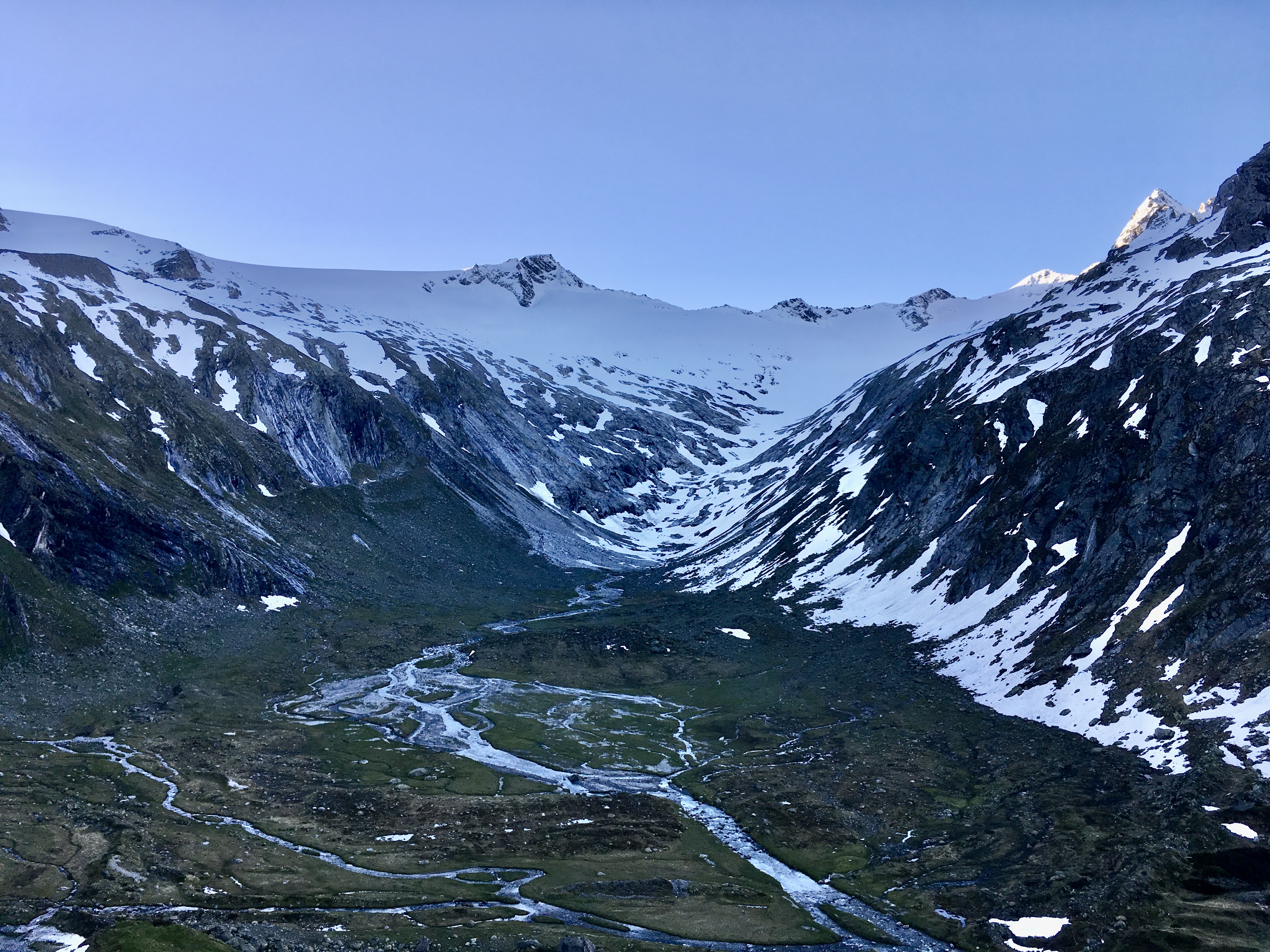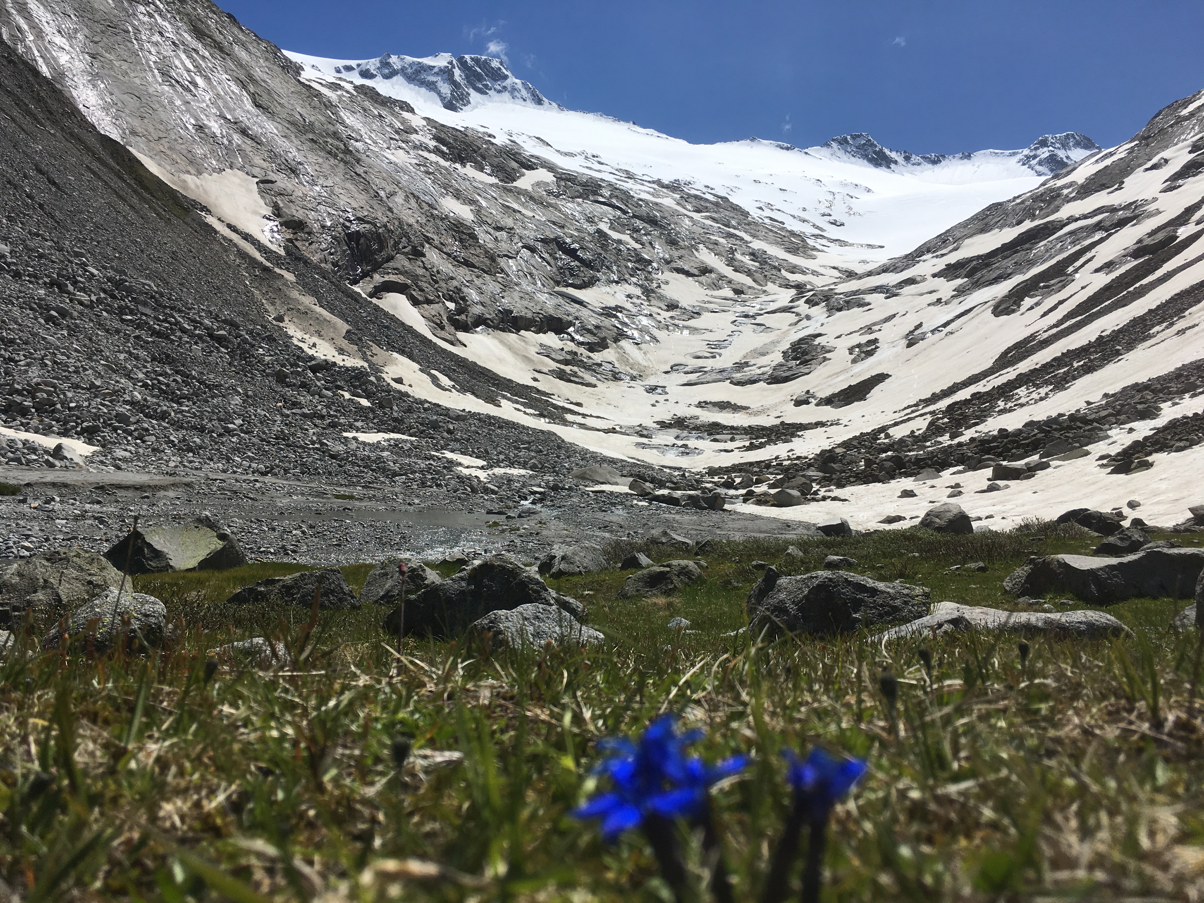 Tourenverhältnisse: Schnee auf der Abfahrtsroute noch bis ca. 2.160 m, im Bereich der Gletscherschliffplatten einige (Altschnee-Gleitschnee)Anrisse; Neuschnee von dieser Woche oberhalb ca. 2.600 m noch nicht voll umgewandelt