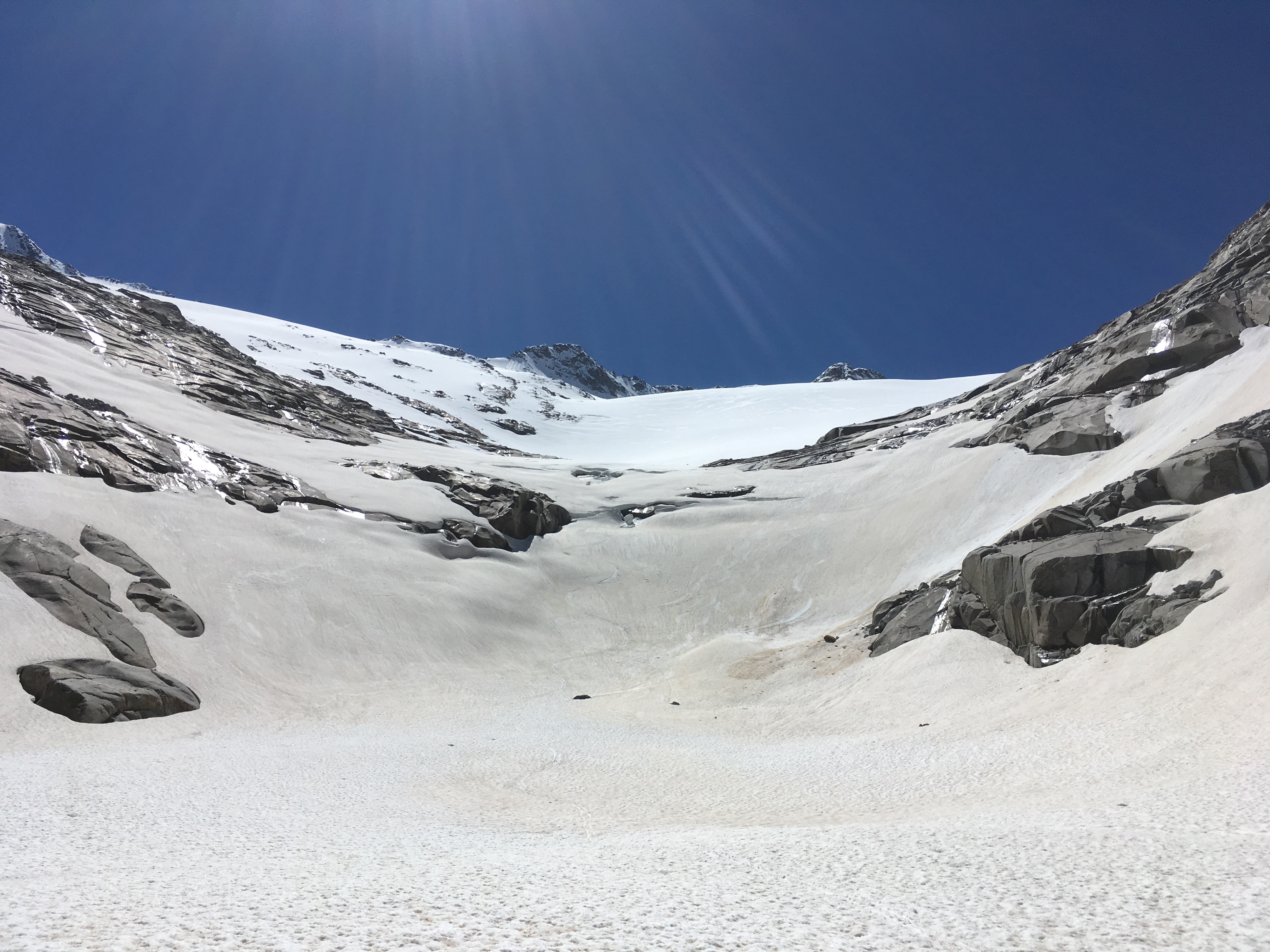 So soll eine Frühsommer-Skitour sein: Mit Skiern im Sommerschnee durch die Felsen bis weit hinab