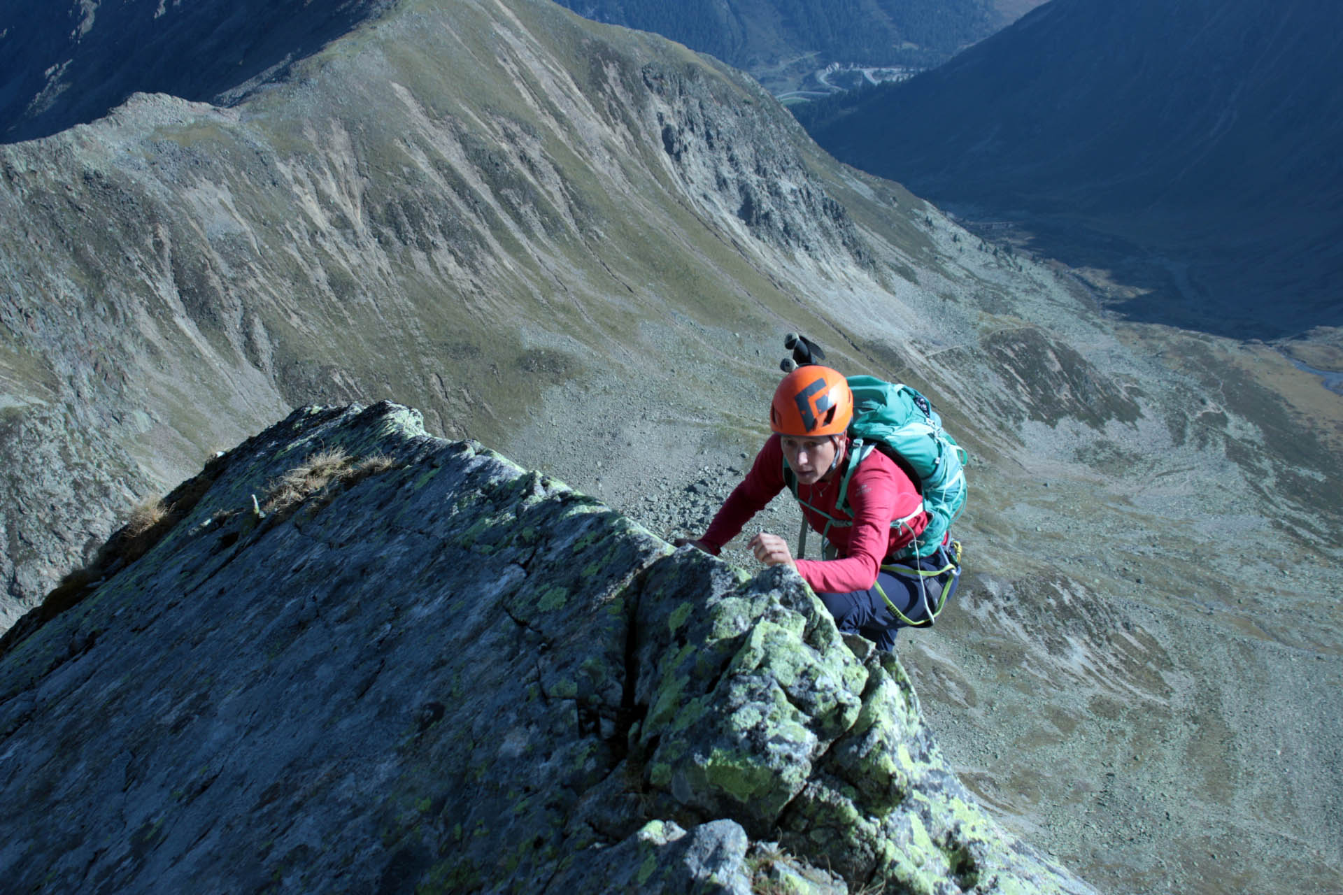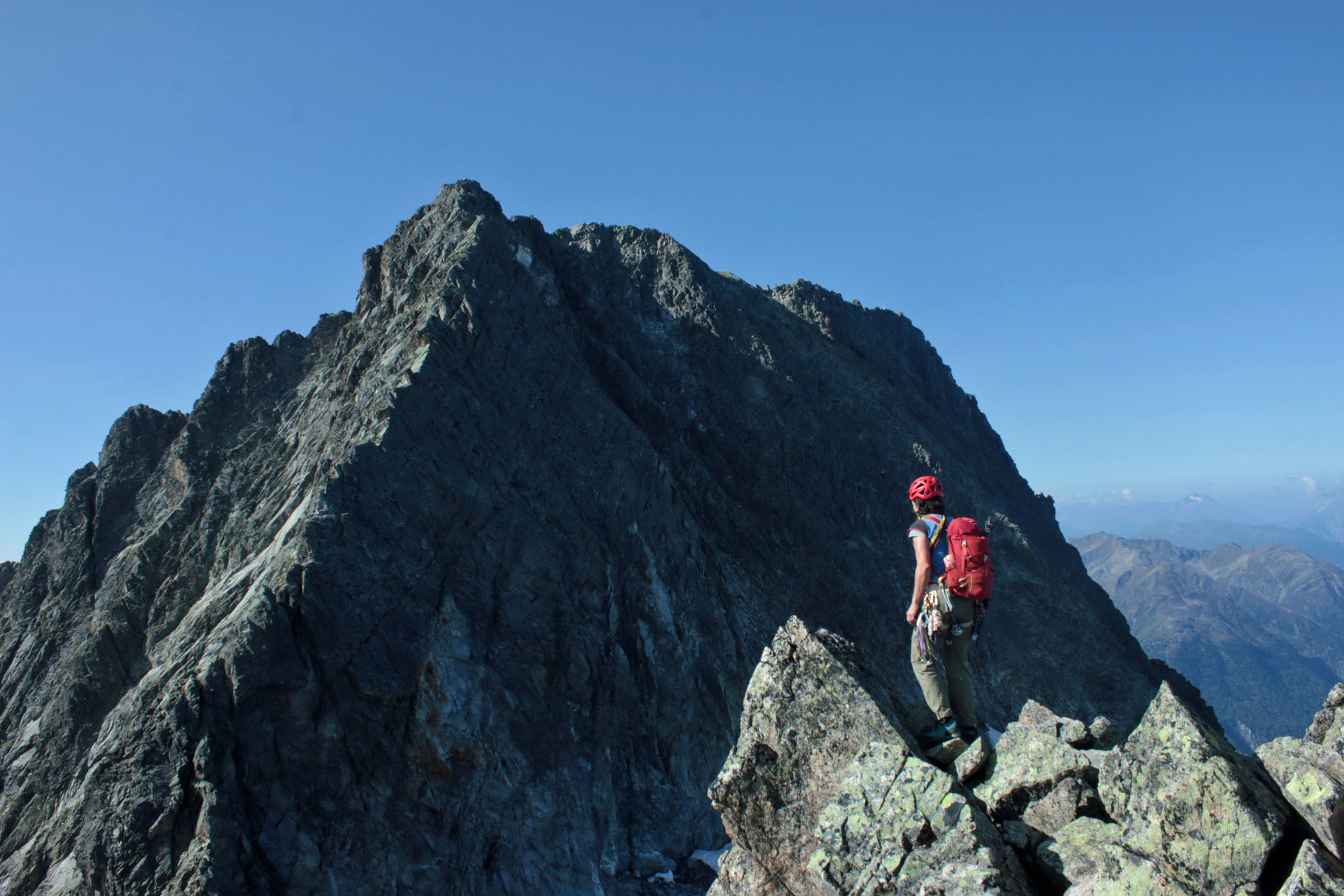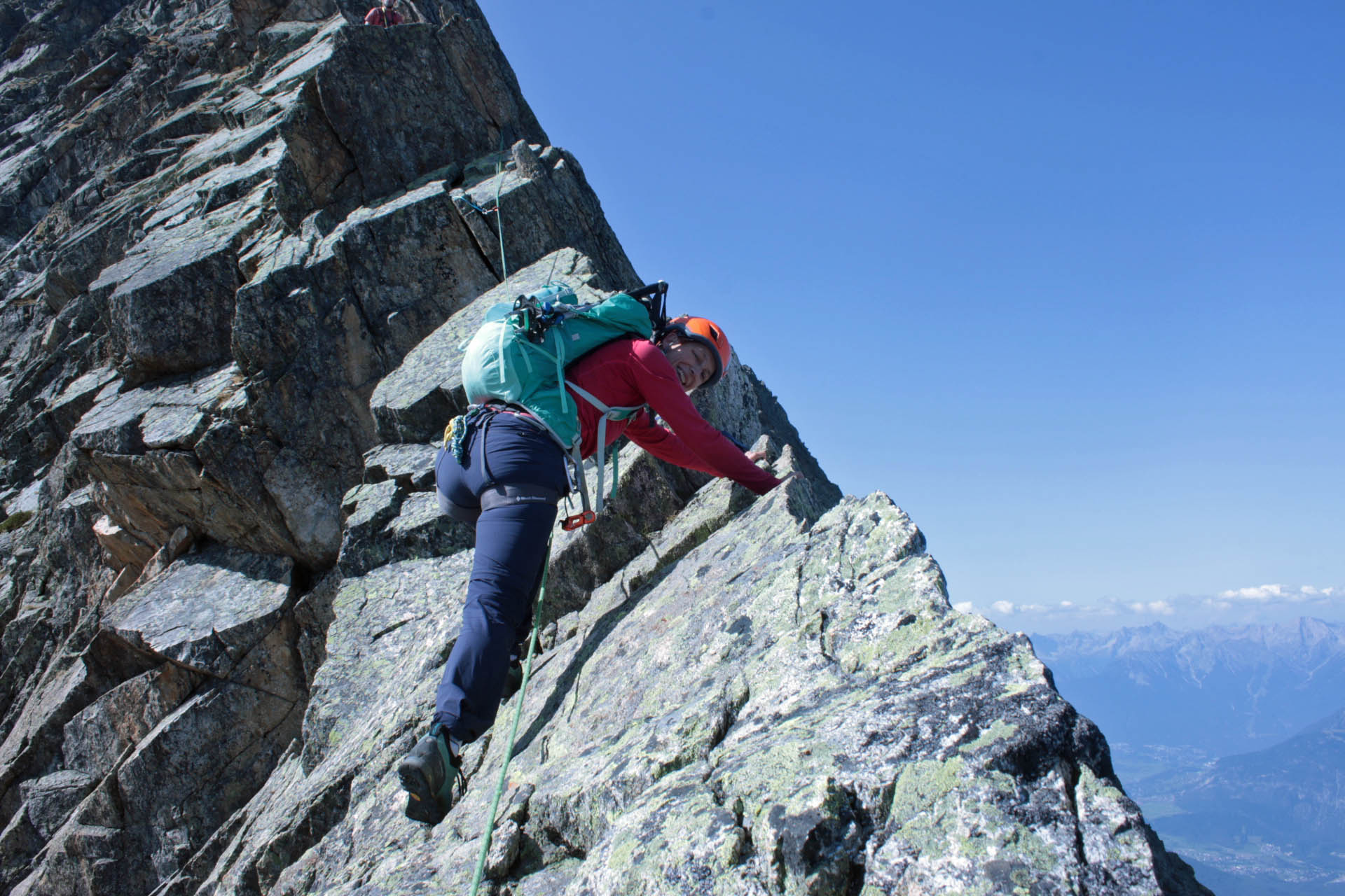 Gefahreneinschätzung: Man sollte den vierten Grat im Vorstieg wirklich beherrschen, da weite Hakenabstände. Mobile Zustatzsicherungen aber gute möglich.