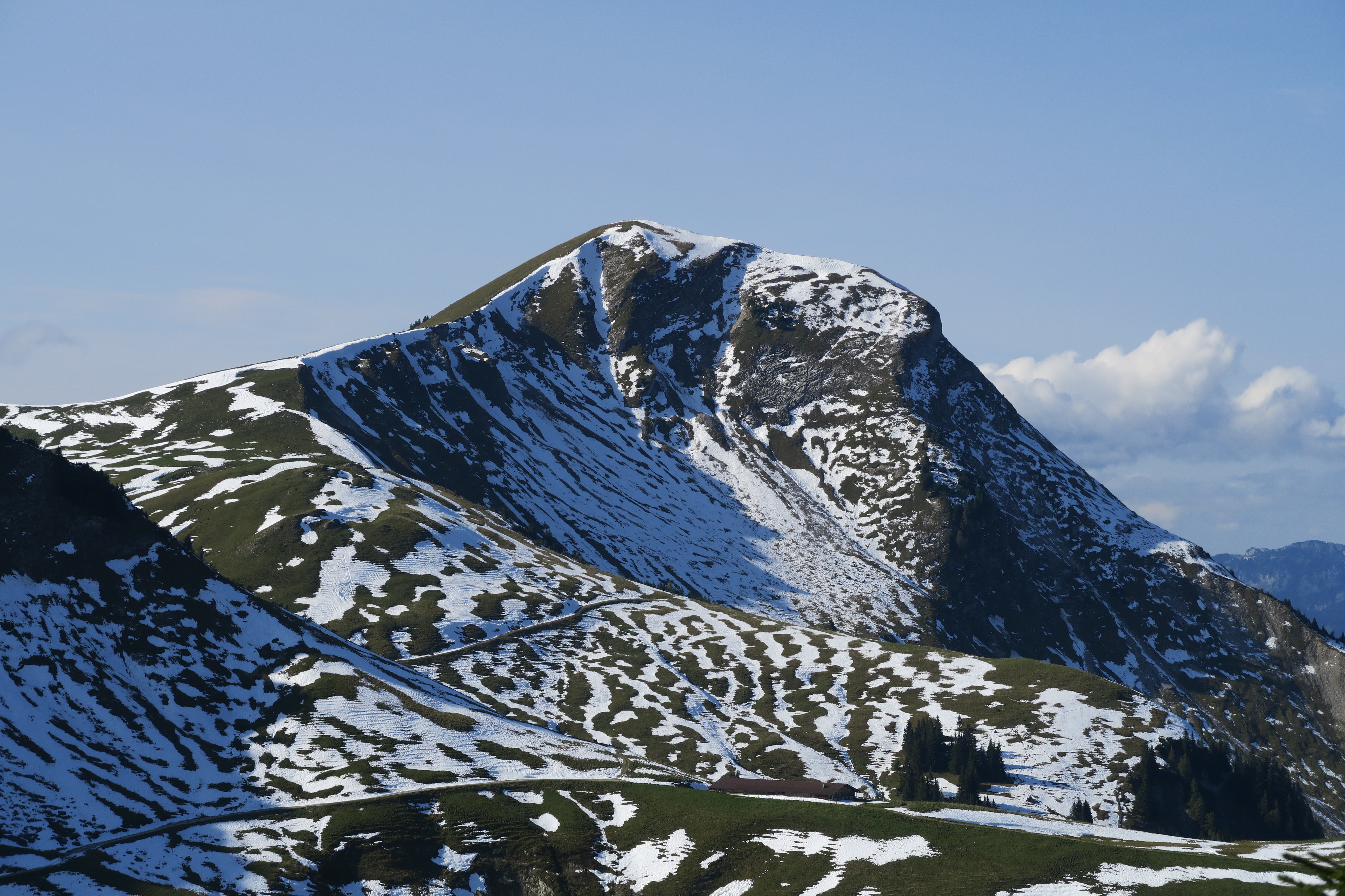 Tourenverhältnisse: Unten geht es ja über eine Forststraße, bzw. kurz auch mal über einen karrenweg. Letzterer war nass und rutschig. Oben dann - ab ca. 1600 m - noch erstaunlich viel Schnee in den schattigen Lagen. Ich habe im Aufstieg den sehr steilen Weg über den Kamm gewählt. Das war eine ganz schön rutschige, eher unangenehme Angelegenheit. Stöcke wären super gewesen......