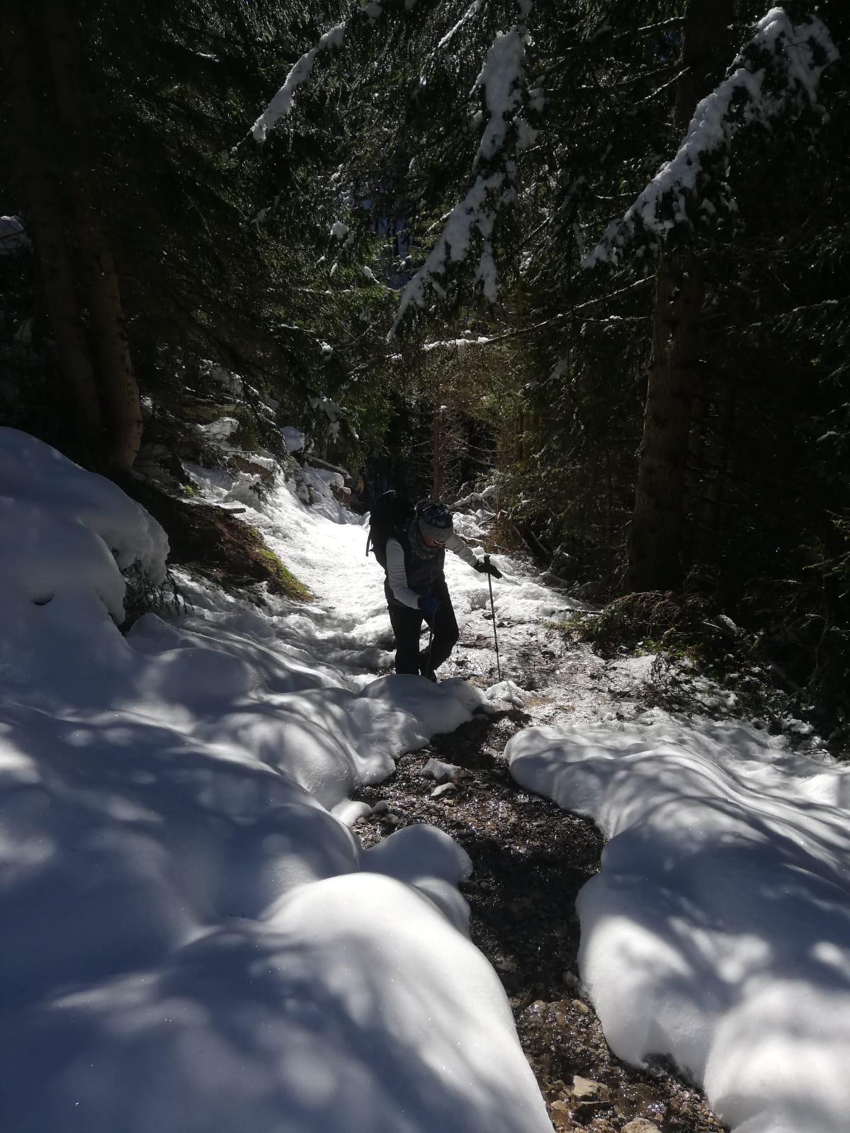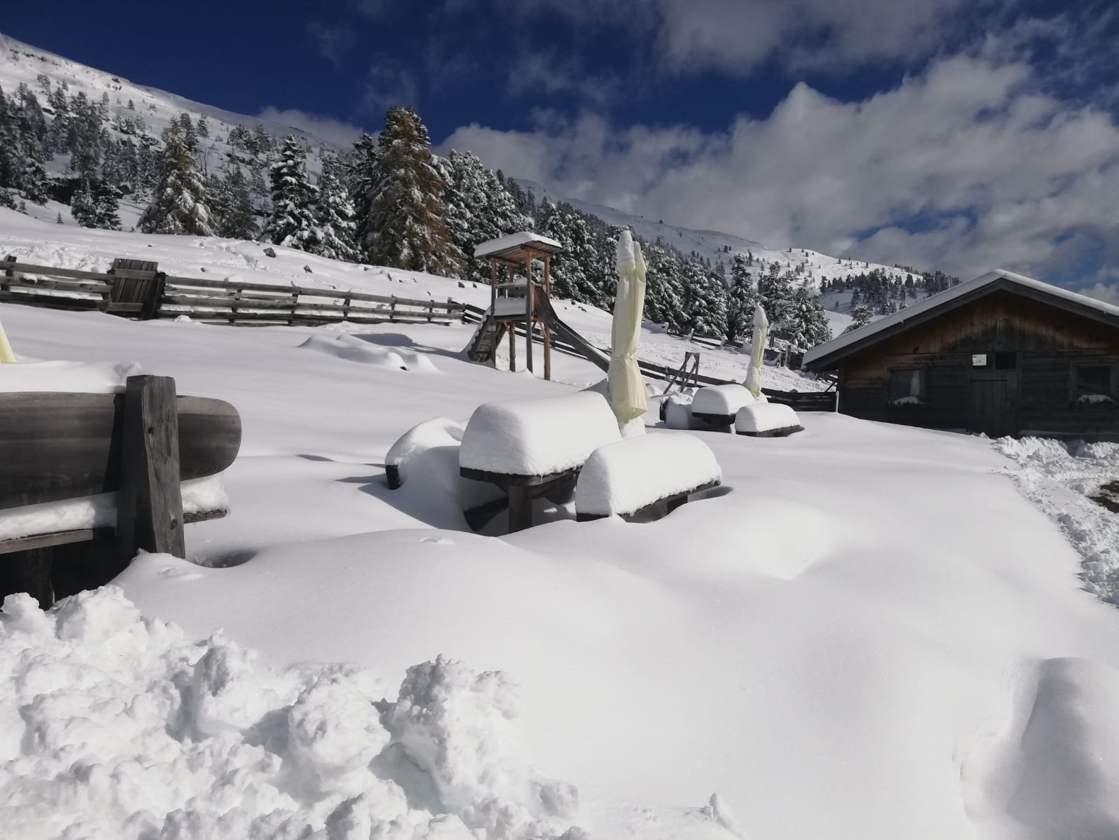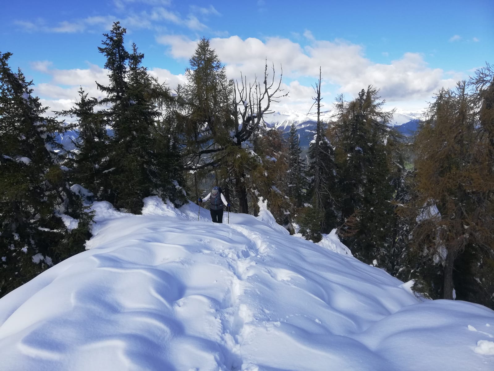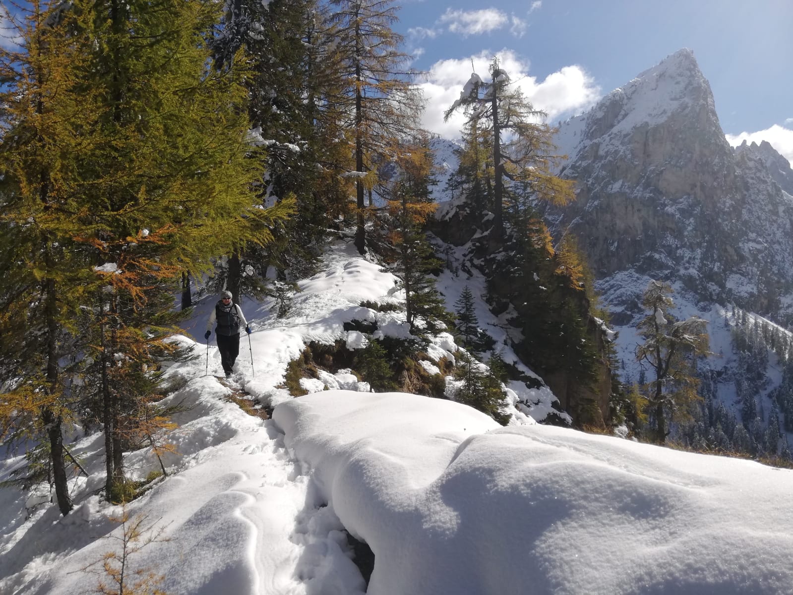 Am 13.10. von Bad Altprags (1400m) zum Buchsenriedl (= Sattel). Abstecher zur Putzalm, anschließend über den Ostgrat auf den Allwartstein und über den Westgrat hinab, Abstecher zum Badmeisterkofel (1861m)(unlohnend), auf Weg 15a über den Südwestrücken zurück nach Bad Altprags. Auch hier tiefwinterlich. Durchgehend bis zum Badmeisterkofel spuren im Pulverschnee. Erst nachmittags am SW-Rücken dann Nassschnee, nach unten zunehmend glitschig und schmierig.