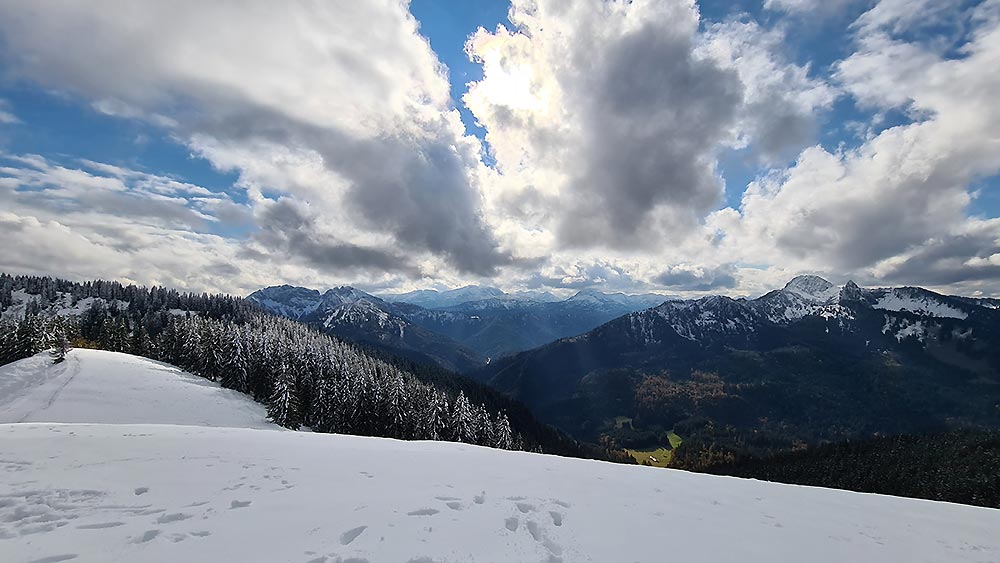 Tourenverhältnisse: Schnee ab einer Höhe von 1300 bis 1400 m. Die kleineren Wege alle sehr batzing und rutschig, bzw. weiter oben mit 10 cm Nassschnee bedeckt. Erst in Gipfelhöhe (oberhalb von 1500 m) wurde der Schnee ein bisschen trockener.