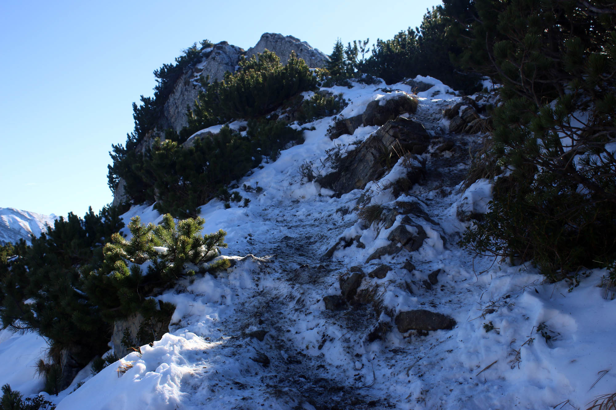 Tourenverhältnisse: Der Anstieg ist zu 90 % schneefrei. Allerdings muss man oft vereiste Wegpassagen gut im Blick haben. Denn der Schnee von letzter Woche ist häufig festgetreten und mittlerweile auch richtig eisig. Teleskopstöcke sollte man unbedingt mit dabei haben. Moderne Grödel sind derzeit auch eine sehr gute Idee.