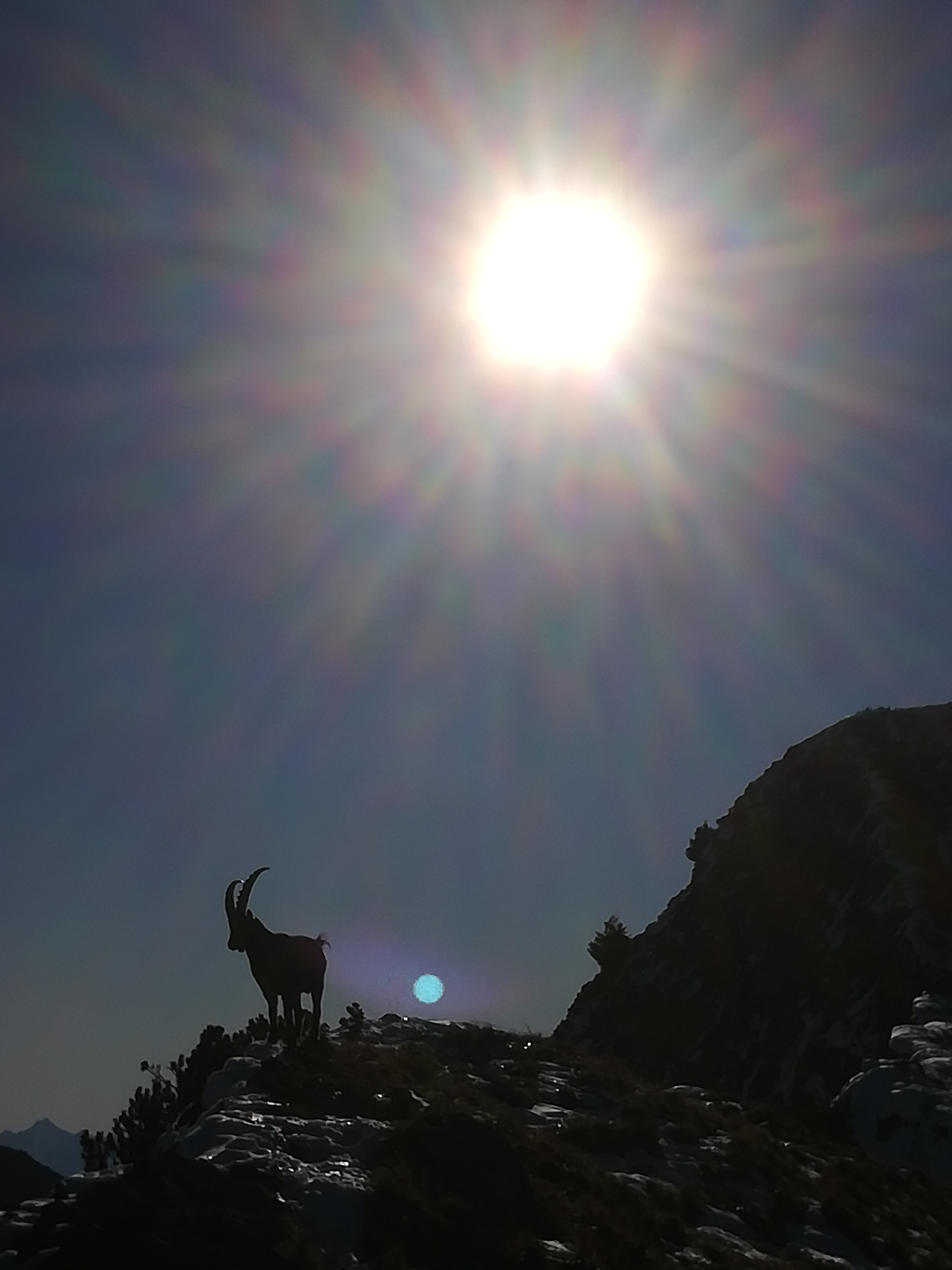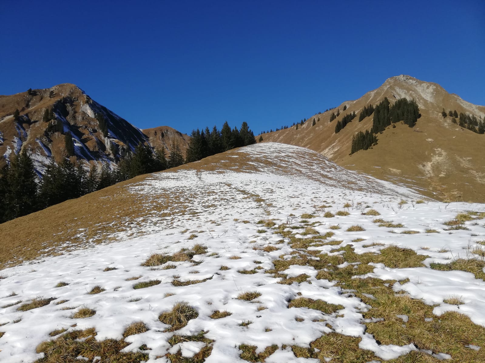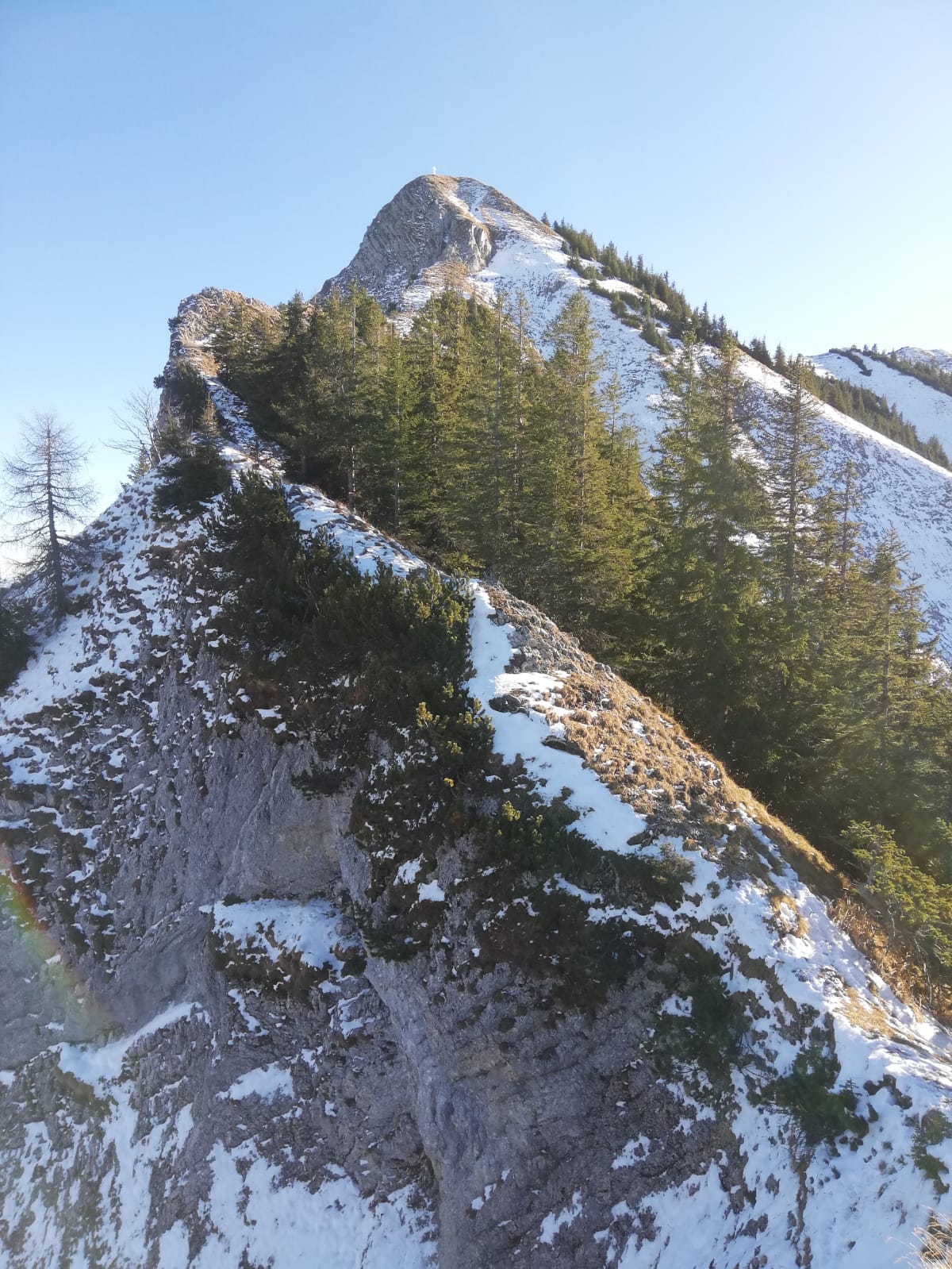 Tourenverhältnisse: Auf Forststraßen zur Gröbner Alm und weiter auf markierten Steig zum Gröbner Hals und zur Zunterspitze. Dann den Grat entlang zur Schreckenspitze und alles bis zum Gröbner Hals wieder retour. Forststraßen unten zeitweise schneebedeckt, teils auch frei, ab ca. 1200m durchgehend schneebedeckt, aber nur einige cm. Der Steig zur Zunterspitze meist schneefrei, einzelne Schnee-/Eisflecken machen es kaum schwieriger. Das gilt auch für den Grat zur Schreckenspitze, dort aber fast durchgehend etwas Schnee.