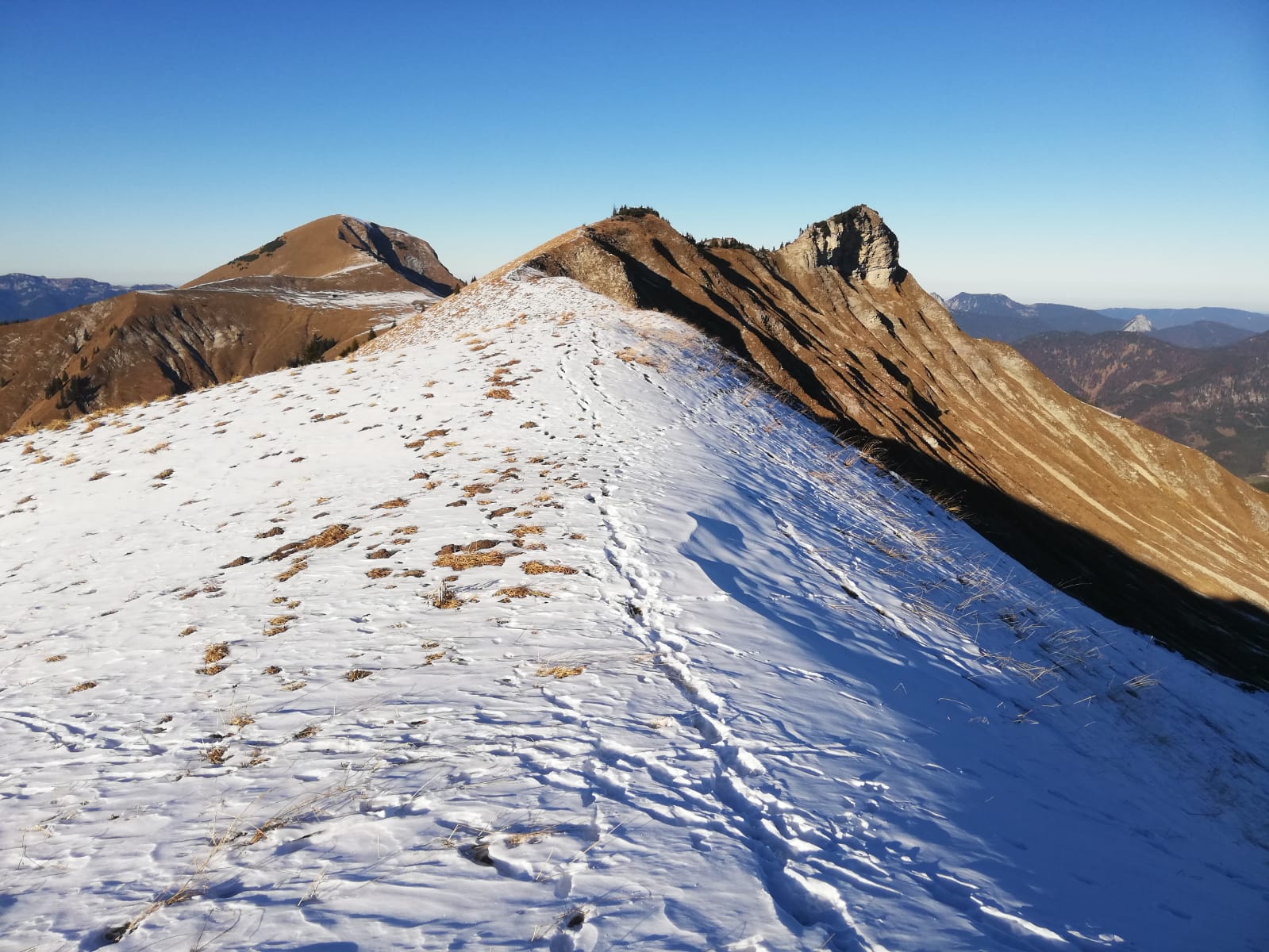 Zurück am Gröbner Hals weglos durch die schneefreien Südhänge zum Rether Joch und über den Nordostrücken einfach, aber in etwa 5cm Schnee auf den Marlkopf. Zurück zum Joch und schneefrei den Westgrat zum Rether Kopf. Ab hier immer am Grat zum Kafell und weiter zur Marbichler Spitze. Einzelne Umgehumgen von Latschen auf der Ostseite (schneefrei). Der Grat weist meistens einige cm Schnee auf, ist aber einfach. Schwierigste Stelle dann beim Abstieg von der Marbichler Spitze zum Joch: ein kurzer, sehr steiler Abbruch, mit Pulverschnee bedeckt, heikel, hier sind Grödeln sicher hilfreich. Rückweg auf Forststraße Richtung Großzemmalm, ab einer Kehre weglos im Schnee, kurzzeitig steil und rutschig auf den Sattel zwischen Hochplatte und Kafell und auf der anderen Seite weglos, aber schneefrei zur Kleinzemmalm und ab da auf Forststraßen wieder zum Auto.