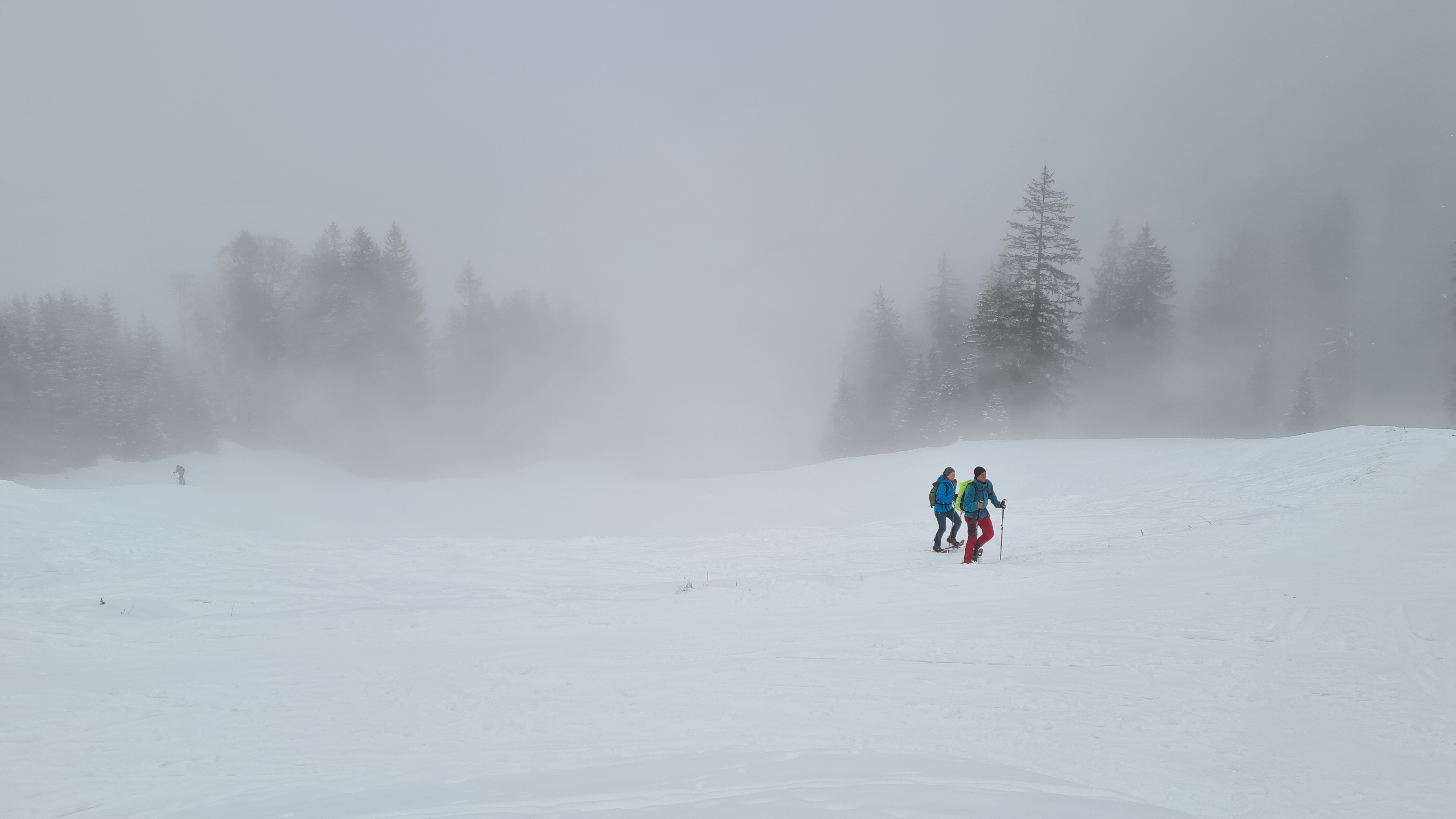 Schnee feucht, am Ausgangspunkt +2 Grad und ganz leichter Nieselregen. Auf Höhe der Kolbensattelhütte dann extrem zarter Schneefall.