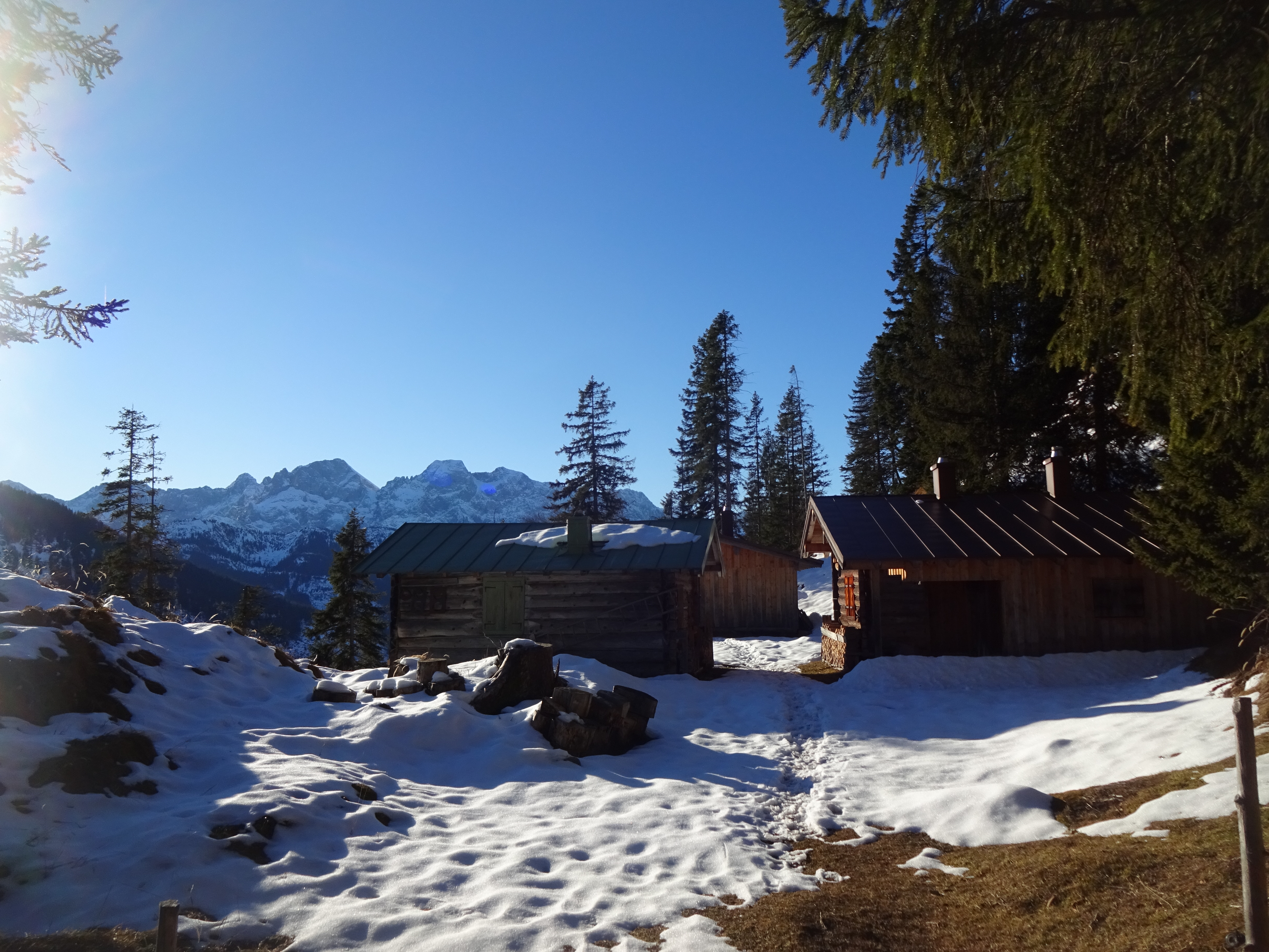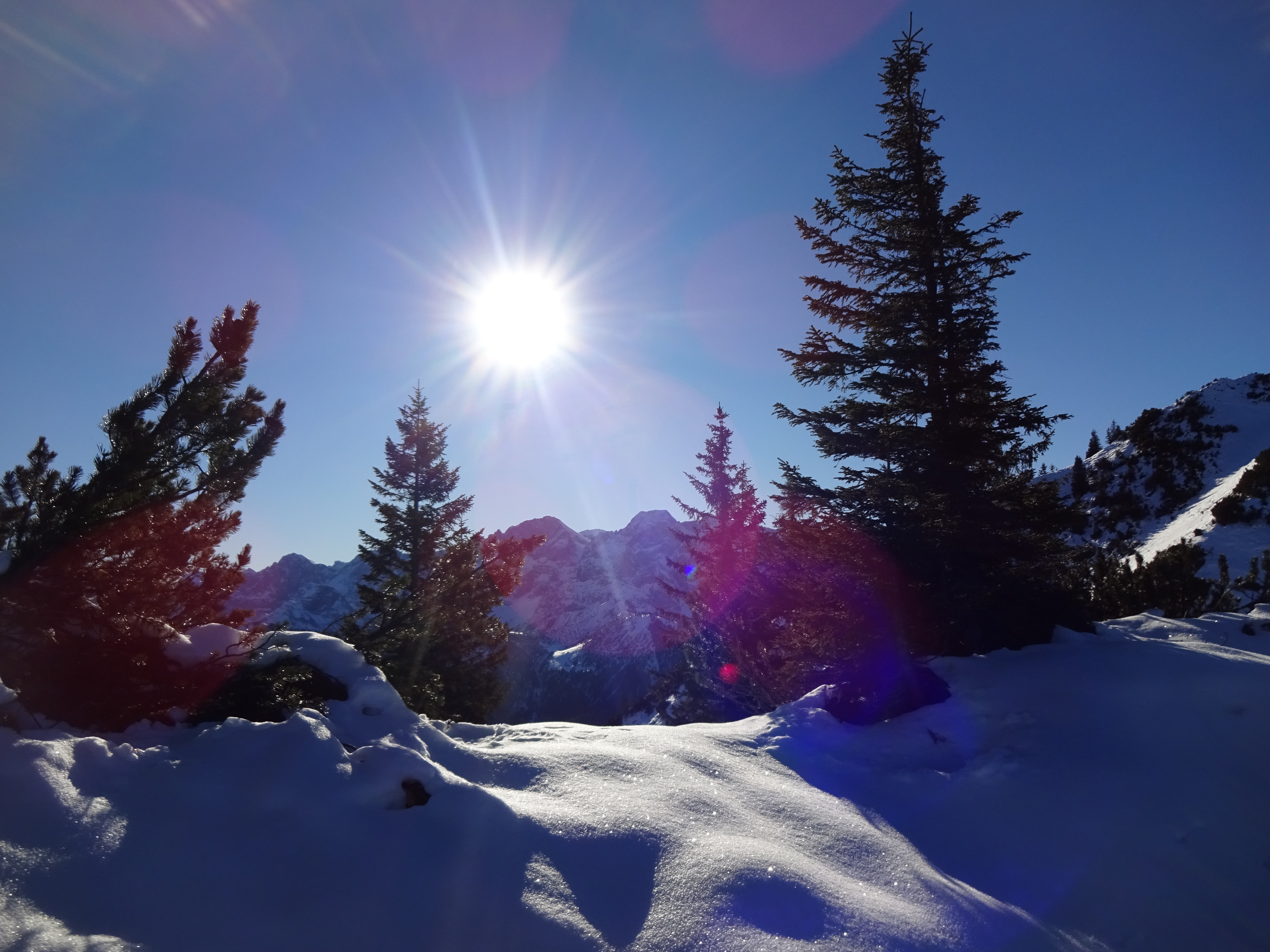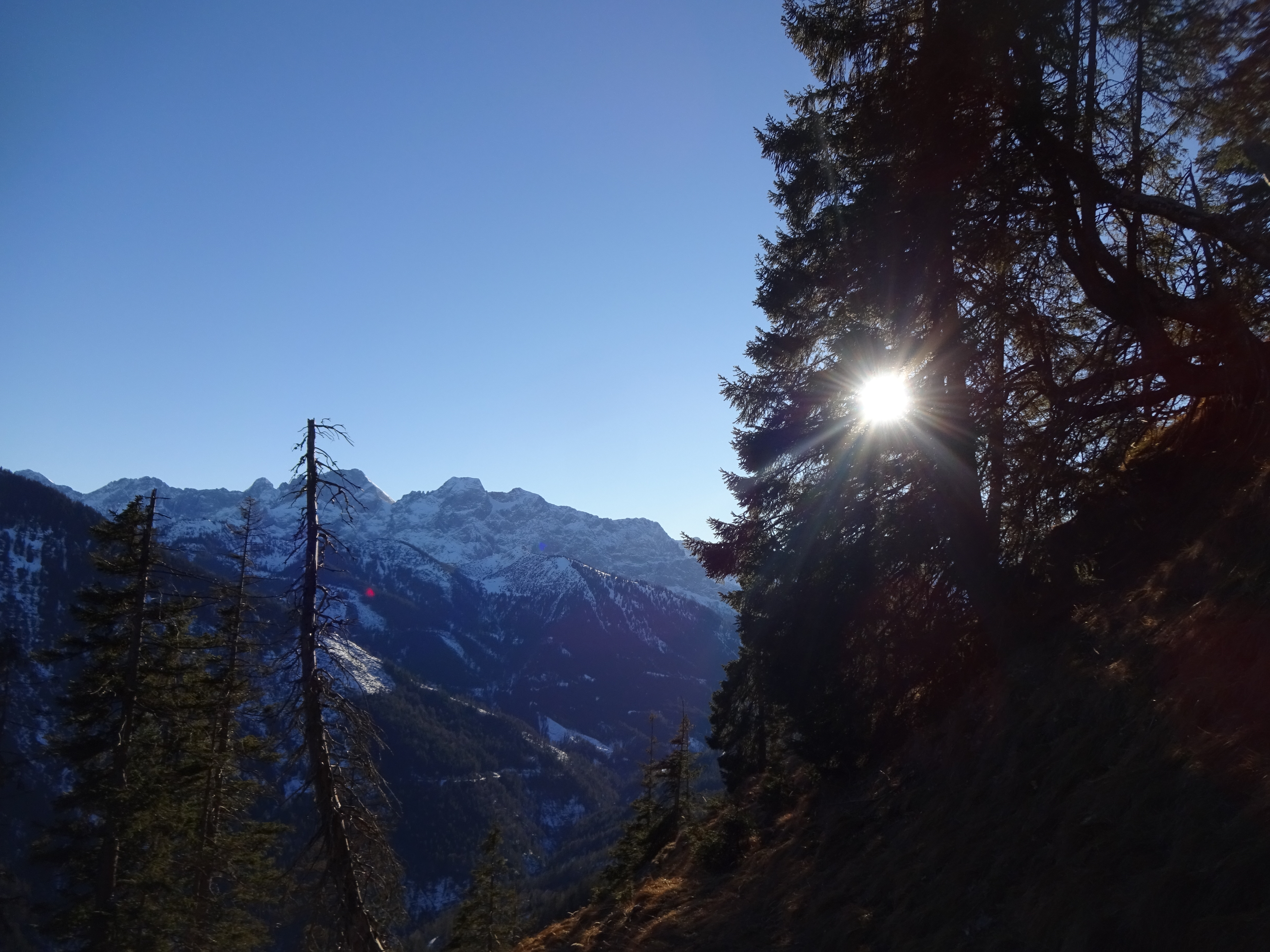 Im Risstal sehr kalt (-8 Grad um 9 Uhr), aber schon 100 Meter höher viel wärmer und oben am Kamm T-Shirt-Wetter.