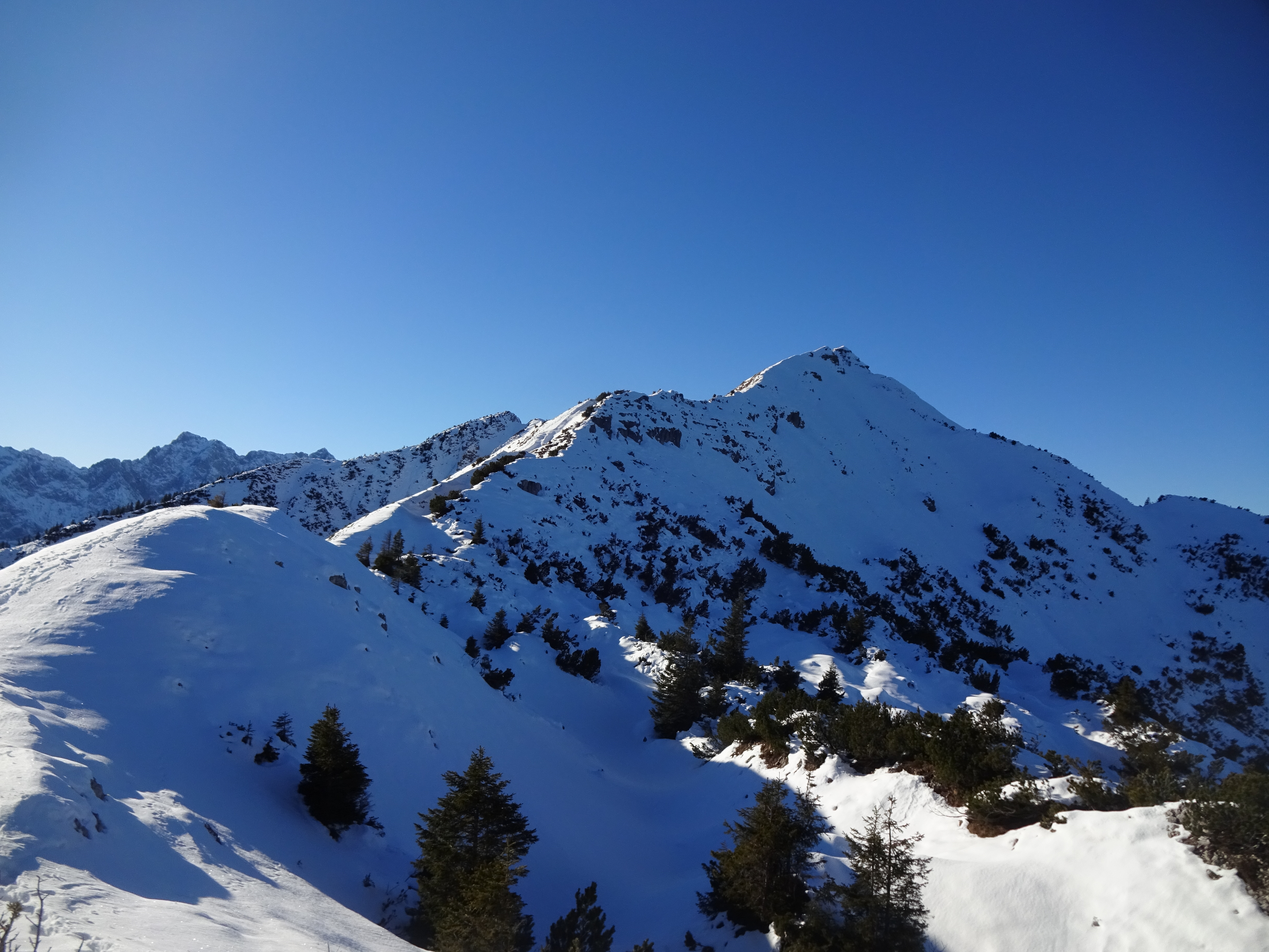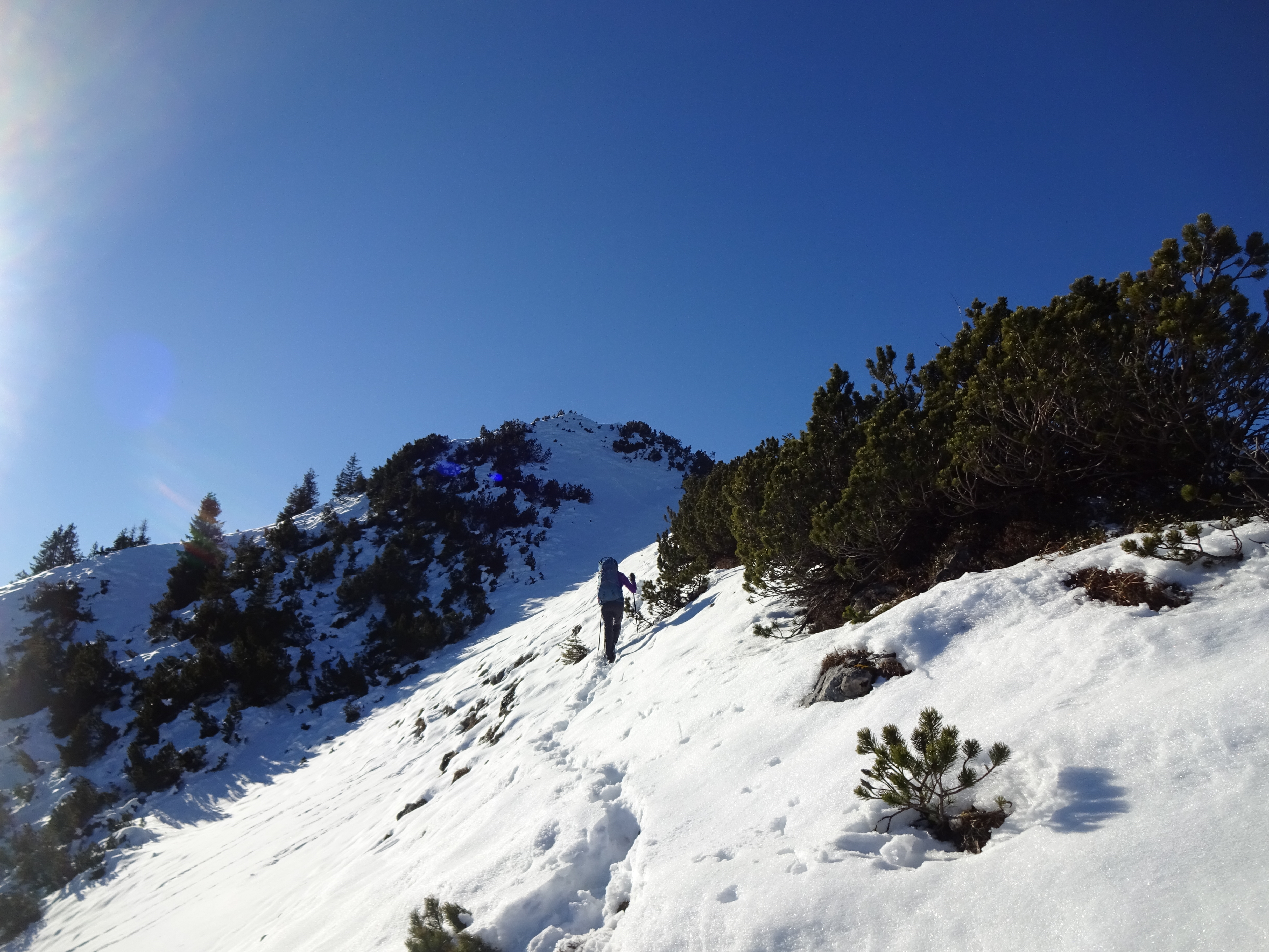 Tourenverhältnisse: Wunderbar! Eine herrliche, aussichtsreiche, winterliche Traumtour! Die Forststraße zur Paindlalm ist recht eisig, aber danach geht es bis zur Grafenherberge meist schneefrei und trocken hoch. Danach nimmt der Schnee aber mehr und mehr zu und ab dem Erreichen des Kammes gibt es im Bereich des Steigs eine geschlossene Schneedecke (zwischen 5 und 20cm). Es geht sich aber sehr fein, weder eisig noch sulzig - Grödel heute nicht nötig. Nach der Baierkarspitze könnte man noch weitergehen, aber das erschien mir nicht so ratsam, da im Bereich der Dreierspitze und in der Nordflanke der Krapfenkarspitze doch ein paar Stellen kommen, die bei den aktuellen Verhältnissen nicht ganz ungefährlich sind.
