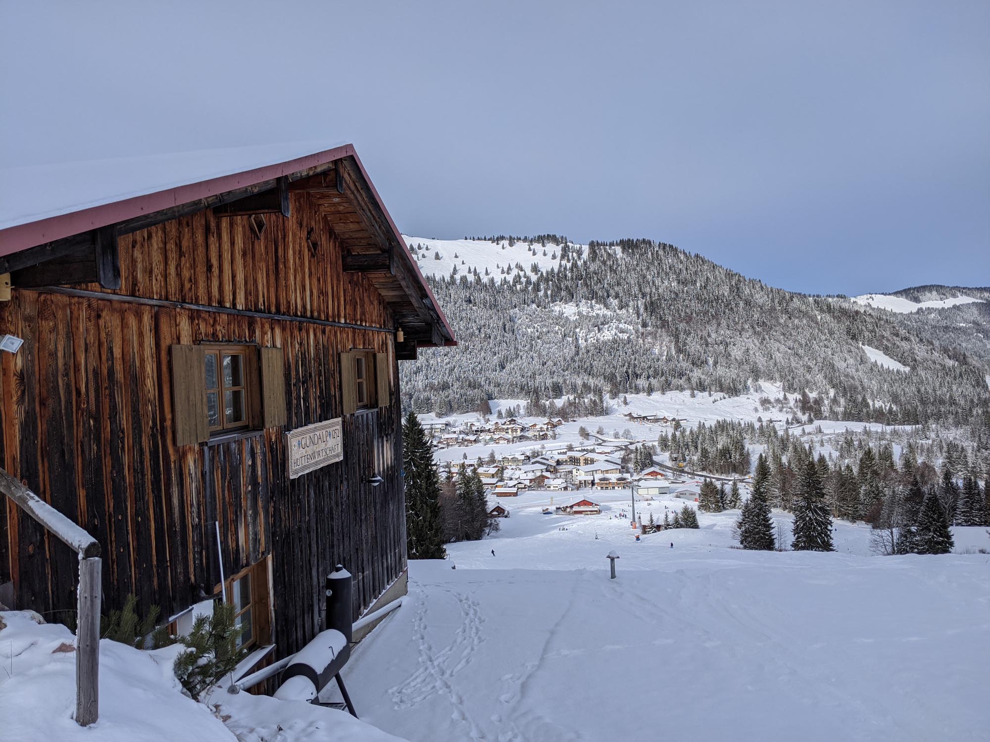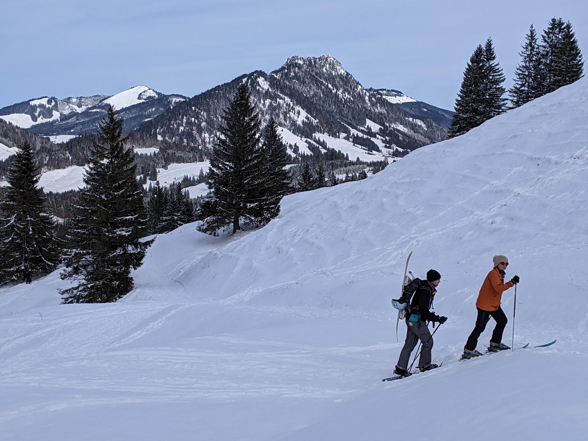 Tourenverhältnisse: Skitour im Pistengebiet. Unterhalb von ca. 1400 m war die Unterlage vor Weihnachten wieder abgeschmolzen. Aber auf den Wiesen reichte auch auf nicht beschneiten Hängen der Neuschnee von Weihnachten gerade so zum abfahren. Jedoch immer wieder Bodenkontakt. Oberhalb von 1400 m Unterlage vorhanden. Darauf herrlicher Powder, der allerdings schon stark zerfahren war. Gipfelhang wurde auch schon befahren, sollte aber eigentlich besser eingeschneit sein.