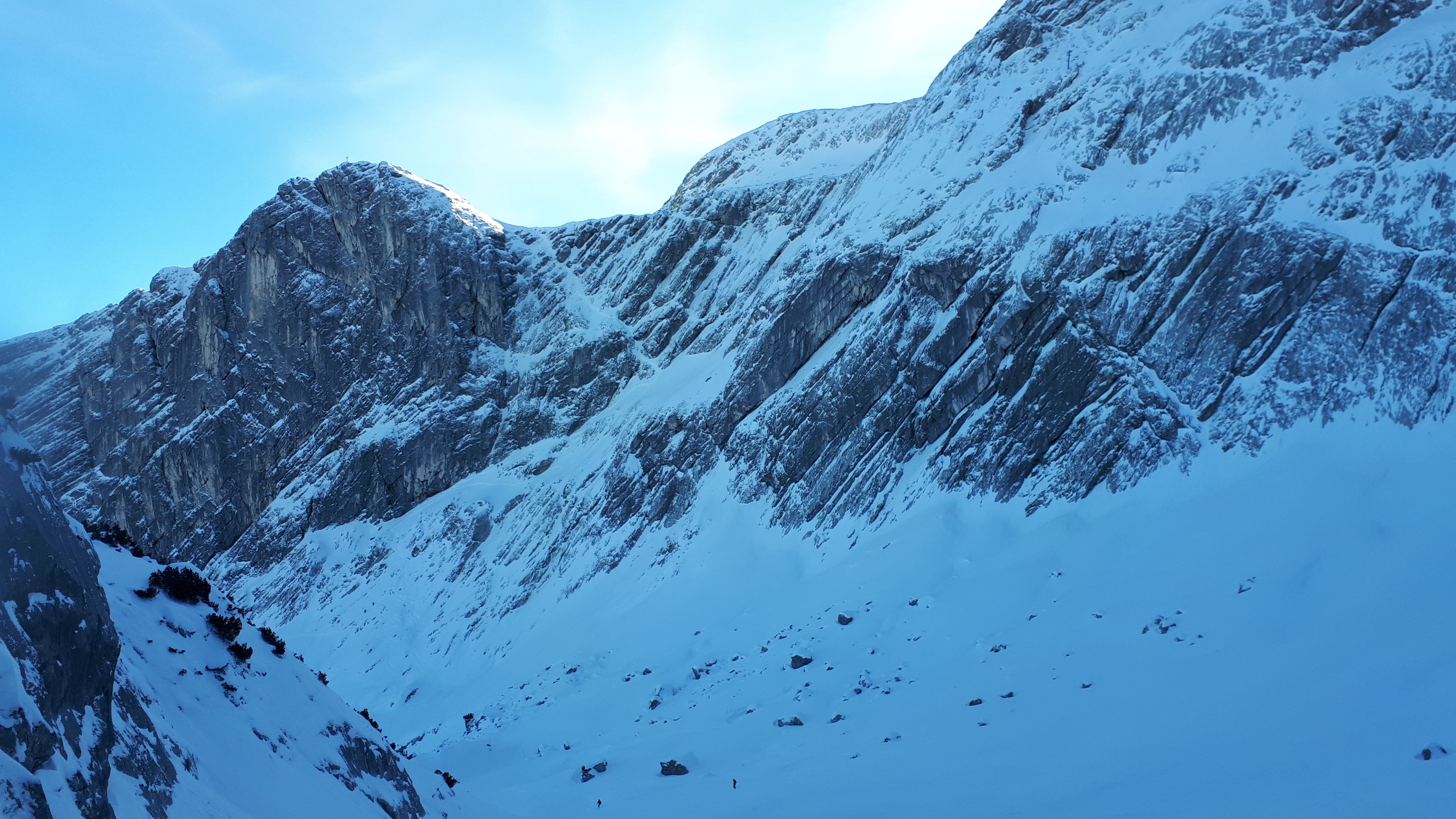 Besondere Hinweise: Gut besucht, aber noch viel Platz auf dem Parkplatz, alle Skitourengänger verteilen sich nach den ersten Höhenmetern, sehr entspannter Aufstieg auf durchweg mit Schnee bedeckter Spur, unten nicht sehr eisig und sehr gut zu gehen, oben ausreichend (Kunst)schnee. Alpspitze wurde auch besucht , sowohl über Schöngänge (Bild) als auch direkt über die Ferrata vom Osterfelderkopf.
