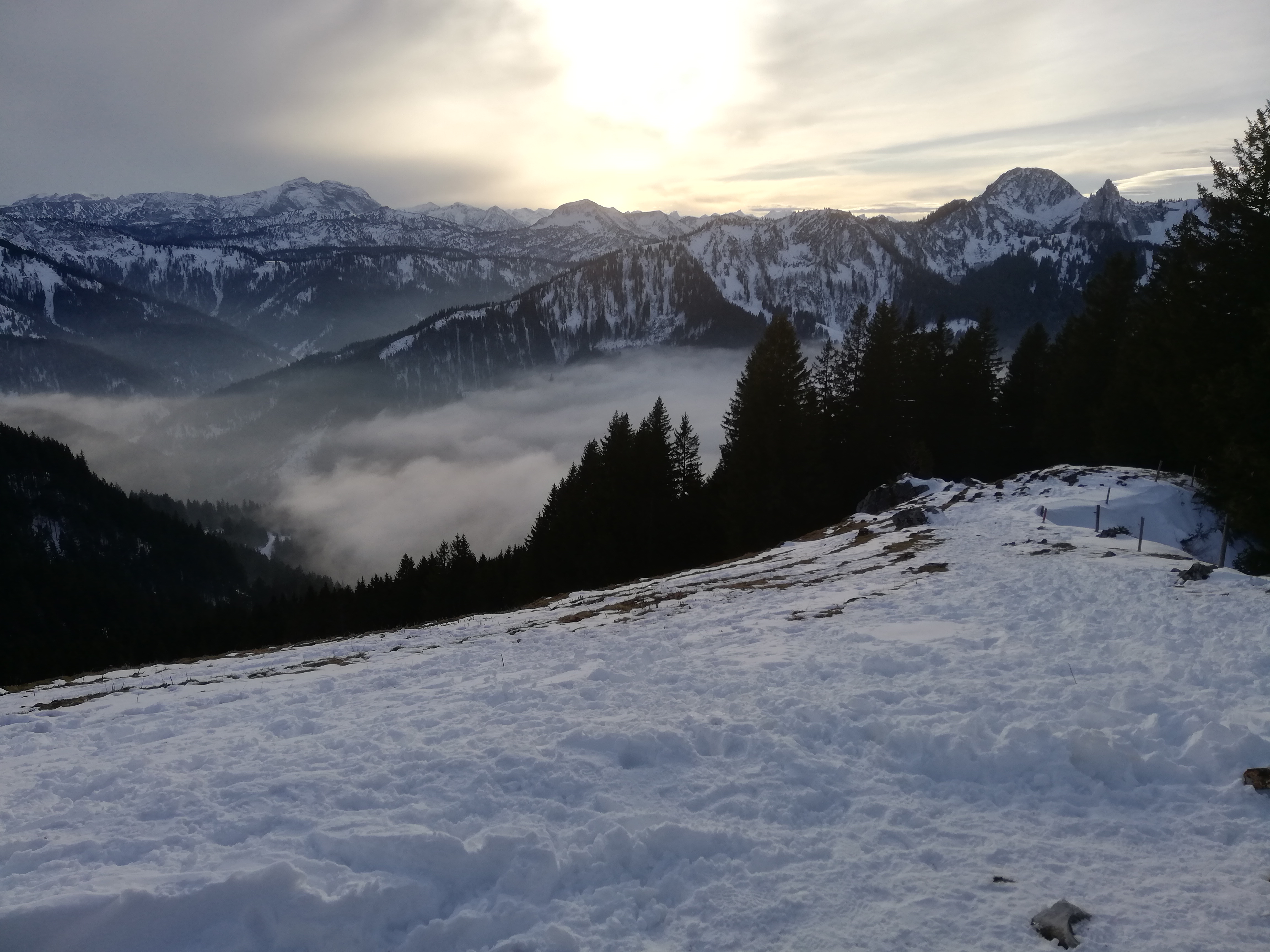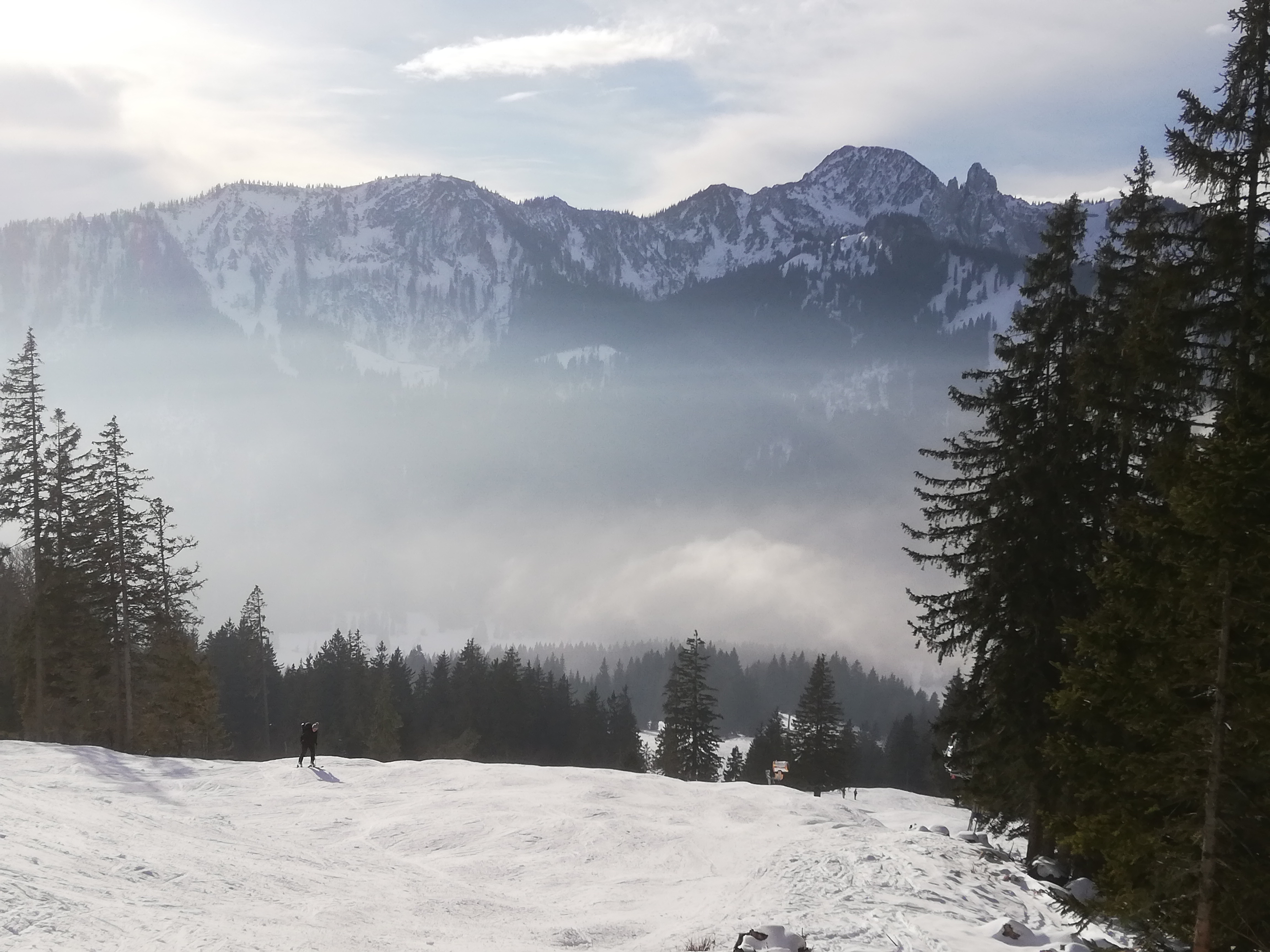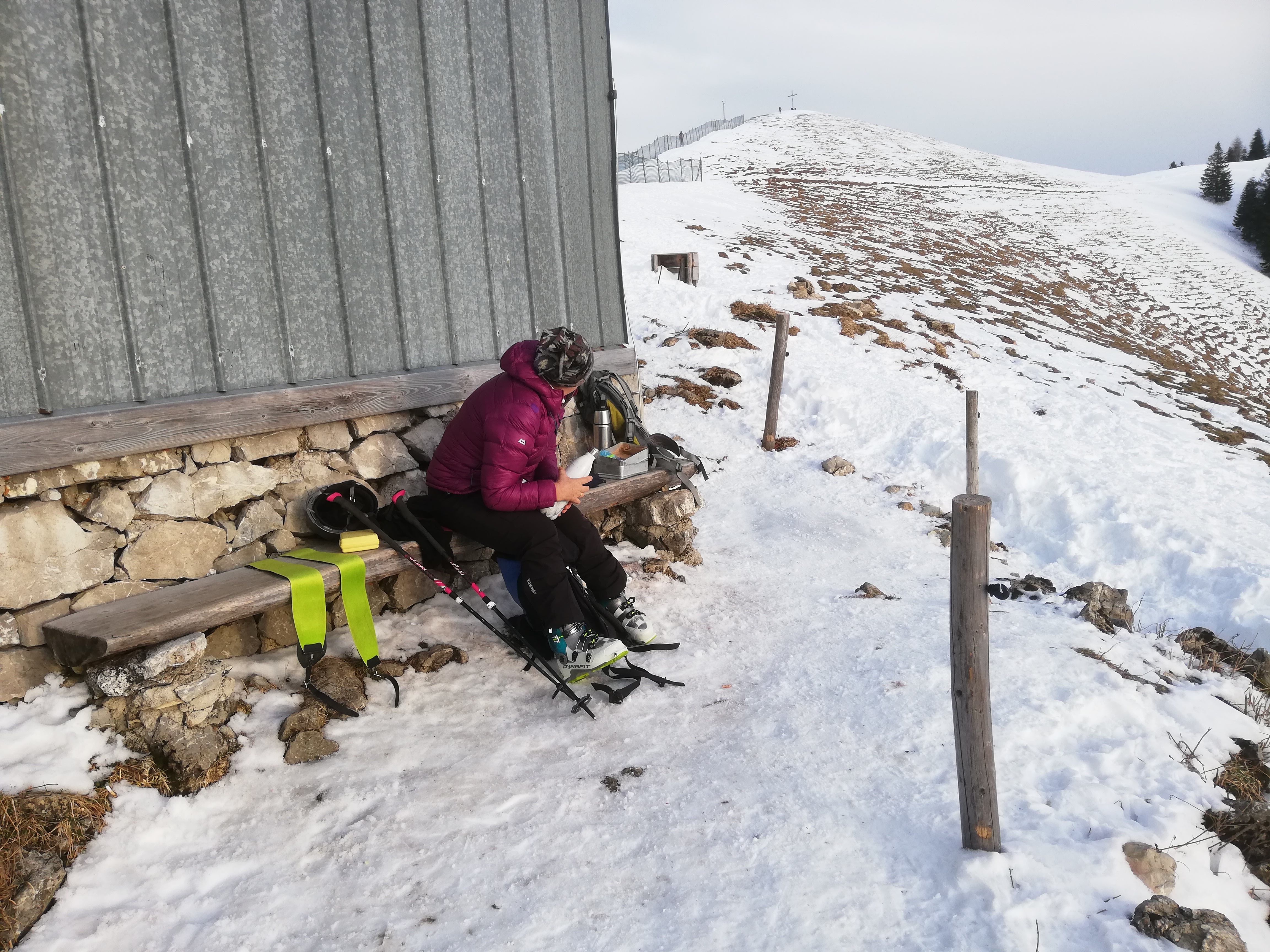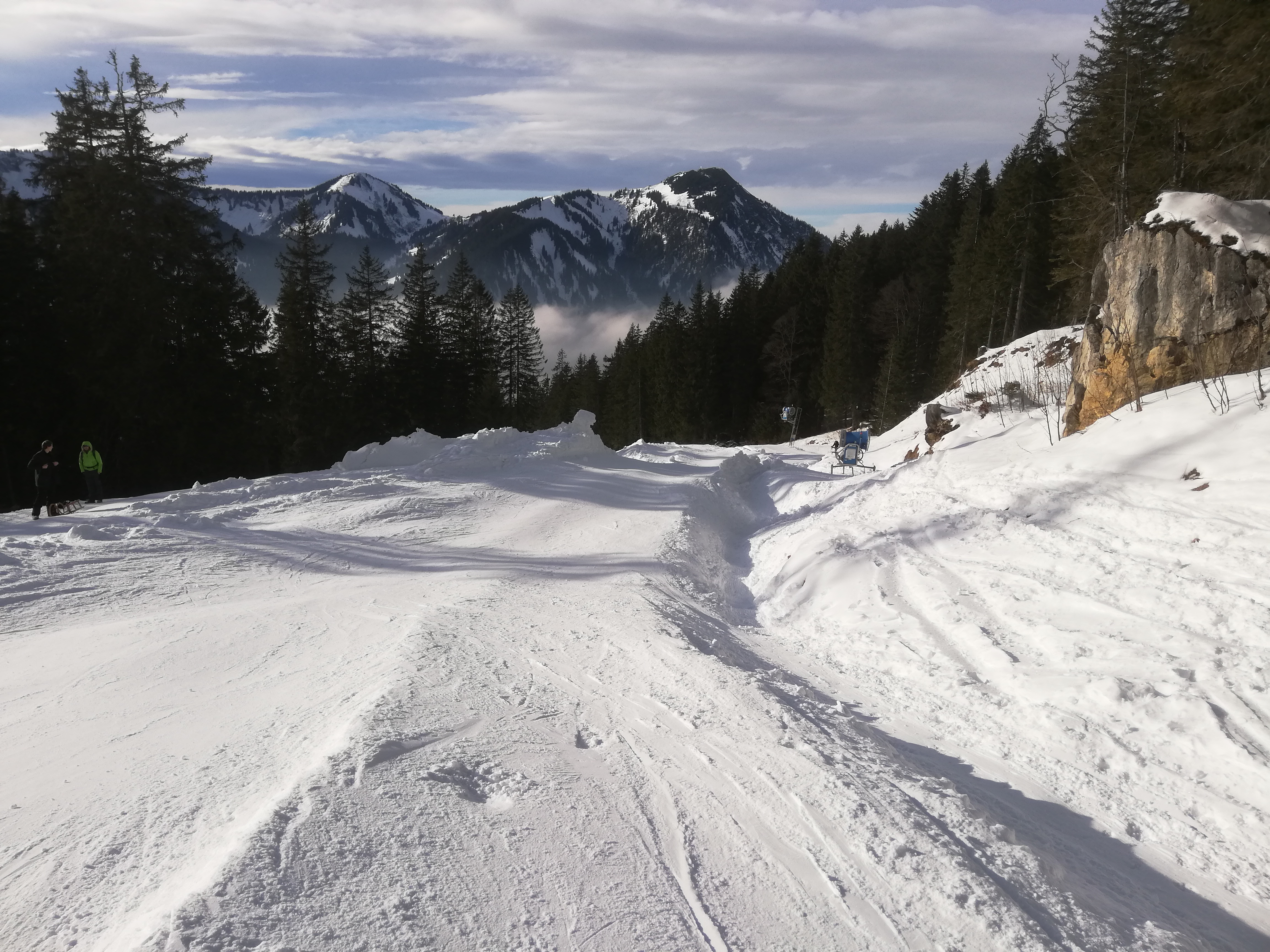 Tourenverhältnisse: Auf der Piste dank Kunstschnee gut, neben der Piste nur im Aufstieg möglich. Auf Steine muss man nur am Gipfelrücken und unterhalb der Stümpflingalm etwas aufpassen.
