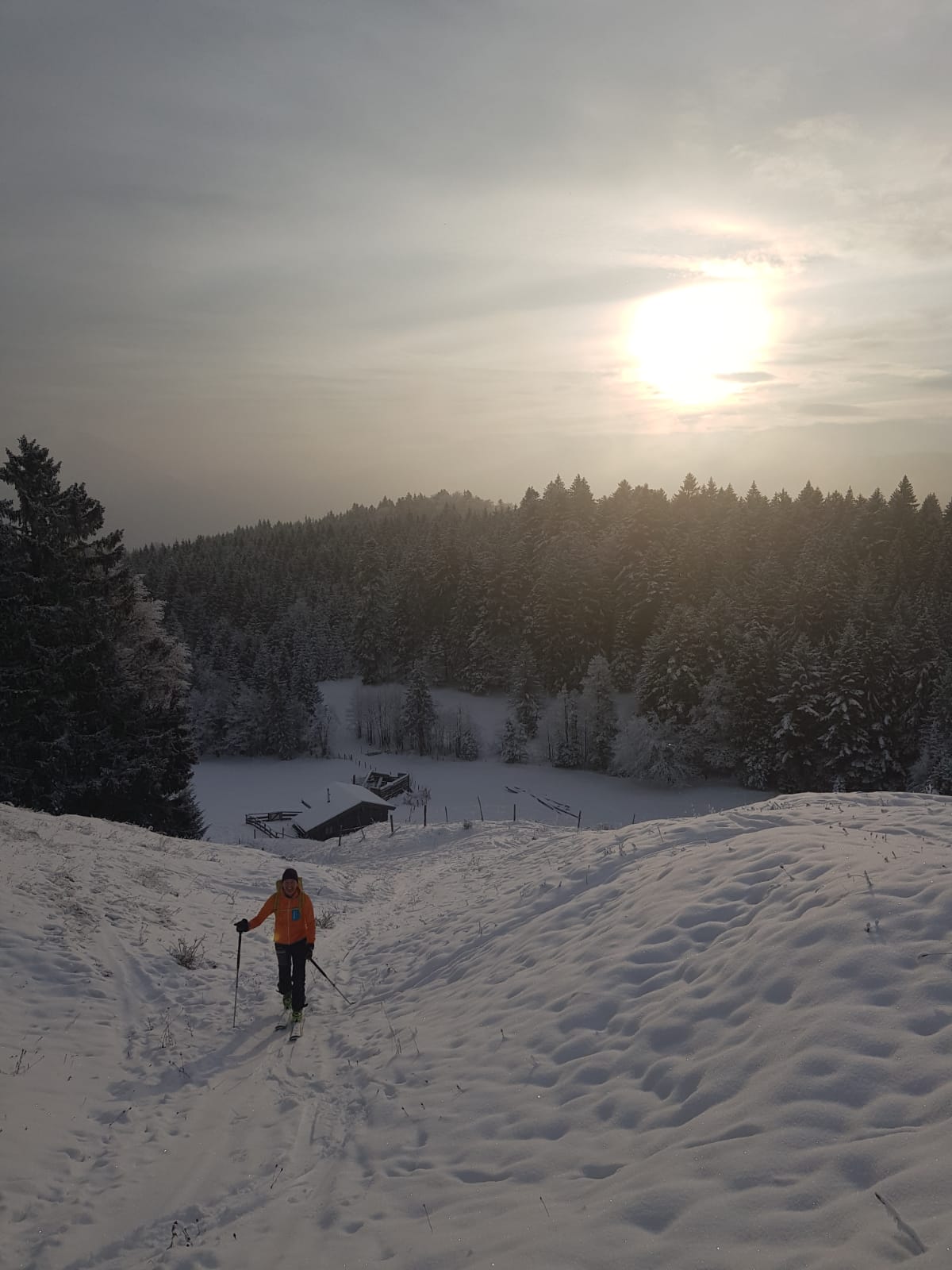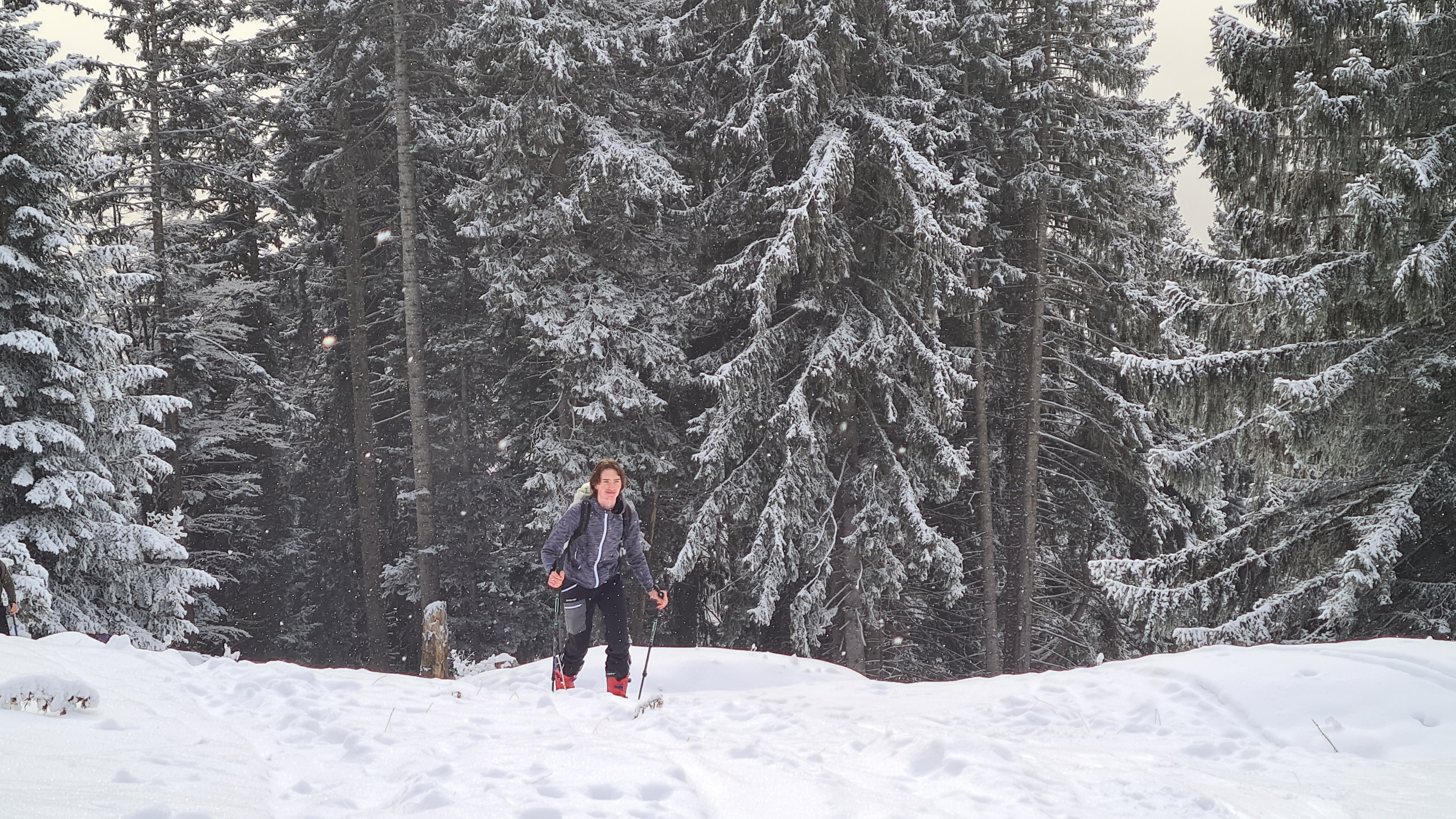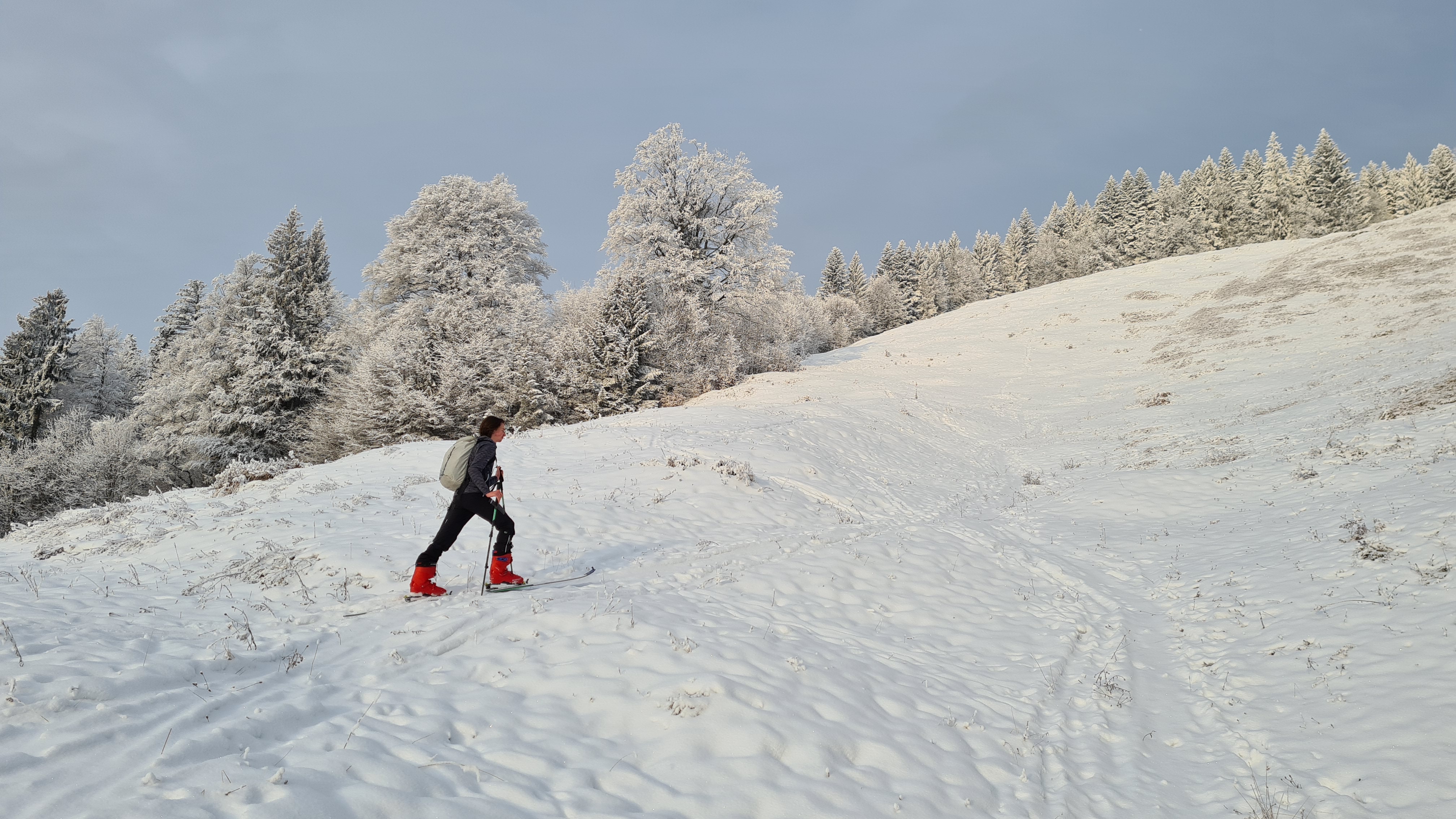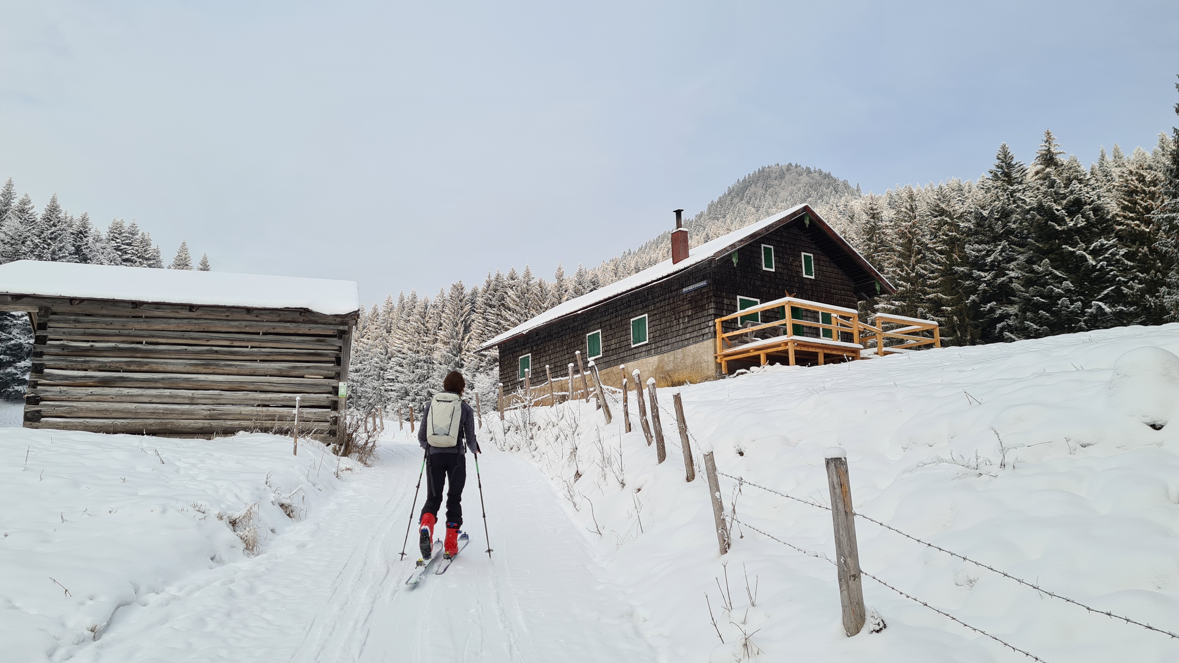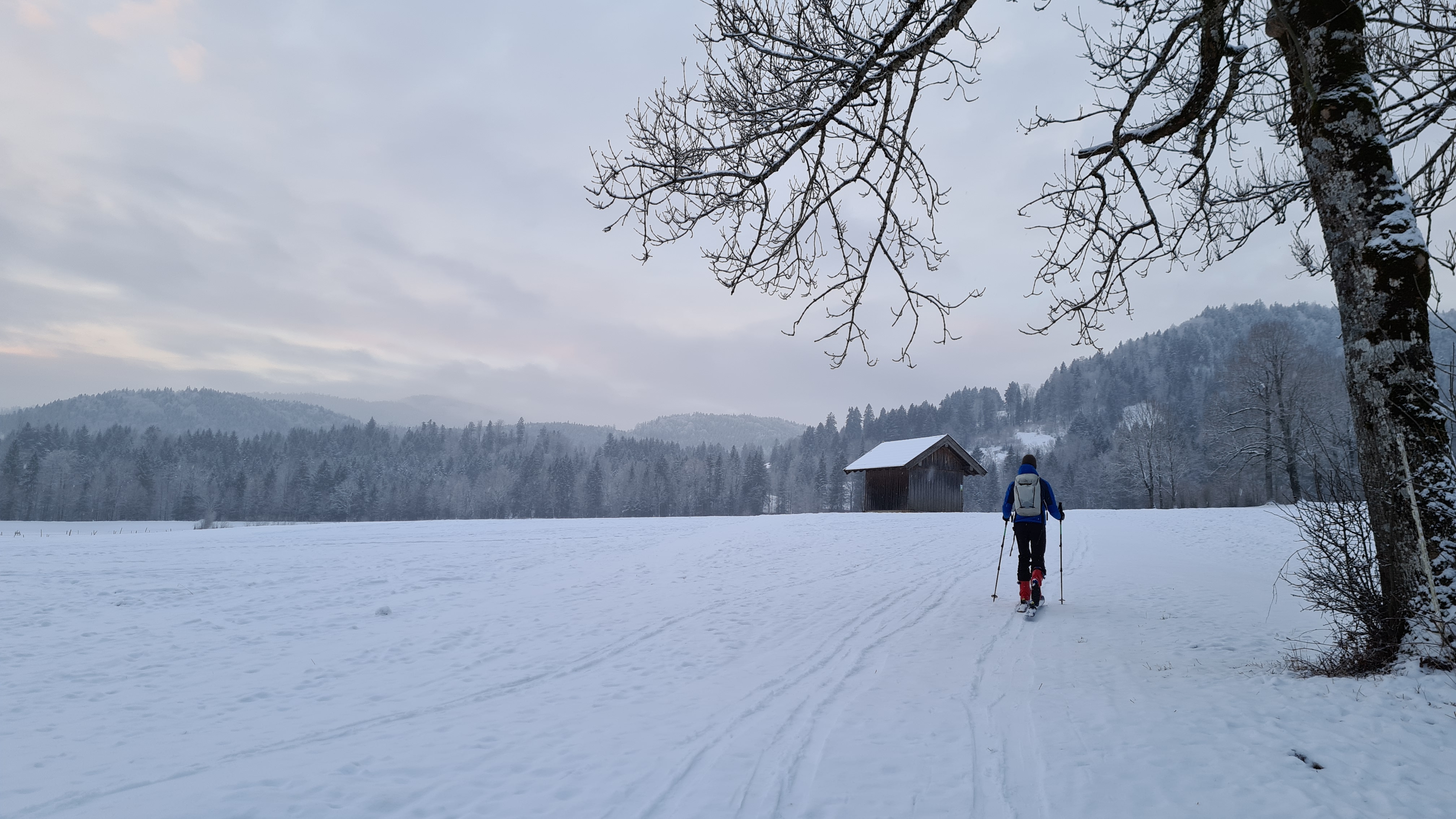 Tourenverhältnisse: In Lenggries hat es weniger Neuschnee als z.B. am Münchner Stadtrand. Mehr als 5 cm waren es heute Vormittag nicht. Dennoch haben diese 5 cm die Verhältnisse deutlich verbessert. Es gibt jetzt auf Route 3 keine Tragestellen mehr und auch im Wald ist es weniger eisig.