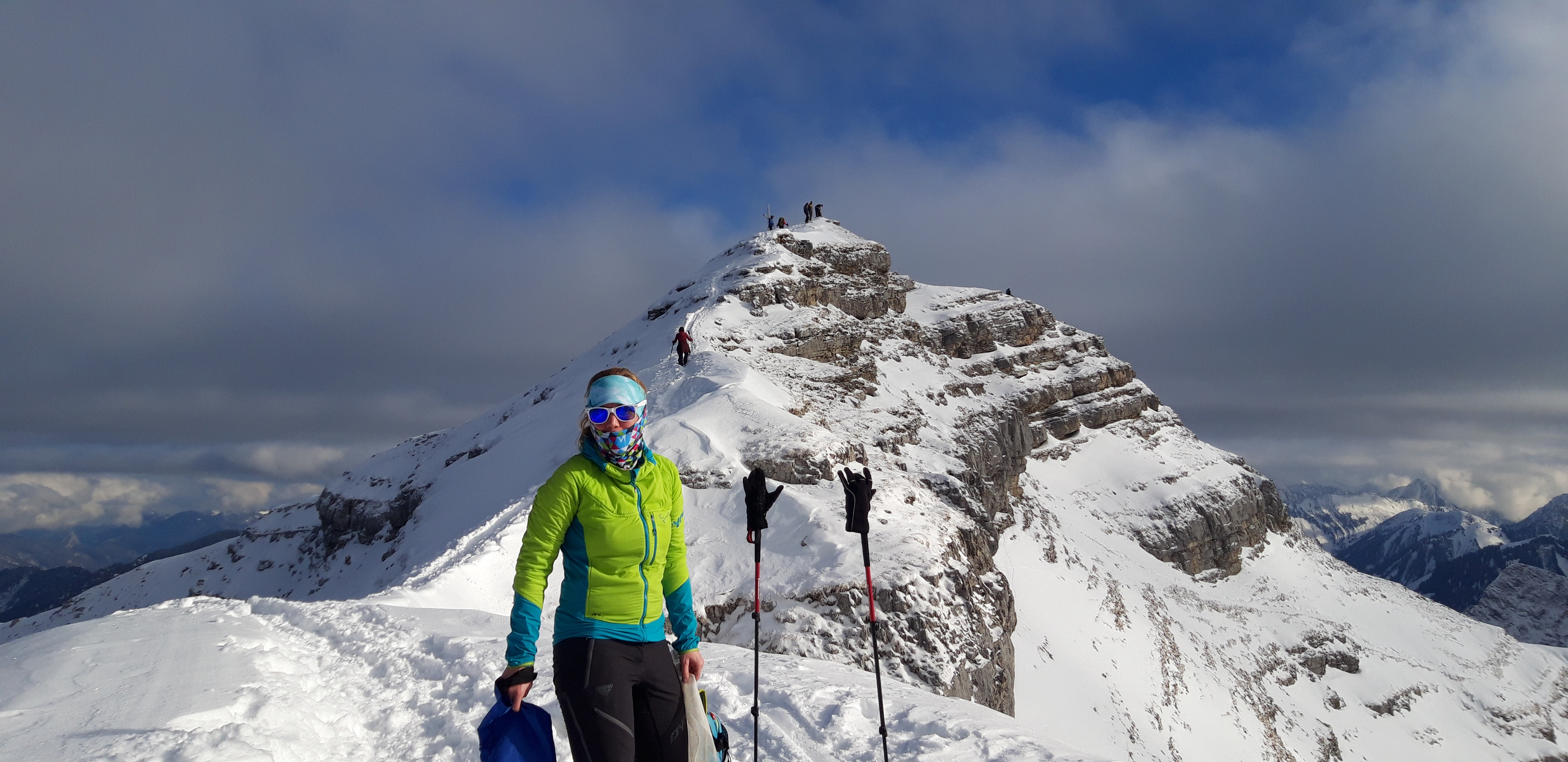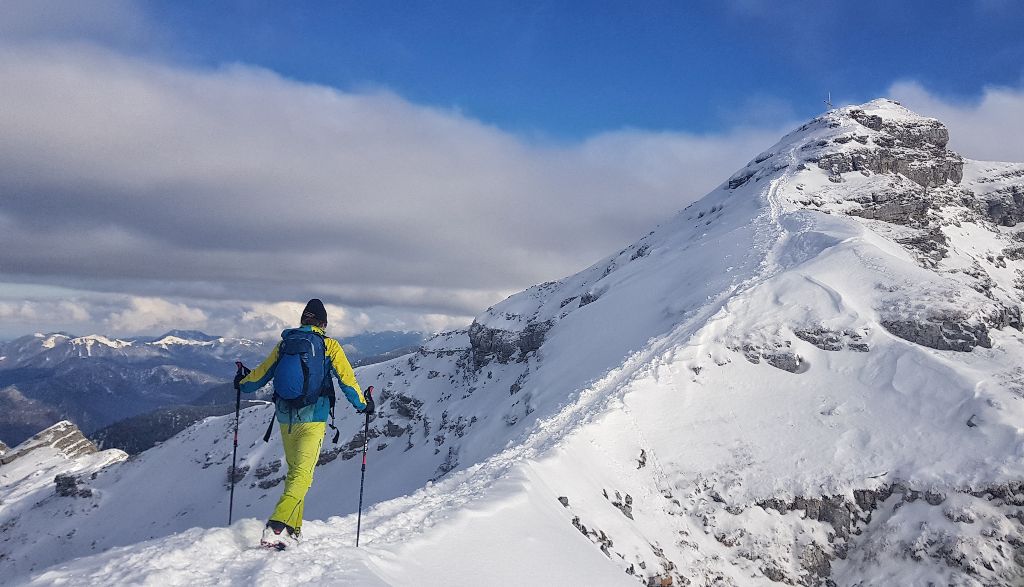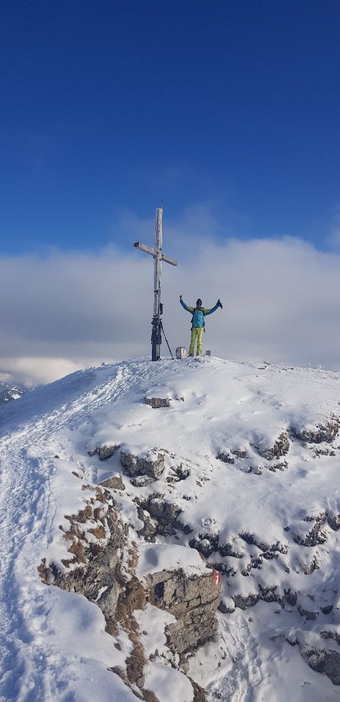 Tourenverhältnisse: Ordentlich. Man kann von der Straße weg mit den Skiern los und es gibt keine Tragestrecken. Wir sind der beschilderten Skiroute (Forststraße bis Mooslahner-Alm, dann im freien Gelände) gefolgt; gespurt war schon. Der Aufstieg ist grundsätzlich gut zu machen, nur an wenigen Stellen wird es wegen zu wenig Schnee ein bisserl hackelig. Der große Gipfelhang hat eine ziemlich harte Unterlage, auf der wenige Zentimeter Neuschnee liegen. Heute ging es auch ohne Harscheisen gut, aber vermutlich wird die Spur mit zunehmender Nutzung glatter, sodass man die Eisen mithaben sollte. Die letzten Meter zum Gipfel wie üblich zu Fuß. In der Abfahrt können mit umsichtiger Fahrweise gröbere Steinkontakte vermieden werden - hört sich vielleicht jetzt ein bisserl negativ an, aber uns hat die Abfahrt heute gut gefallen! Wir sind bis Mooslahner gefahren und haben dann die Ski auf der Forststraße an den Rucksack getan. Man kann die Straße natürlich auch abfahren, aber dann muss man entweder immer wieder ab- und anschnallen oder man nimmt gröbere Belagschäden halt einfach in Kauf. Mehrfach liegen nämlich kleinere und nicht ganz so kleine Steine auf der Straße herum.