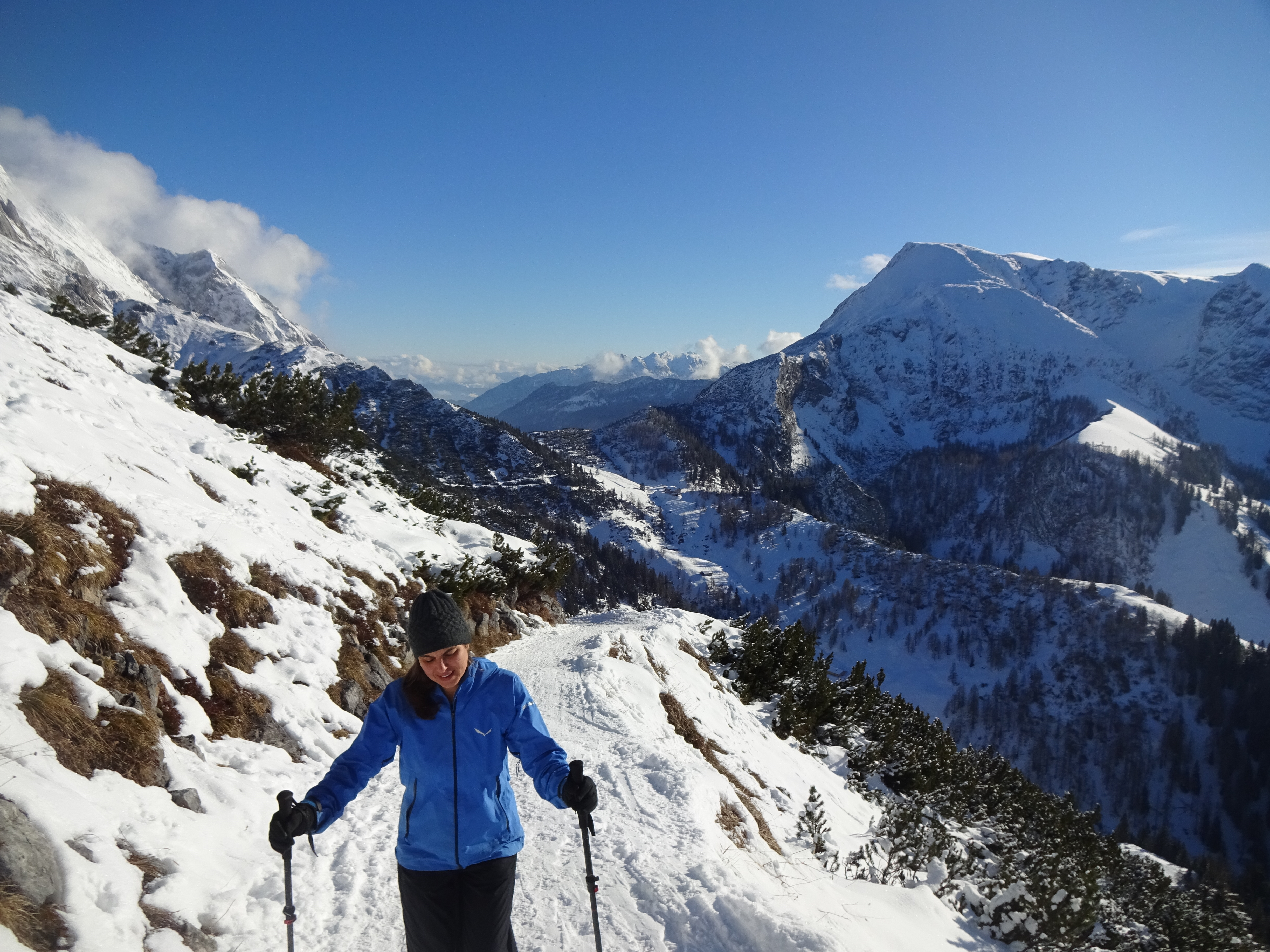 Tourenverhältnisse: Ganz ausgezeichnet. Eine Traumtour bei fantastischem Wetter heute! Wir sind von Hinterbrand zunächst zur Mittelstation der Jenner-Bahn (Pisten in beneidenswertem Zustand - perfekt präpariert, aber leider nur für Profisportler geöffnet...) und von dort auf dem normalen Weg (Forststraße) zum Jenner. Danach ging es via Stahl-Haus auf den Schneibstein. Abstieg über Stahl-Haus, Schneibstein-Haus und Königsbachalm; dieser Abstieg empfiehlt sich aufgrund der westseitigen Ausrichtung, da man so noch lange in den Sonne gehen kann. Auf der Route liegt durchgehend Schnee, aber es ist nie eisig oder glatt - es geht also auch ohne Grödel (mit aber besser). Schneeschuhe braucht man nicht, da die Wege bis zum Stahl-Haus sehr gut verfestigt sind und auch der Weiterweg zum Schneibstein nur an wenigen Stellen Verhältnisse aufweist, die Schneeschuhe sinnvoll machen. Am Gipfelhang gibt es zudem unter ein paar Zentimetern Pulver eine sehr harte Altschneeschicht, die für Schneeschuhgeher ungünstig ist. Zwei Schneeschuhgeher haben kurz unterhalb des Gipfels wohl deswegen umgedreht, wie wir den Spuren entnehmen konnten (, wobei ich persönlich ja glaube, dass die einfach nicht wussten, dass sie nur noch 15 Minuten vom Gipfel entfernt sind - das Kreuz sieht man ja erst ganz am Schluss...)
