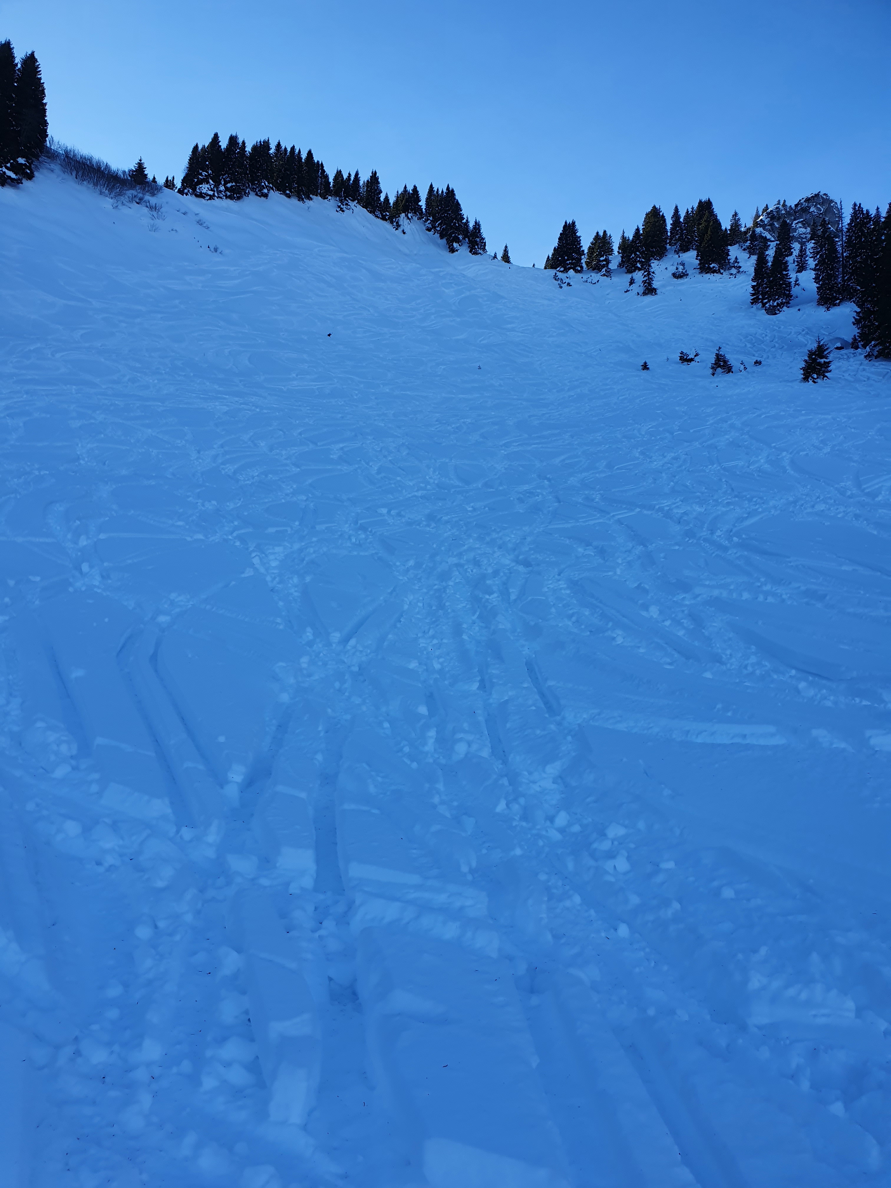Gefahreneinschätzung: bei Stufe 2 nach Bauchgefühl die letzten Meter weggelassen, Schneebruch Bäume: gering da abgeblasen