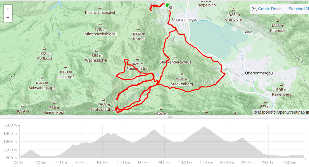 Meine Tour (siehe Streckenprofil) startet an der Winterrodelbahn Unterammergau (nicht die beim Pürschling). Plan: Rodelbahn hoch, rüberqueren zur Schartenabfahrt. Habe ich oben gestrichen: Winterschutzgebiet (1.12.-1.4.) für Wild, die Schilder waren im Sommer noch nicht aufgestellt. Also wieder die Rodelbahn runter (unten nur Eis), z.T. konnte man die Schleifen im Tiefschnee abkürzen. Dann über Loipe zum PP Pürschling, dort links von Forststraße haltend über Skipiste (gut zerfahren für Downhill) und oben über Forststraße weiter hoch, dann flacher WW bis Brücke und Einmündung in Pürschling-WW (steilere Abkürzung). Von dort rüber Richtung Kuhalm, rechts weg Richtung Rosengarten (Foto 1) und über Bremeck zur Kuhalm und wieder runter durch den Wald entlang einer AUfstiegsspur bis zur Abzweigung Richtung Teufelstätterkopf: linker Hand der Bergrücken auf dem ein WW, auch angespurt, zum Pürschling führt. Weiter hoch durch lichten Wald bis zum freien Hang (Foto 2). Bei 1500m habe ich umgedreht, unten dann hoch zum Pürschlinghaus über Forststraße, ich wollte es heute einfach haben. Entscheidung: durch Rodler Wellen als Rythmuskiller, z.T. so stark verweht, dass eine Rinne für Fußgänger mehr als 1m tief, daneben eine zweite Rinne. Ganz oben z.T. über Hang und völlig verblasen hoch zum Haus. Abfahrt für meinen Leichtski (und meine Technikkünste) fordernd (Schnee: s.o.).