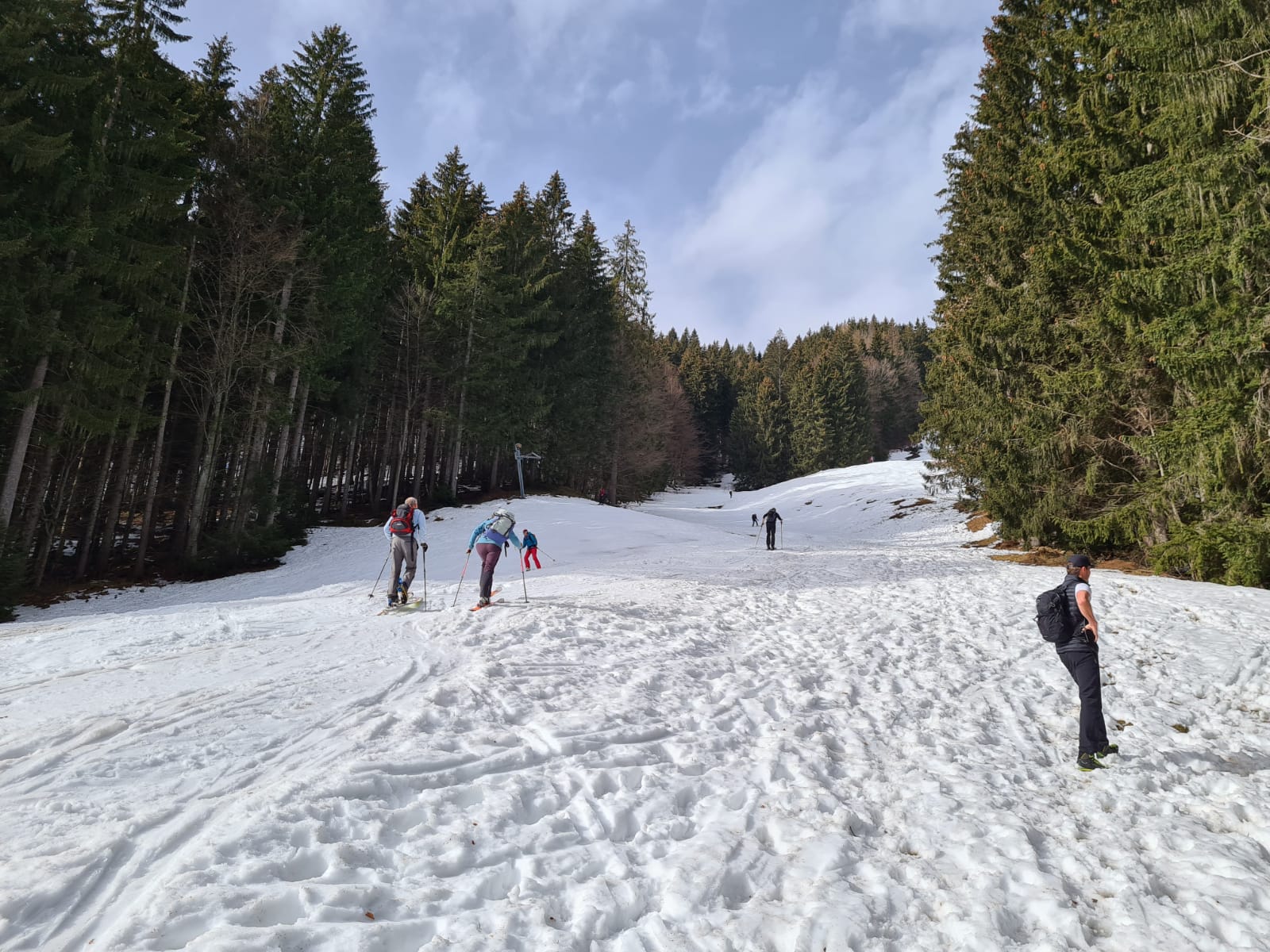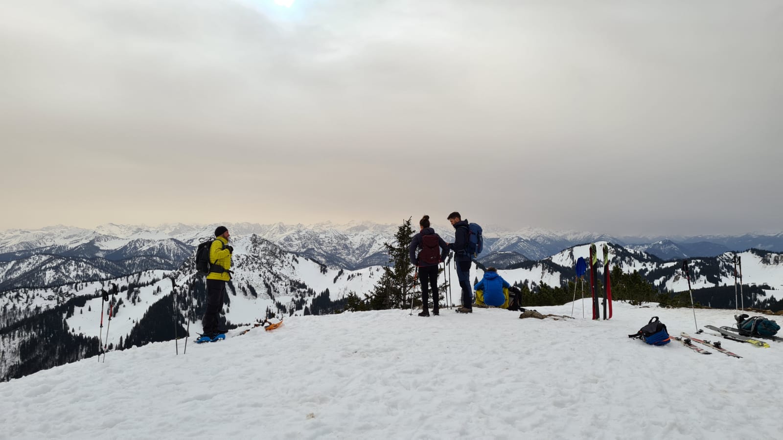 Schönwetterfenster gegen Mittag, am Nachmittag wieder bewölkt mit Saharastaub. Ungewöhnlich milde Temperaturen und das ohne Wind. Ich bin von unten bis oben im T-Shirt gegangen. Schnee ist in allen Abschnitten der Route ausreichend.