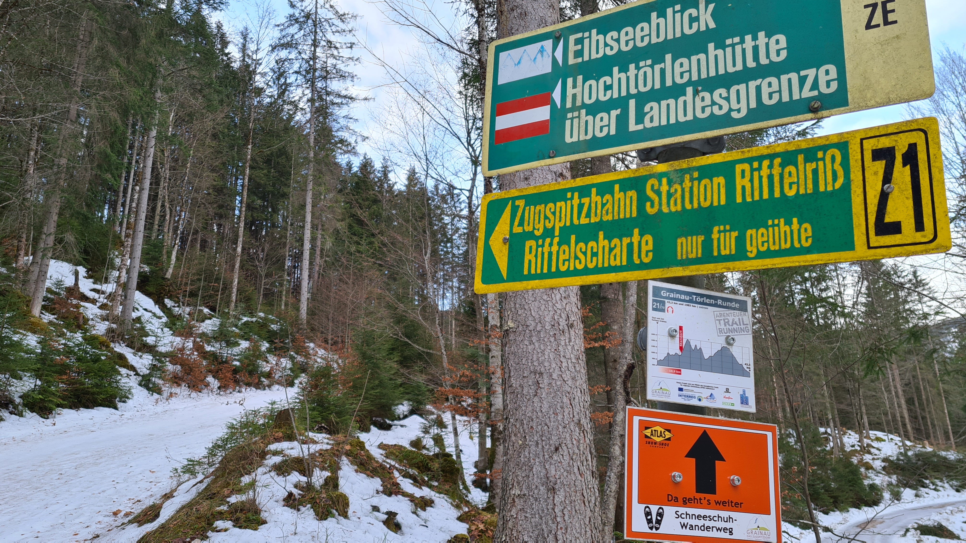 Die Ski kann man direkt neben dem Parkplatz anschnallen. Von unten an genügend Schnee. Alles wie eine gewalzte Piste bis zur Hütte in der Nähe vom Haltepunkt Riffelriss der Zugspitz-Zahnradbahn. Das steilere Stück bis zum Tunnelfenster und weiter bis zum Brotzeitfelsen links oberhalb des Tunnelfensters war etwas lockererer Schnee.