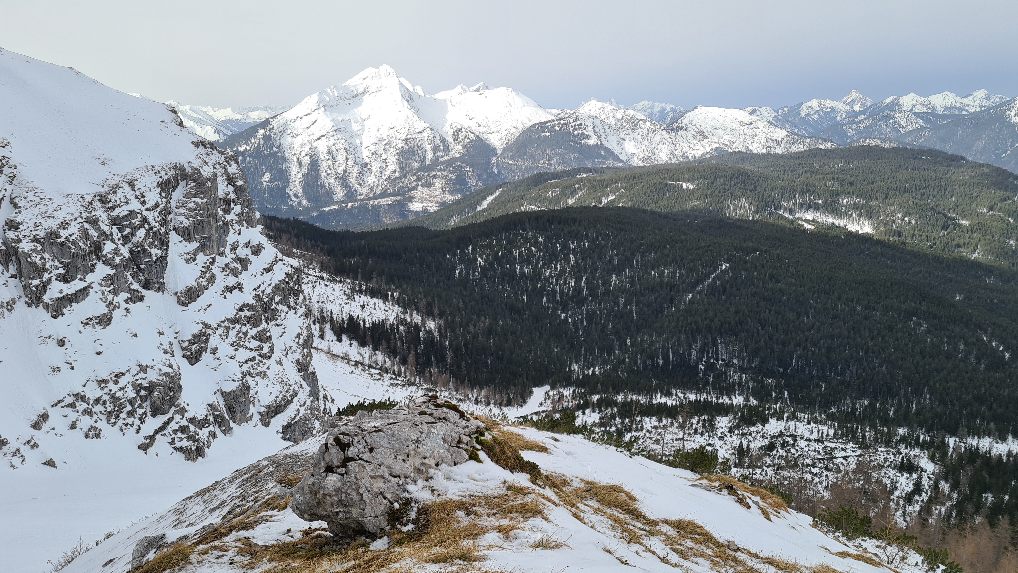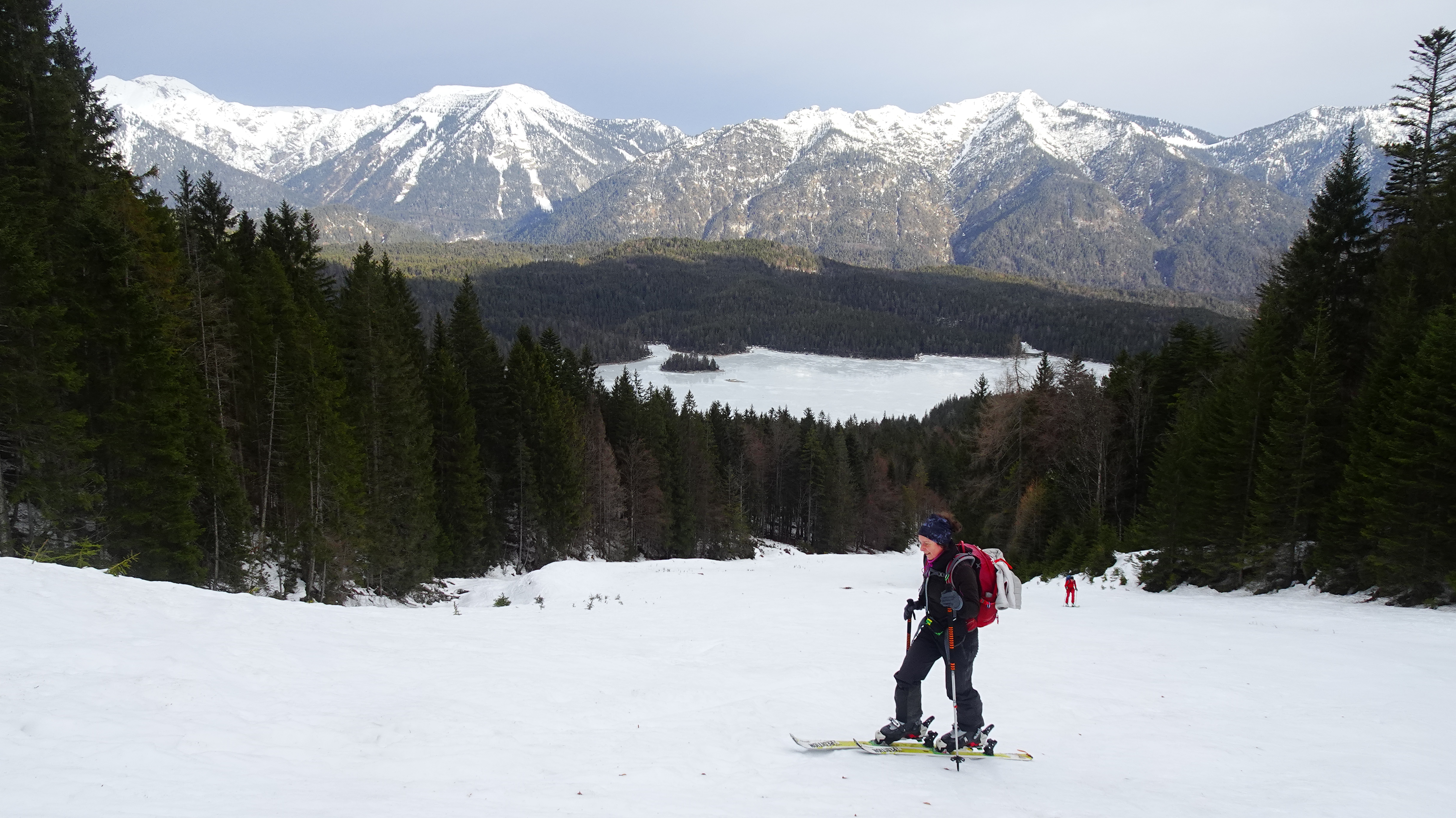 Von oben Blick ins Estergebirge, in die Ammergauer, auf den gefrorenen Eibsee und ins gelobte Land ;-), nach Tirol.