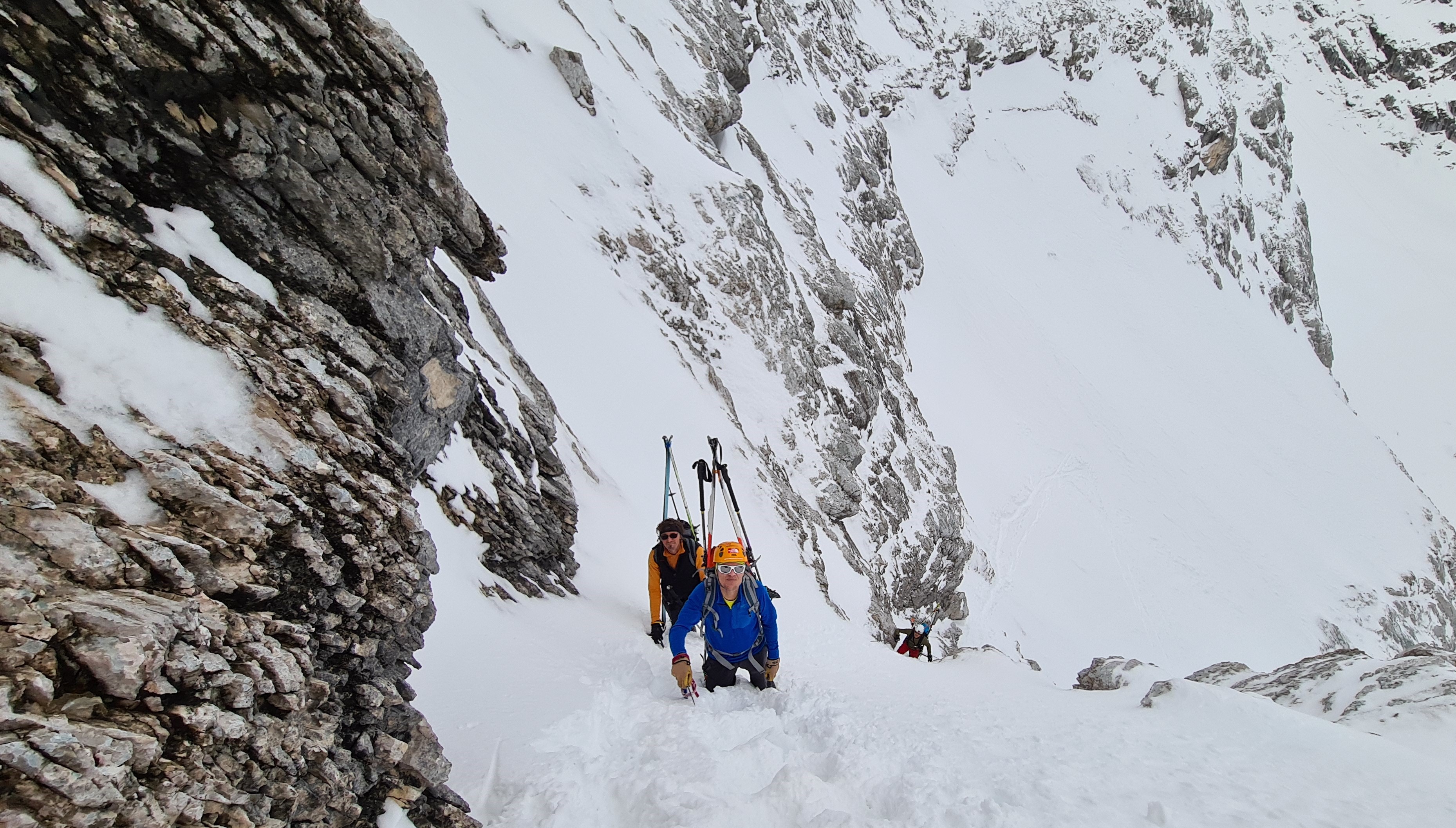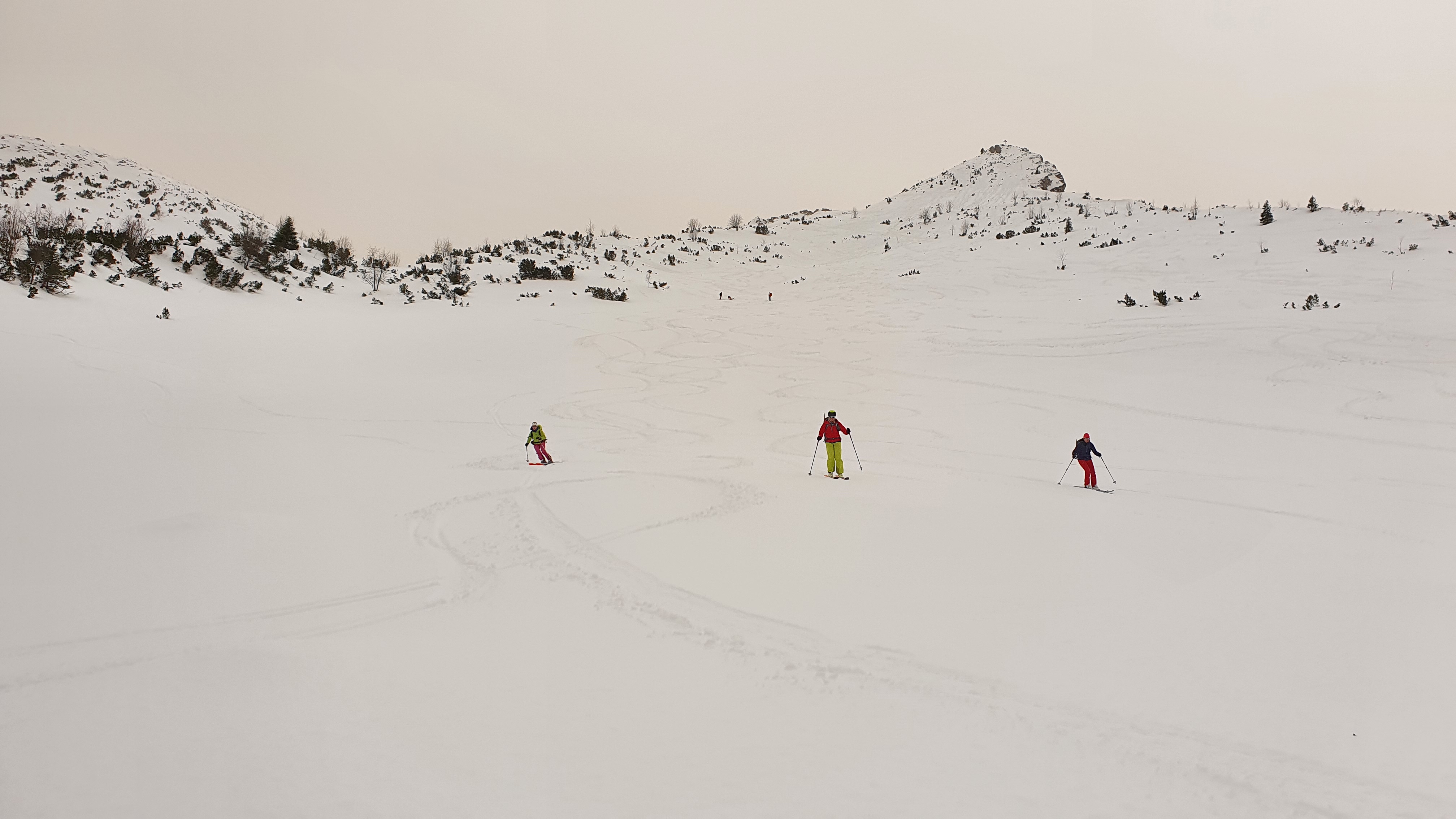 Tourenverhältnisse: Piste in gutem Zustand, oben frisch gewalzt, unten etwas ausgefahren mit wenigen eisigen Stellen. Schöngänge: wir hatten Pickel und Steigeisen dabei, Steigeisen blieben im Rucksack. Abfahrt zur Stuibenhütte gut gesetzter feuchter Tiefschnee, schön zu fahren.