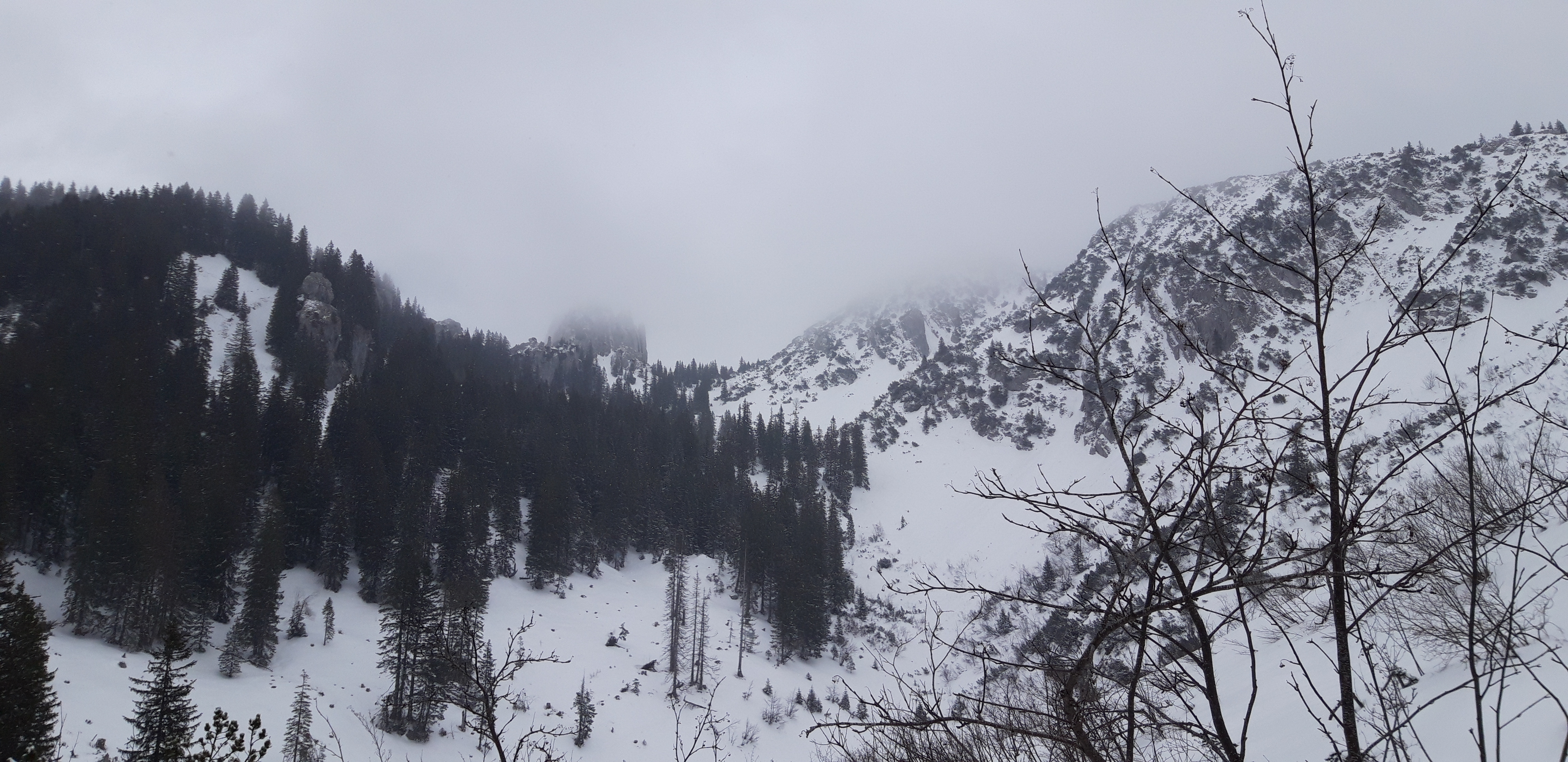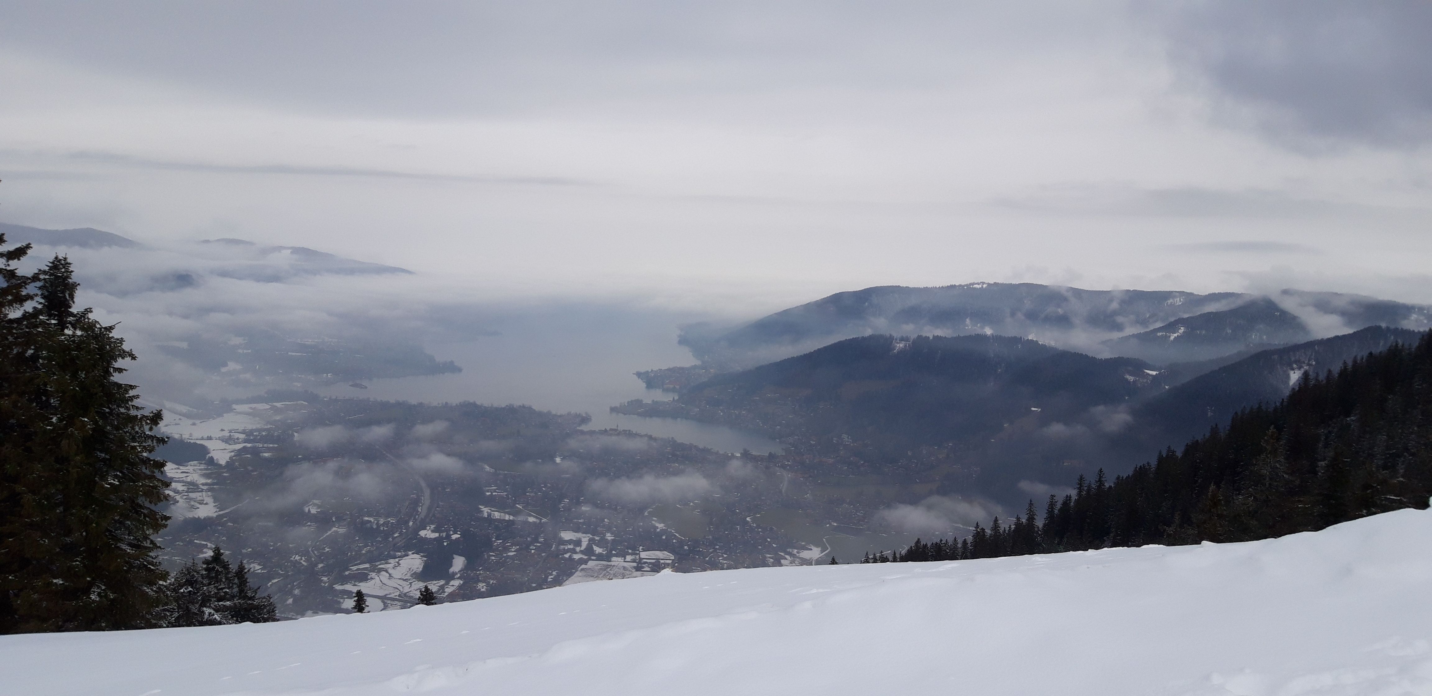 Tourenverhältnisse: Gut. Schnee von unten weg, oben so 10cm Pulver auf harter Unterlage. Die Tour in Kurzform: PP - Wallberg (Skidepot knapp unter dem Gipfel) - Wallberghaus - Setzberg - Rottachalm - Röthensteinalm - Plankensteinsattel - retour. Eigentlich wollte ich natürlich die komplette Reibn mit Abfahrt in den Kessel und Wiederaufstieg zum Riedereck machen, aber als ich am Sattel ankam, hatte es im Kessel schon so eingenebelt, dass man gar nichts gesehen hat; deswegen bin ich auf meinem Aufstiegsweg wieder zur Röthensteinalm zurückgefahren. Die Reibn geht vom Schnee her aber auf jeden Fall - andere hatten sie schon früher am Tag gemacht.