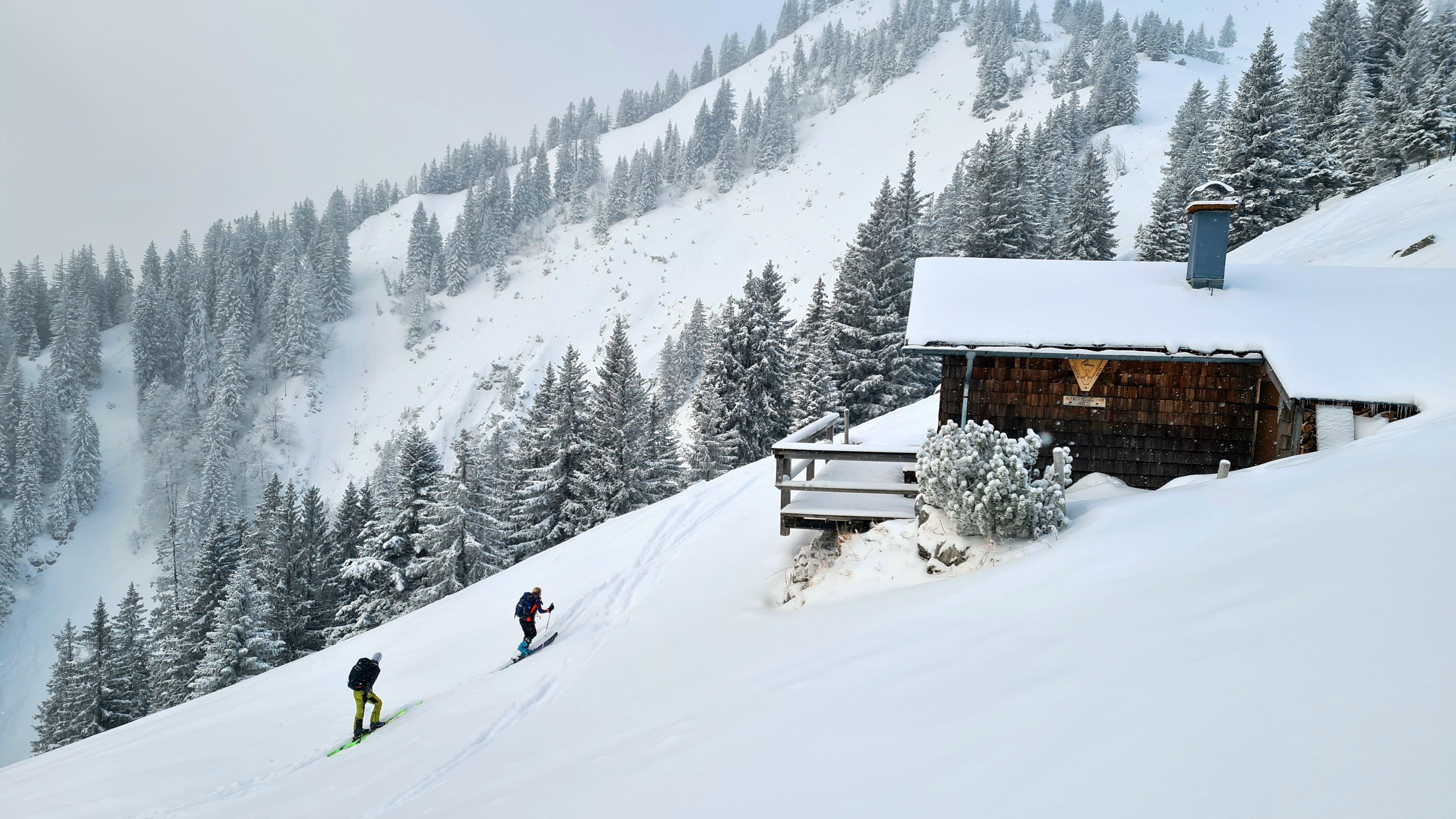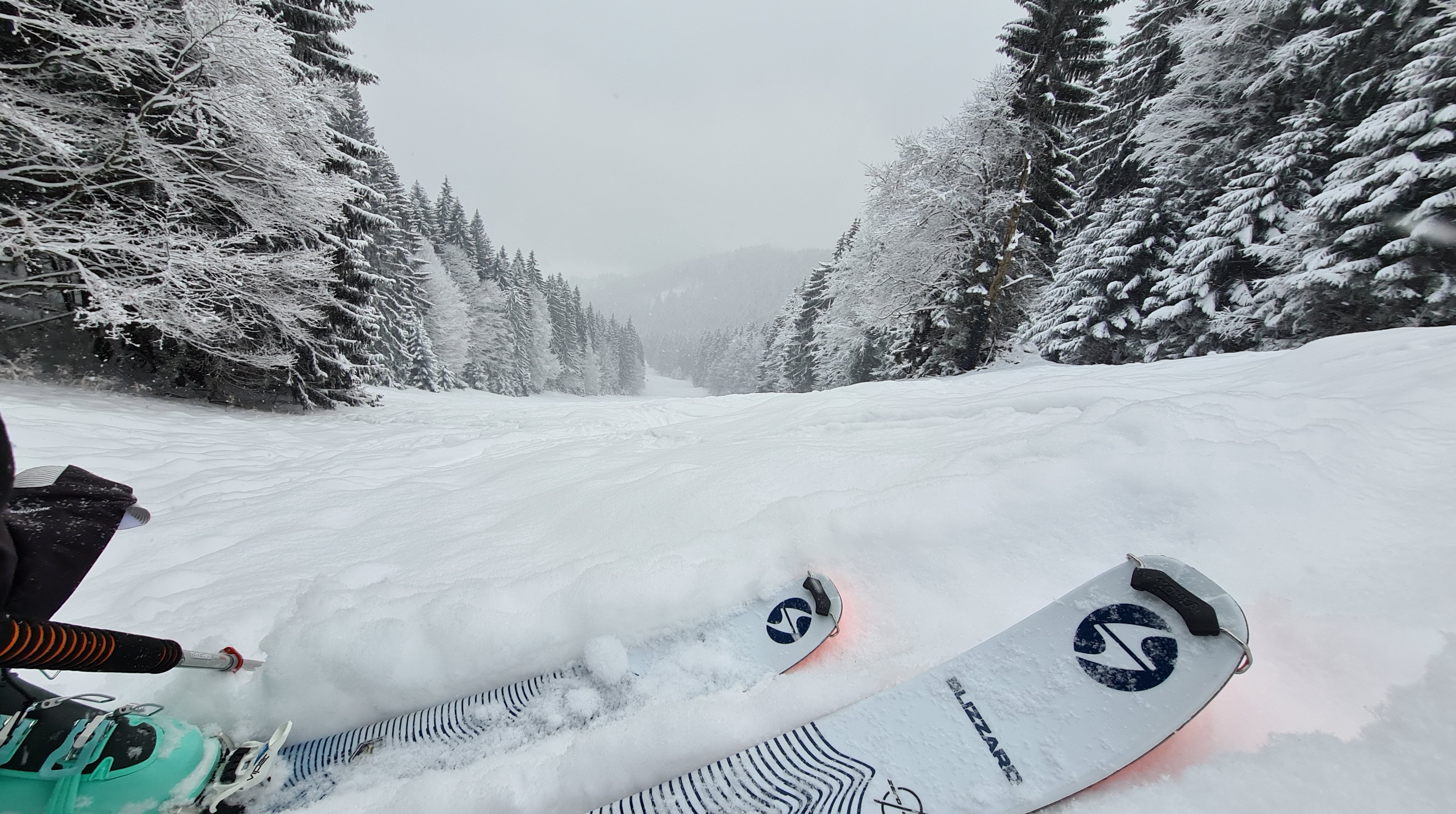 Da der frische Schnee auf den harten und zerfahrenen Harsch gefallen ist, ist die Abfahrt zum größten Teil zwar in tollem Pulver möglich, aber eben auch recht ruppig. Sicher Skifahren sollte man da können. Im oberen Teil der Skipiste viele Buckel, aber gut schneebedeckt und wenig abgefahren.