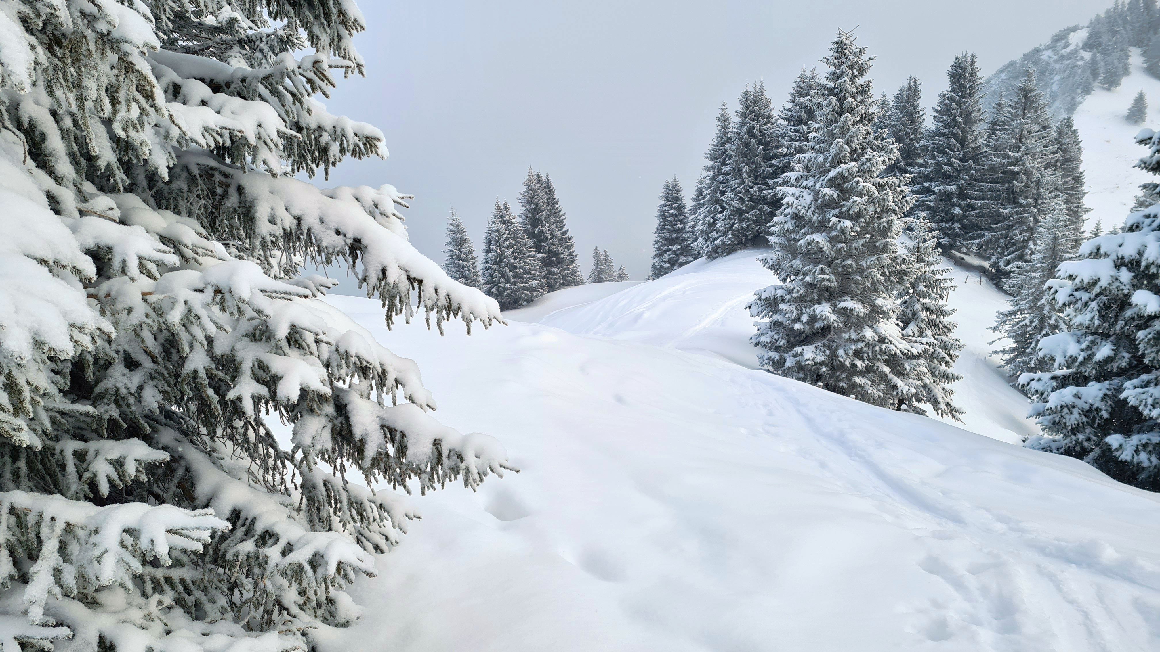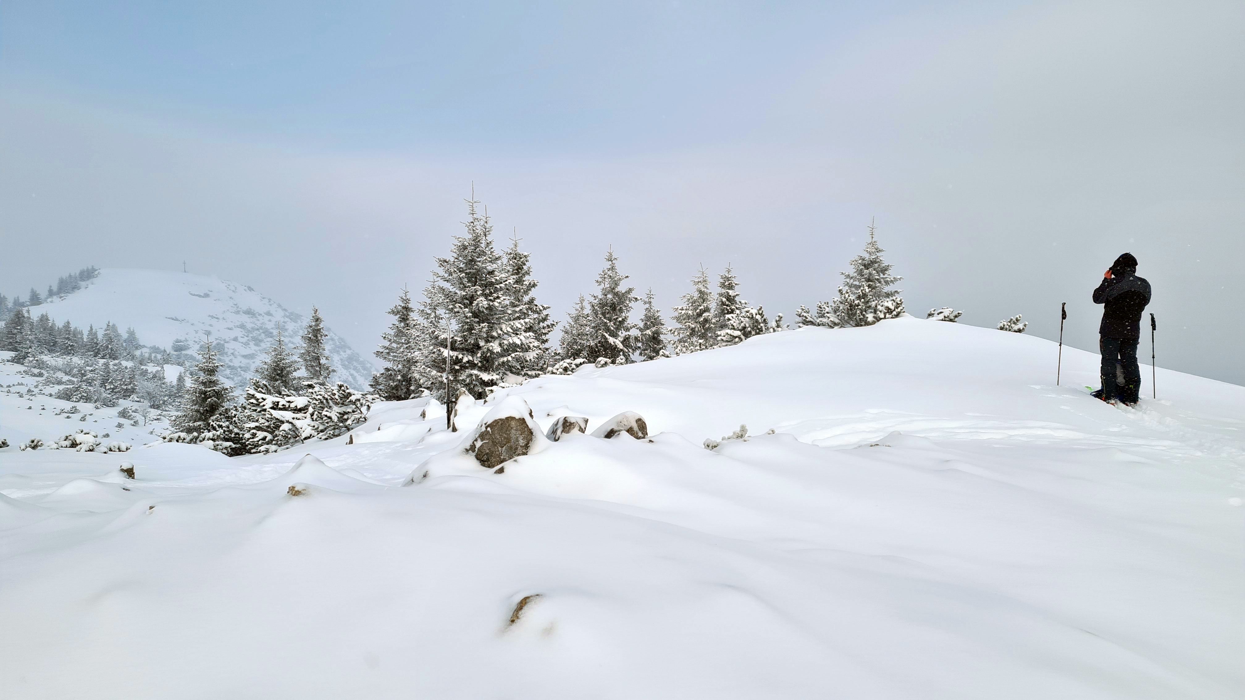 Wir hatten Schneegestöber, keinen Wind und oben sogar kurzzeitig ein Fitzelchen blauen Himmel. Ab Mittag wurde es wohl sonnig.