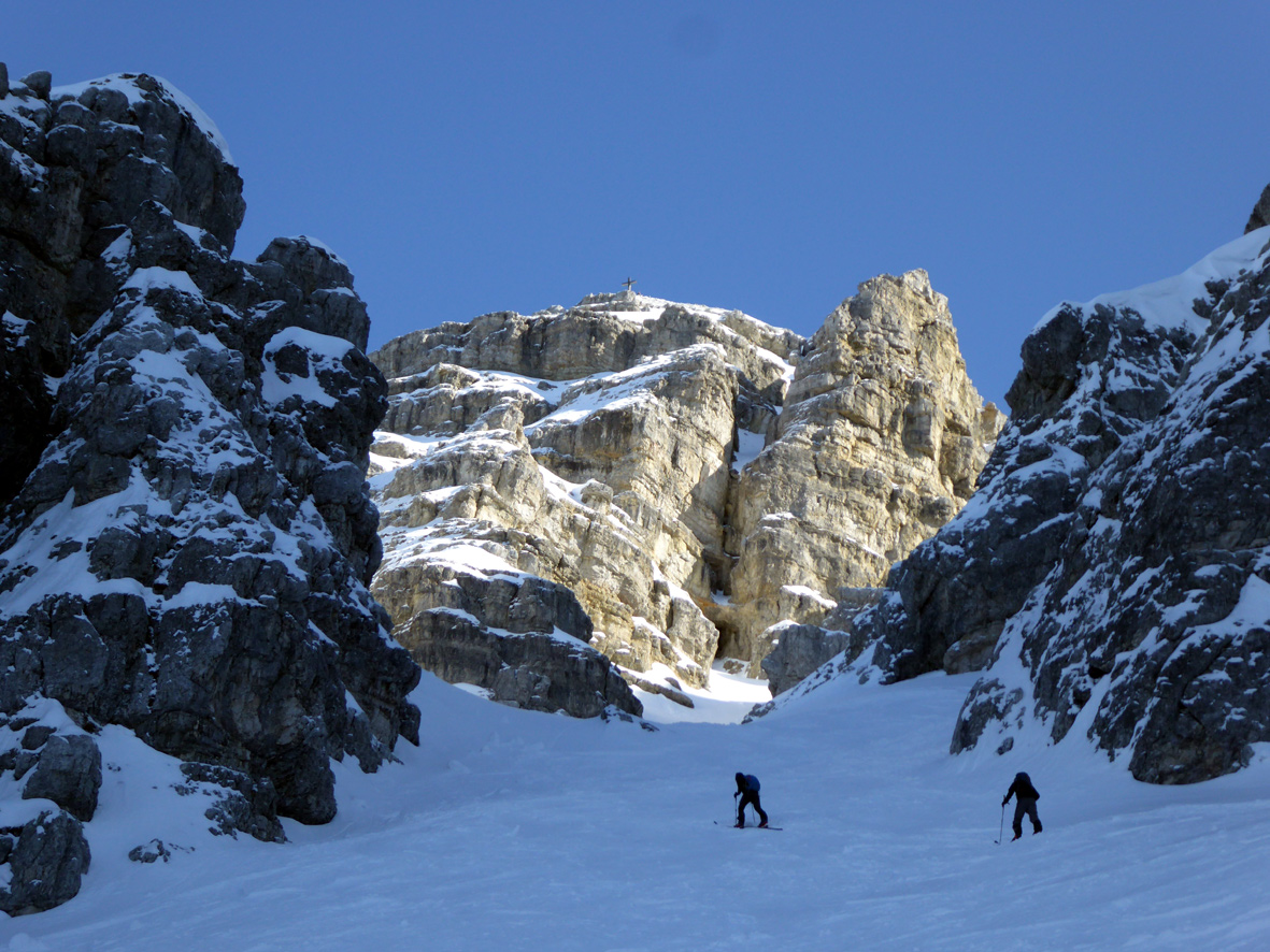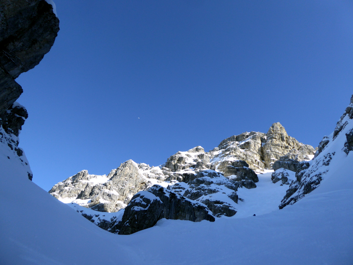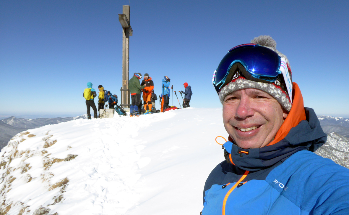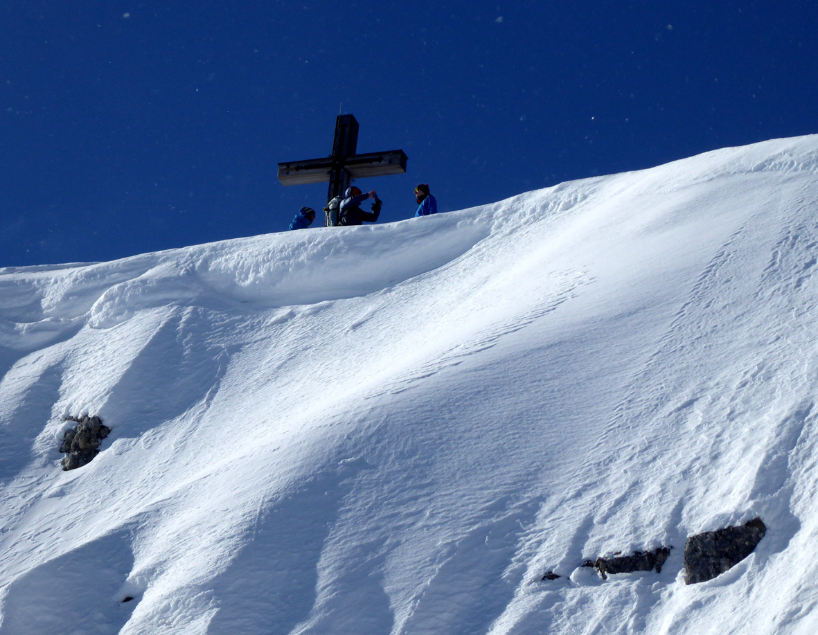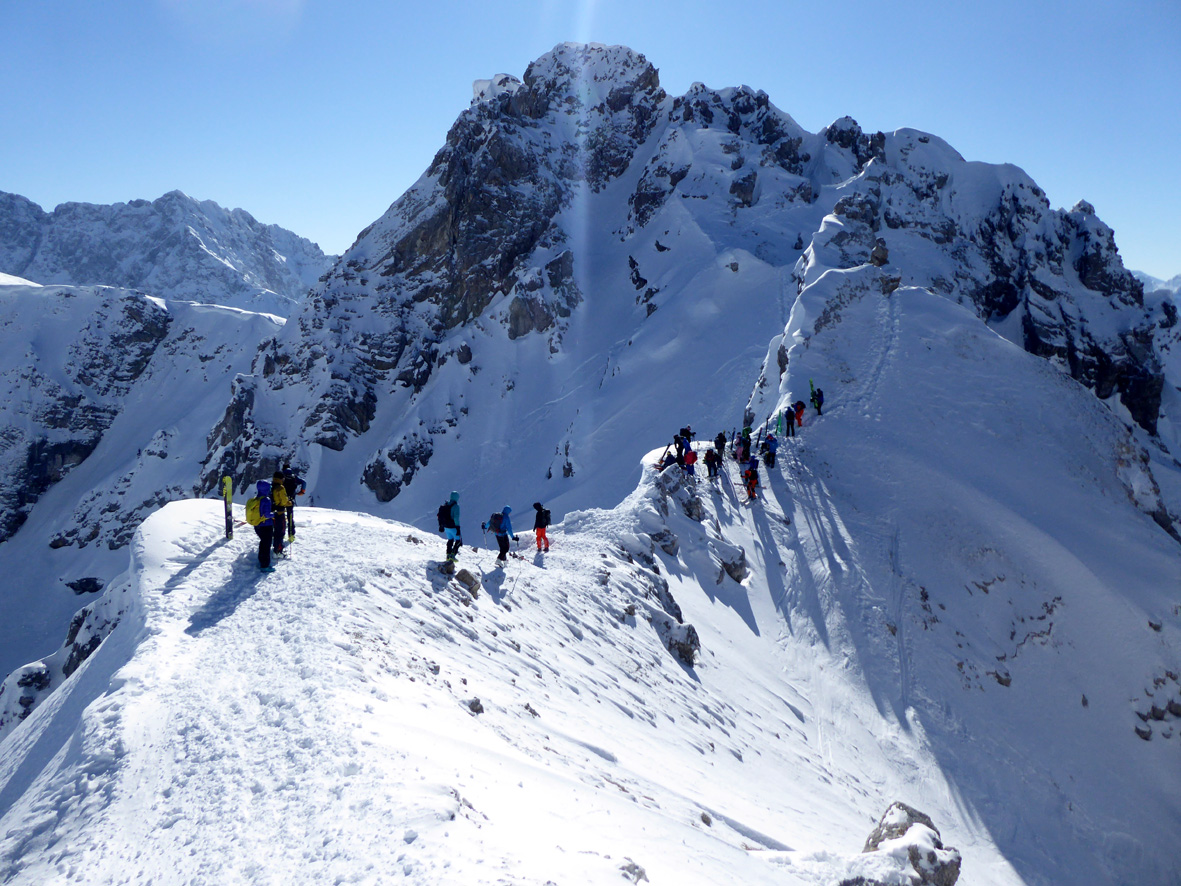 Gefahreneinschätzung: Heute LWS 1-2. Bis zur Scharte keine Lawinengefahr ersichtlich. Die etwas exponierte Querung zum Gipfelkreuz hat eine gute Stapfspur, der finale Steilaufschwung erfordert solides Steigen (Absturzgefahr; manche habe Steigeisen benutzt). Im Schöttelkar ist eine sehr gute Spitzgekhrentechnik Pflicht. In der Abfahrt (steile Variante) hat sich eine Dame am Knie verletzt und musste vom Hubschrauber ausgeflogen werden.