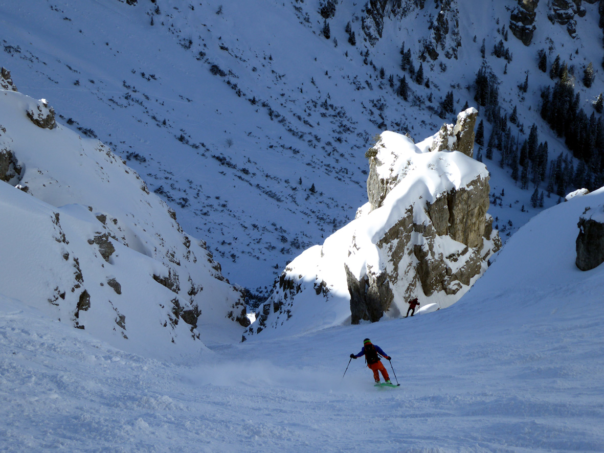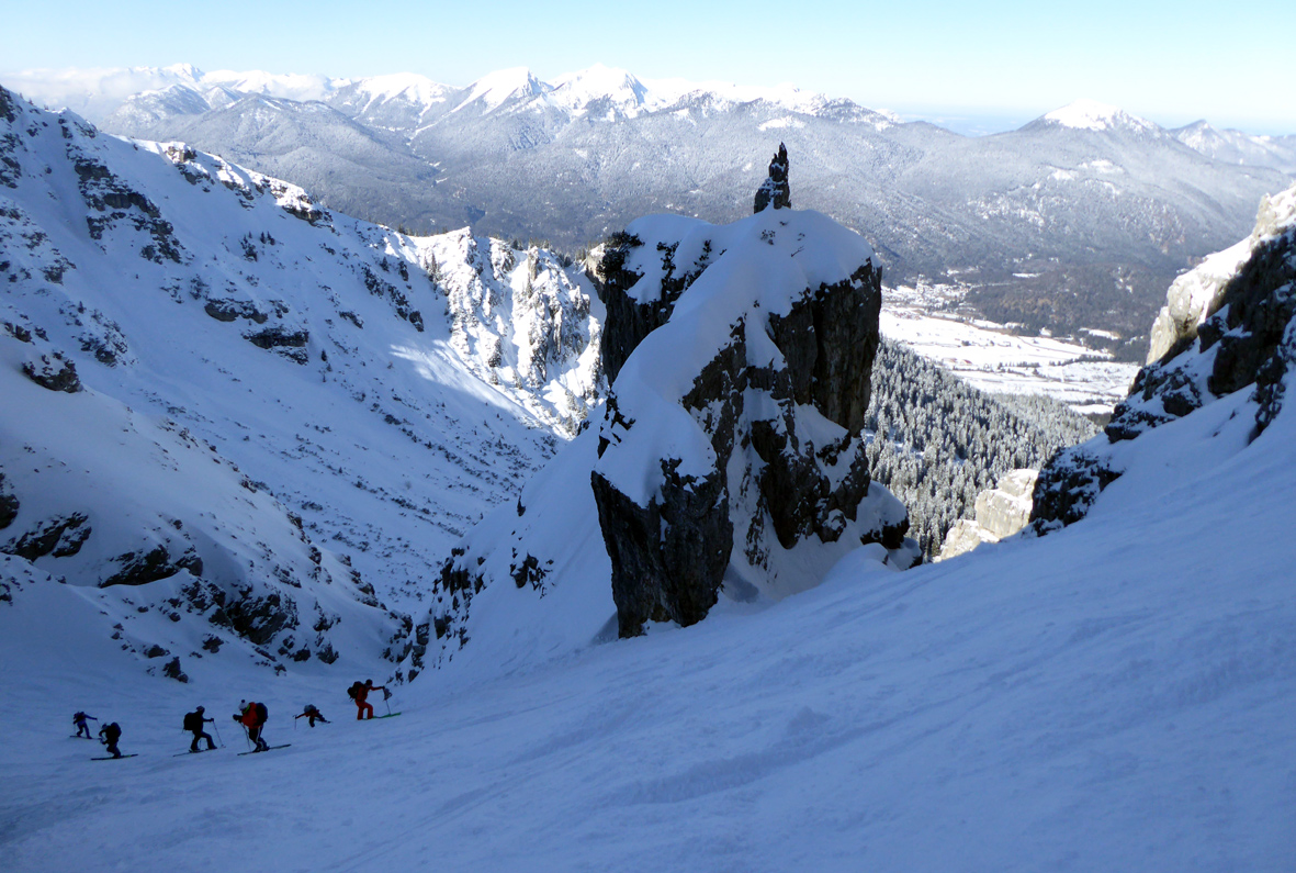 Tourenverhältnisse: Insgesamt gute Verhältnisse! Zunächst auf der Forststraße Richtung Fischbachalm, auf 1080 m (ca. 100 m vor einer Holzbrücke) rechts über den gut eingeschneiten Karrenweg hinauf ins Schöttelkar. Her verzweigen sich die Routen, einige gingen auch Richtung Seins- oder Signalkopf. Links hinauf durch die zunehmend steiler werdene Reiße bis zum Sattel zwischen Schöttelkarspitze und Feldernkreuz. Hier Skidepot und in ca 10 Minuten zu Fuß zum Gipfel - 1250 Höhenmeter. In der Abfahrt beim spektakulären Felstürmchen haben wir die rechte Variante (steil) gewählt - unten kommt man über ein Bachtal zu einer Brücke und über die Forststraße zurück nach Krün. Es waren heute schätzungsweise 100 Leute unterwegs, hat sich aber alles gut verteilt. Auch die steile Variante zum Soiernsee wurde gemacht (sowohl in Aufstieg als auch in der Abfahrt). Gute Pulverschneeunterlage auf hart-griffigem Untergrund. Ob man Harscheisen benutzt (ich hab's getan) oder nicht, ist im steilen Schlussanstieg individuelle Gefühlsfrage. Schnee insgesamt griffig, unten im Bachtal ein paar versteckte Steinchen, Forststraße wie Skipiste. Achtung am Schluss bei Häuserl/Schranke, da lauert Stein-Konfetti auf breiter Front, rechtzeitig abbremsen und abschnallen.