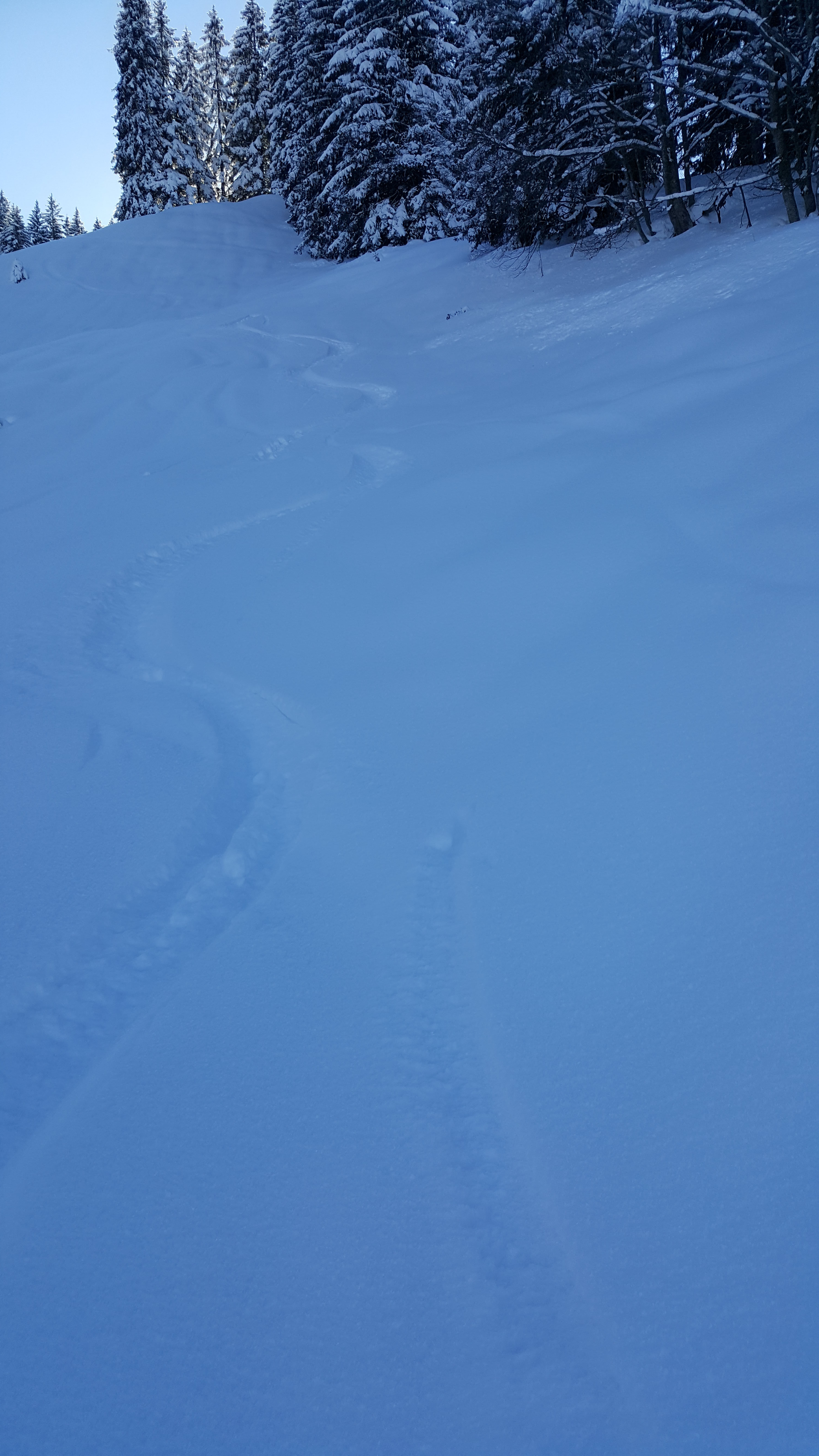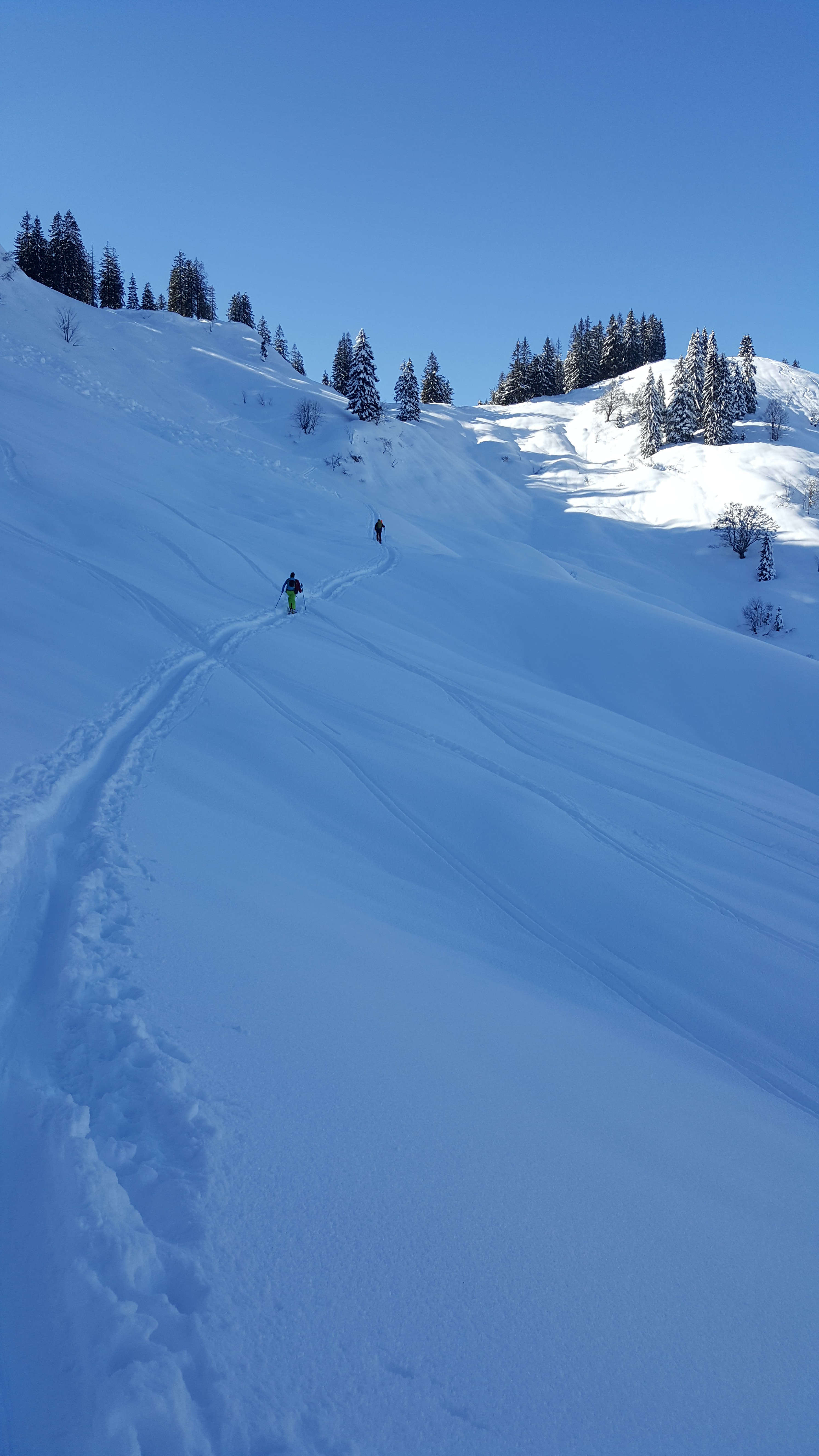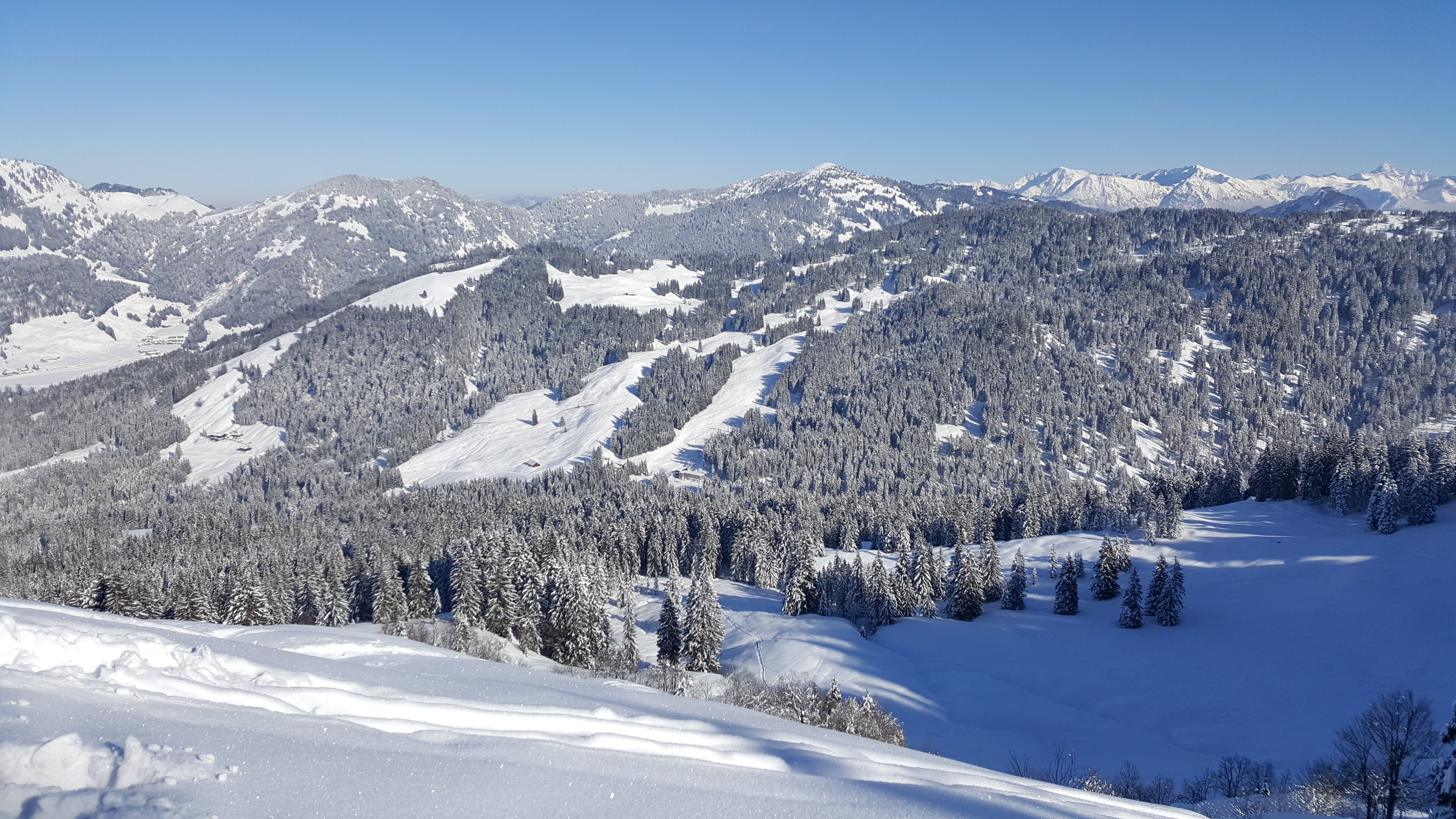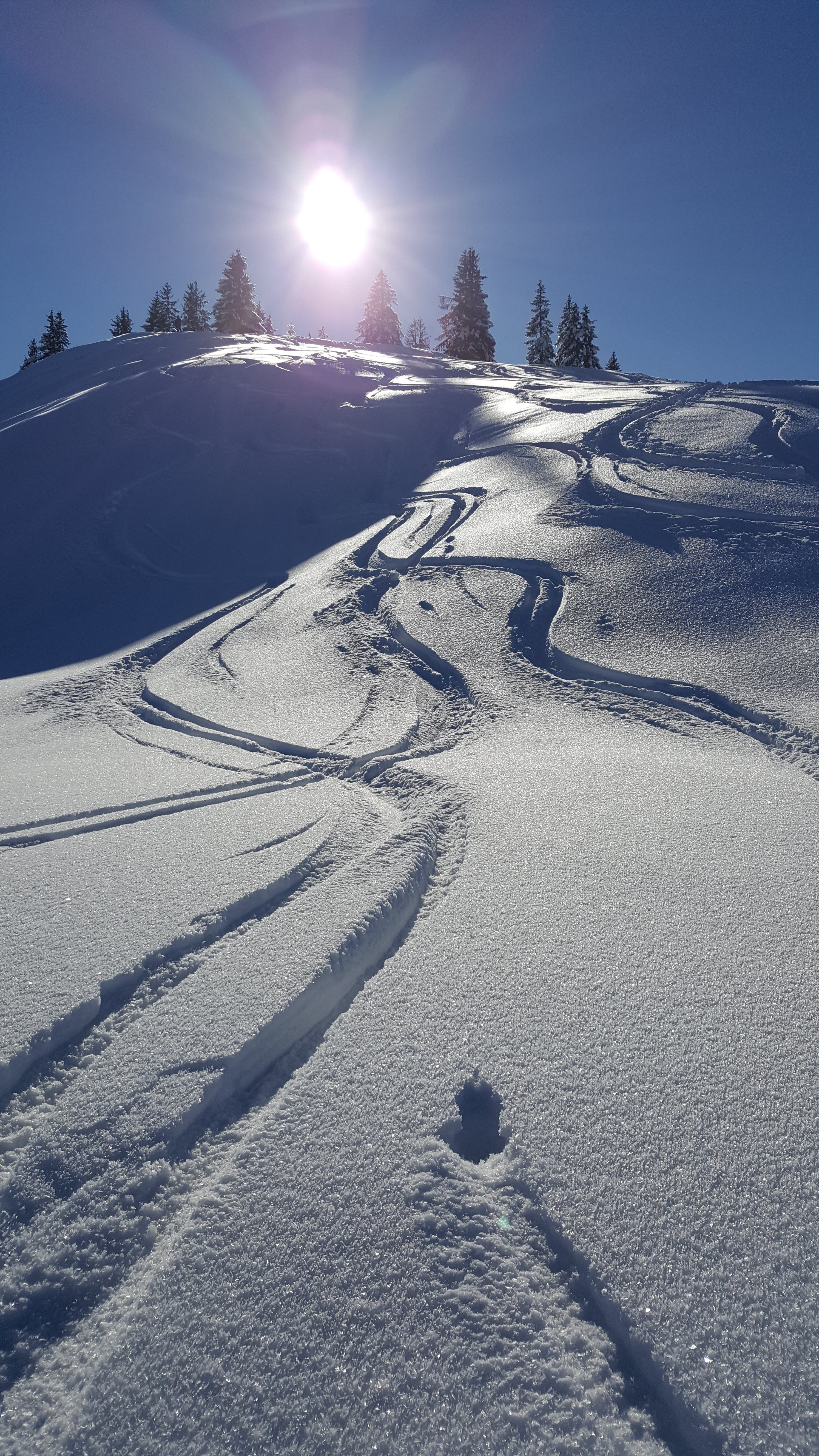 Abfahrt vom Gipfel nach Norden über die weiten Hänge mit Pulver satt runter bis zum Gschwendlift. Von hier ca. 500m auf der Loipe zurückschieben bis zum Parkplatz. Eine tolle Rundtour, sehr empfehlenswert!