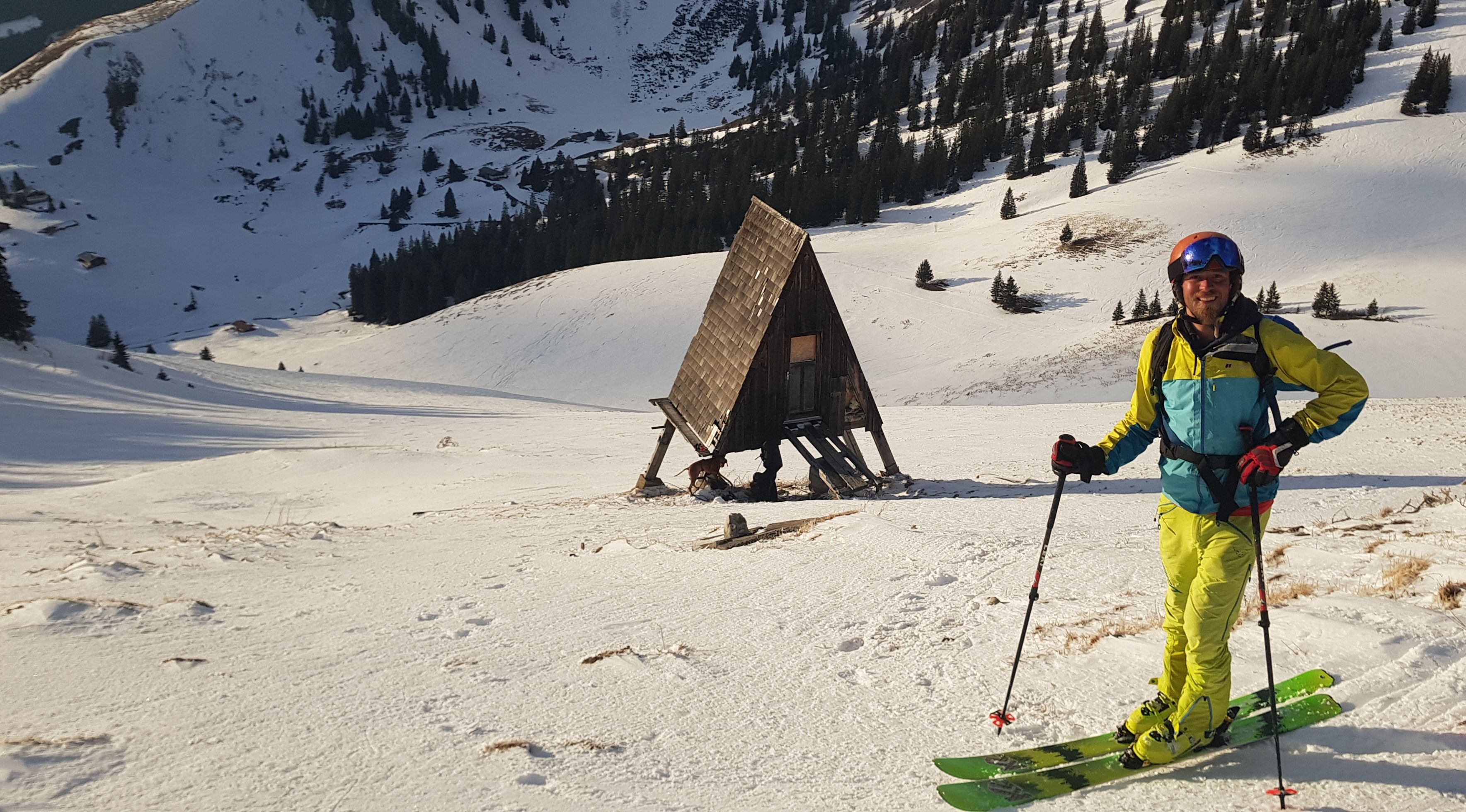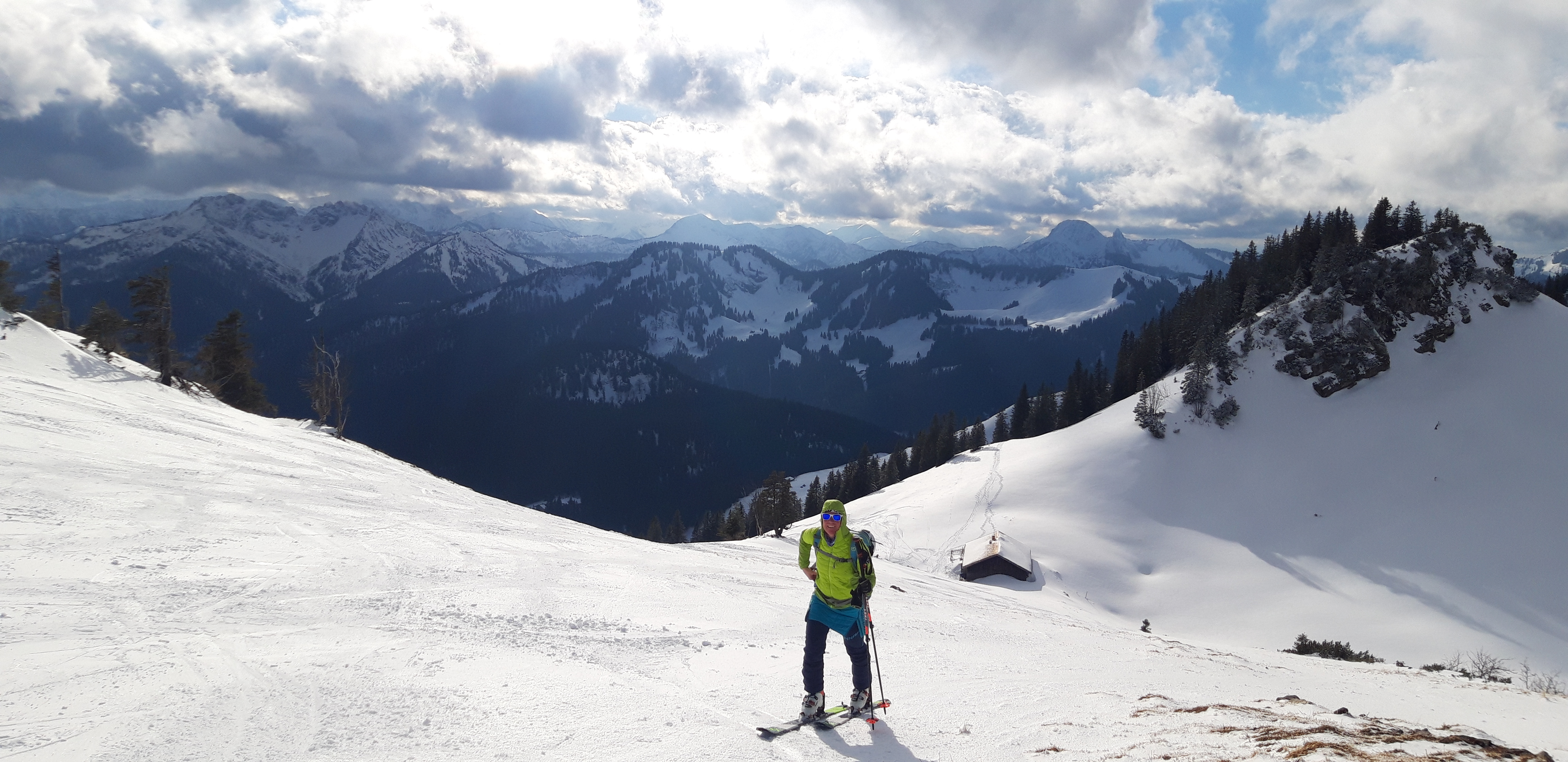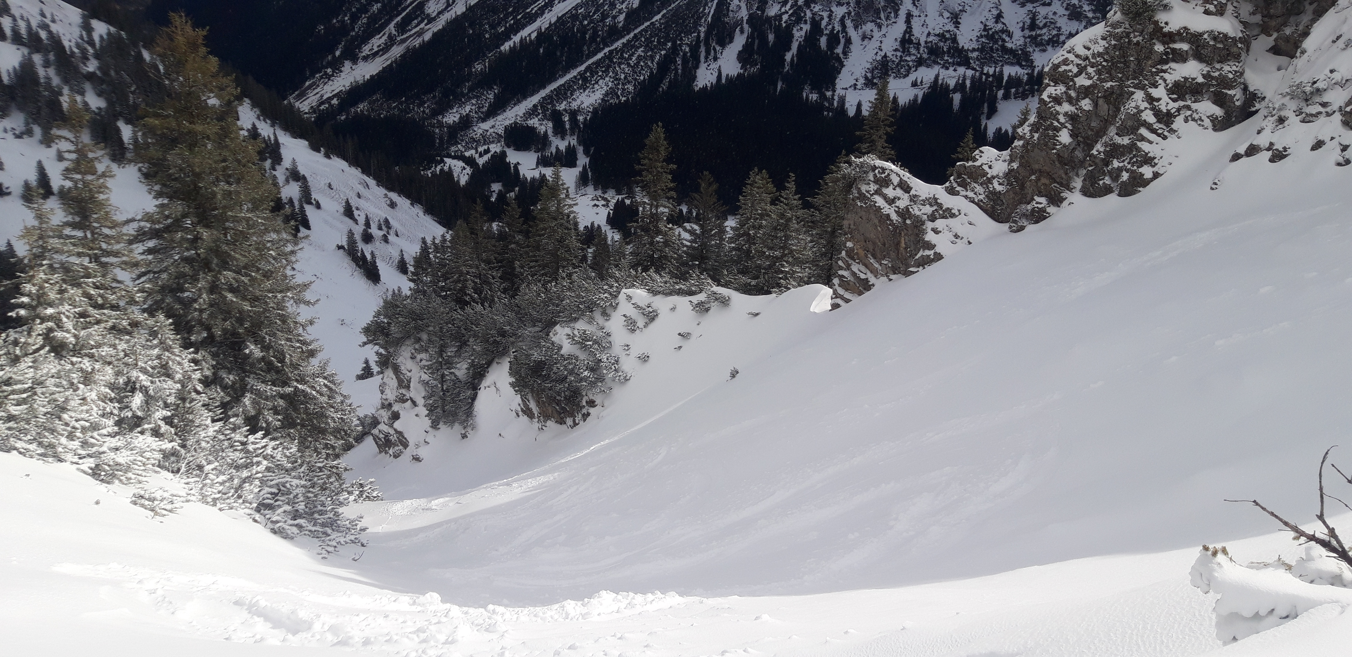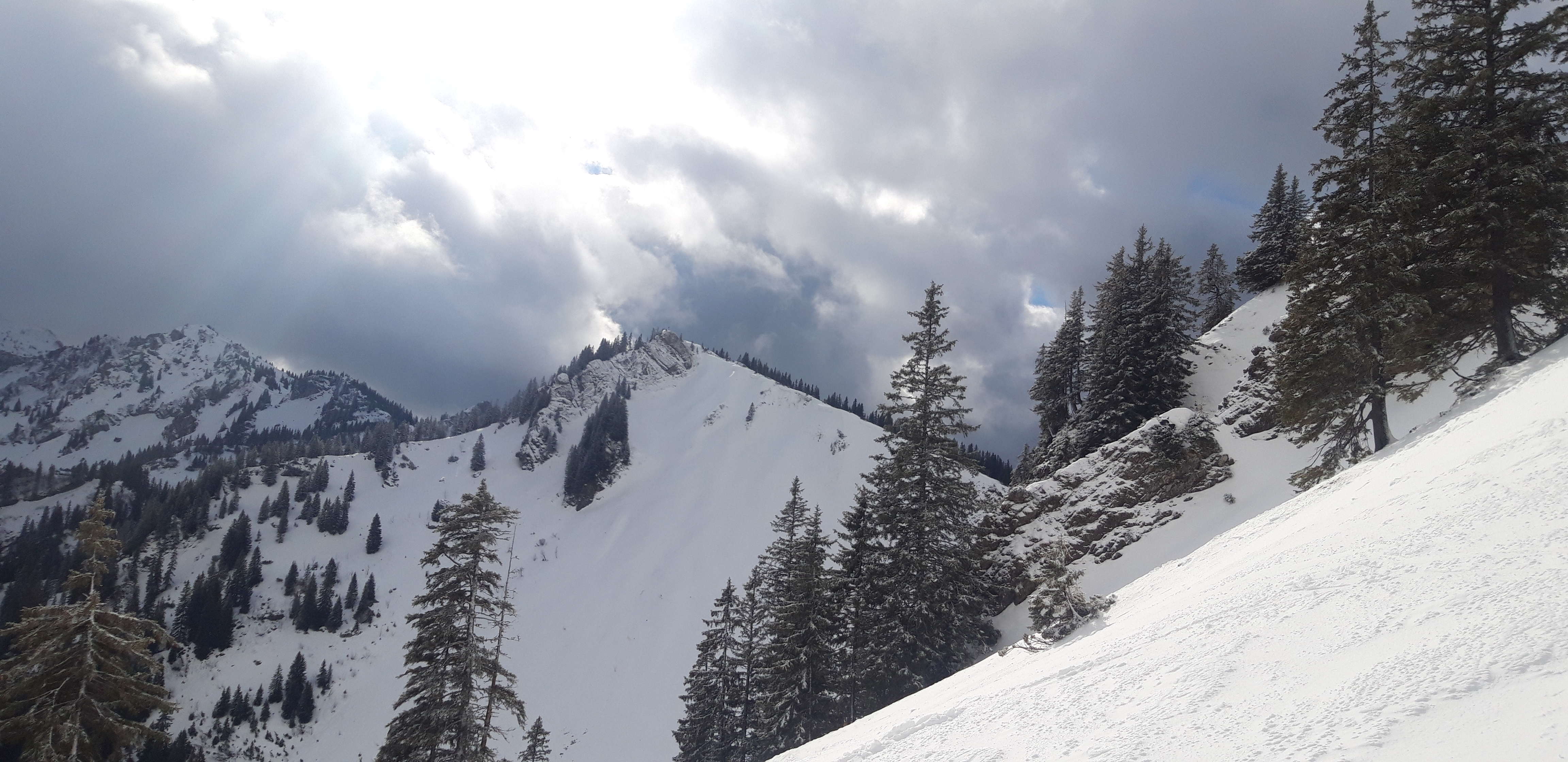 Tourenverhältnisse: Speziell. Interessante und kleinräumig sehr unterschiedliche Schneebeschaffenheit, die sich im Laufe des Tages auch ständig verändert hat (Ich bin die Runde zwei Mal gegangen). Zur Erklärung: Es hat gestern früh erst ein paar Zentimeter geschneit, gegen Mittag hat es dann eine halbe Stunde bis weit hinauf (sicher bis gegen 1800 Meter) leicht geregnet, was zu fürchterlichem Bremsschnee geführt hat (Ich war gestern Nachmittag auf der Brecherspitze - bergauf bin ich ohne eine einzige Kurve gerade hinaufgegangen, weil der Schnee so pappig war...) Heute Nacht oder am Morgen hat es dann ab etwa 1300 Metern ein paar Millimeter "geschneit", wodurch eine leicht angefrorene Reif/Harschschicht entstanden ist. Mit zunehmender Erwärmung wurde daraus im Schatten so etwas wie mehliger Pulver, in der Sonne aber irgendwas Firnartiges. Dies war aber nur in West- und Südexpositionen so, während man in Ost und Nordlagen wiederum entweder etwas Pulver (Tanzeck-Rinne) oder Windharsch (Taubenstein-Mulde) finden konnte...