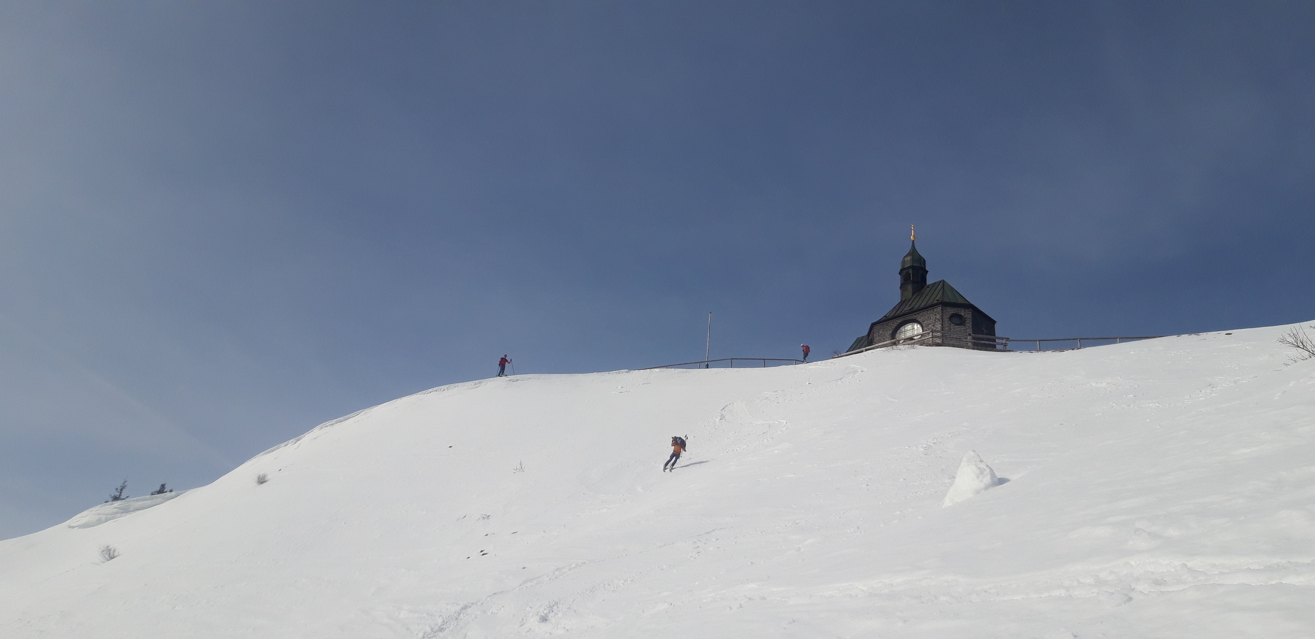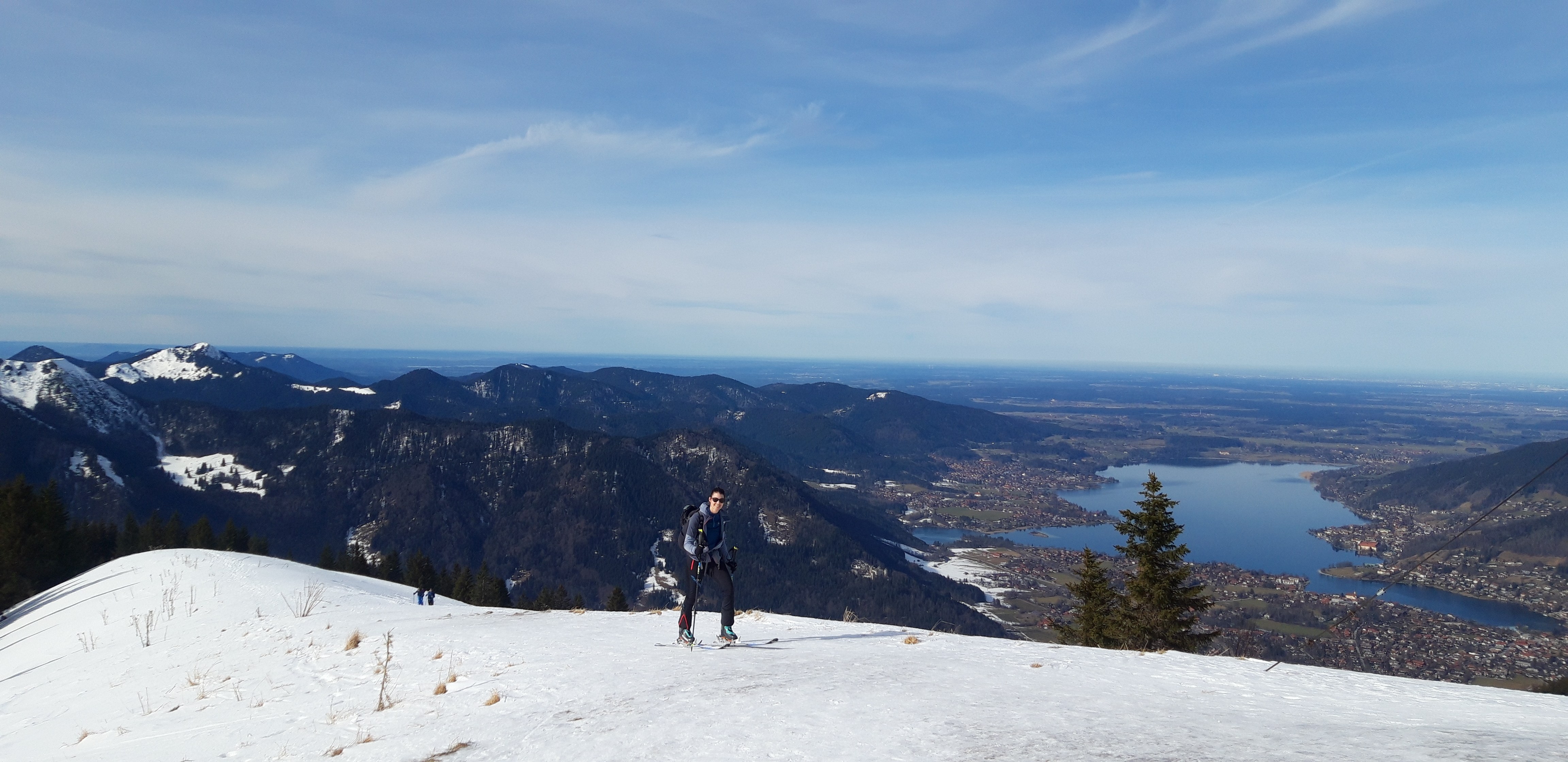 Tourenverhältnisse: Gut! Frühjahrsverhältnisse. Wir sind heute zuerst auf den Wallberg, vom Kircherl den schönen Osthang runter (zwischen 11 und 12 Uhr perfekter Firn) und dann hoch zum Setzberg. In der Nord-Abfahrt etwa 5cm Pulver auf recht ruppigem Untergrund - aber schön zu fahren. Meine Begleiter sind danach wieder zum PP und ich allein weiter zum Röthenstein. Für den Aufstieg bin ich fast bis zum Plankensteinsattel und dann links den steilen Hang hoch, Abfahrt über den Westhang zu den Röthensteinalmen - oben etwas Pulver, dann harter Deckel - toll! Harscheisen waren heute nicht nötig (beim Setzberg-Aufstieg aber hilfreich); der Steilhang zum Röthenstein war (gegen 15 Uhr) schon recht weich und ging daher ohne. Gerade wenn man früh unterwegs ist, sollte man die Eisen aber dabei haben, denn wenn die Sonne wieder weg war, hat es gleich spürbar angezogen.