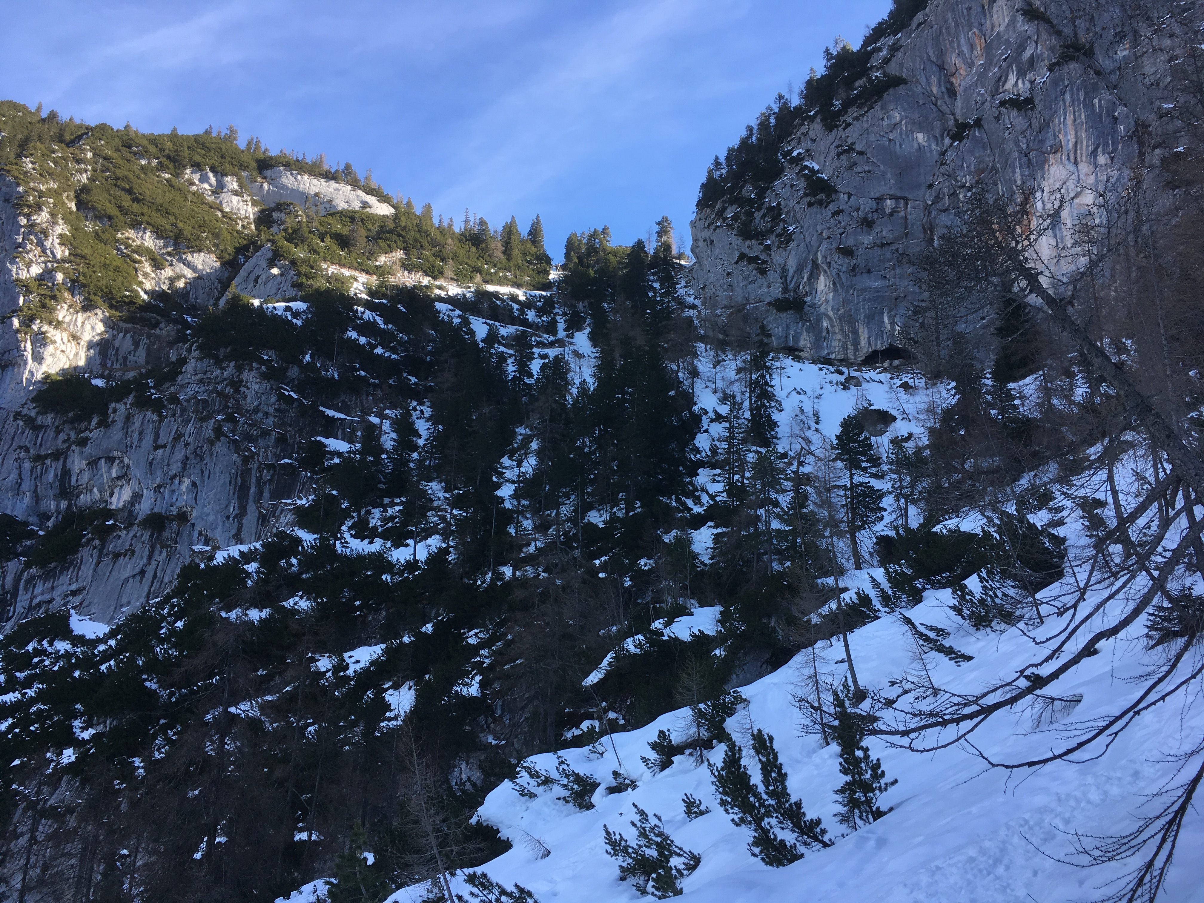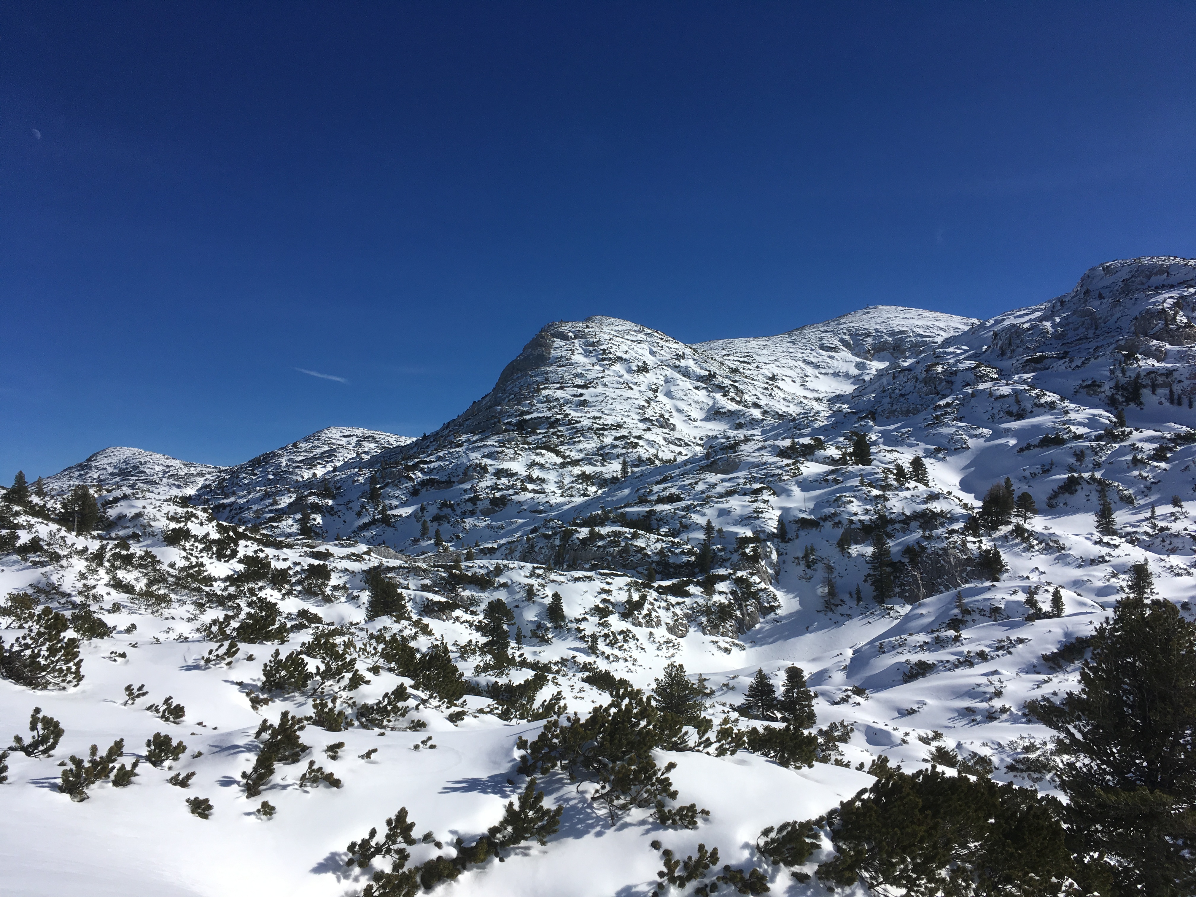 Gefahreneinschätzung: es handelt sich um eine durchaus anspruchsvolle Abfahrt, dementsprechend die (abstrakten) Risiken: Absturz in den Steilpassagen, Sturz auf Grund ungenügend eingeschneiter Steine / Latschen, bei schlechter Sicht (heute natürlich nicht) ist die Orientierung auf der Reiter Alm auch schnell schwierig